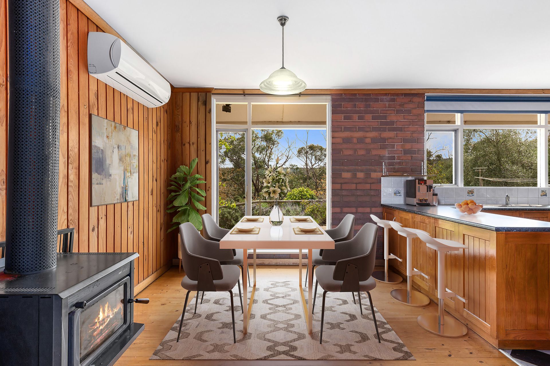 * Heating & cooling via open fireplace, wood heater and reverse split system cycle air-conditioner.