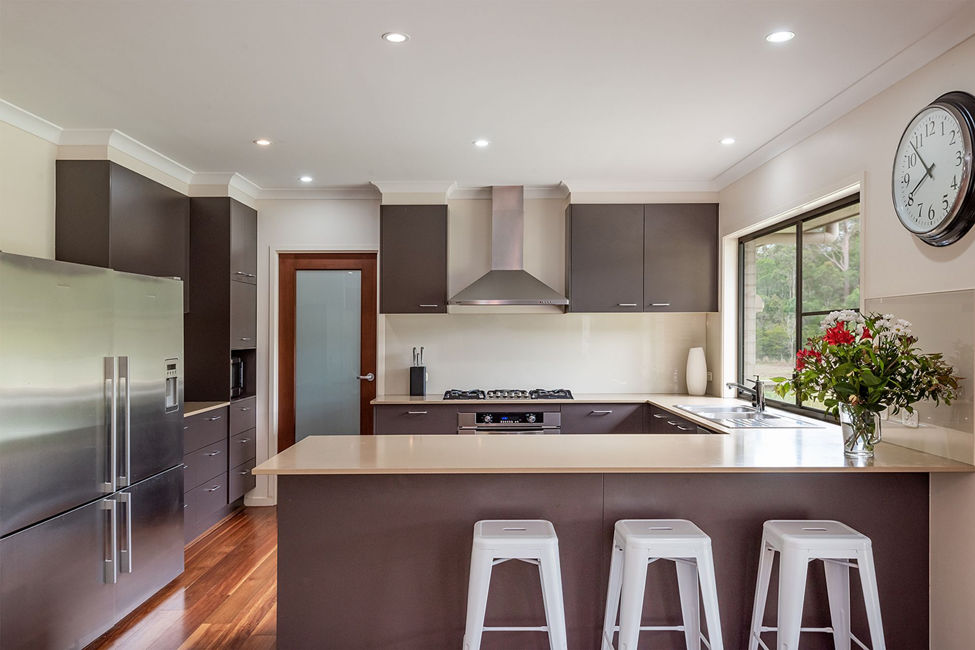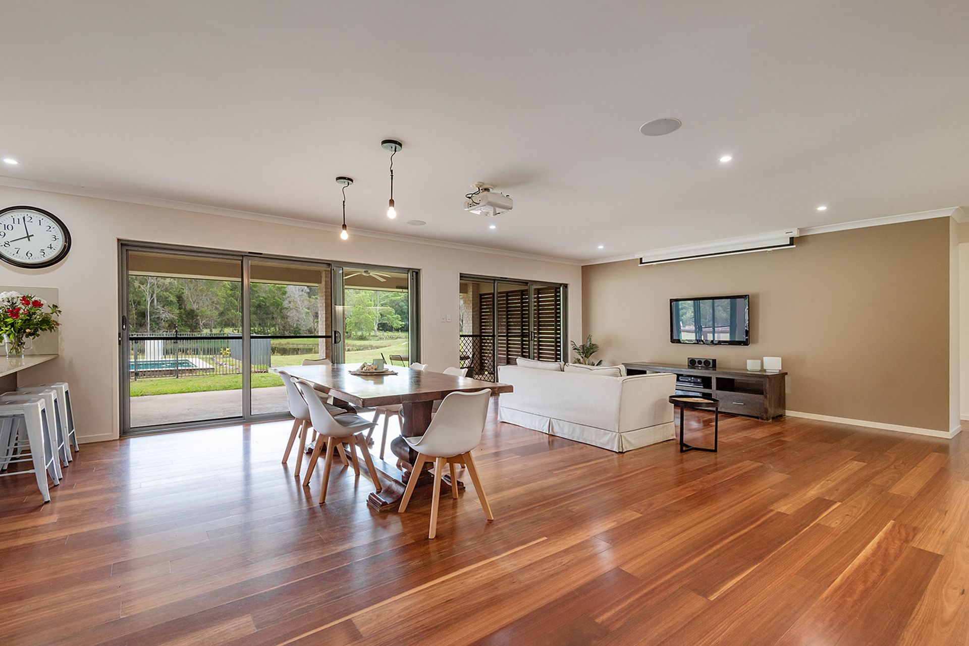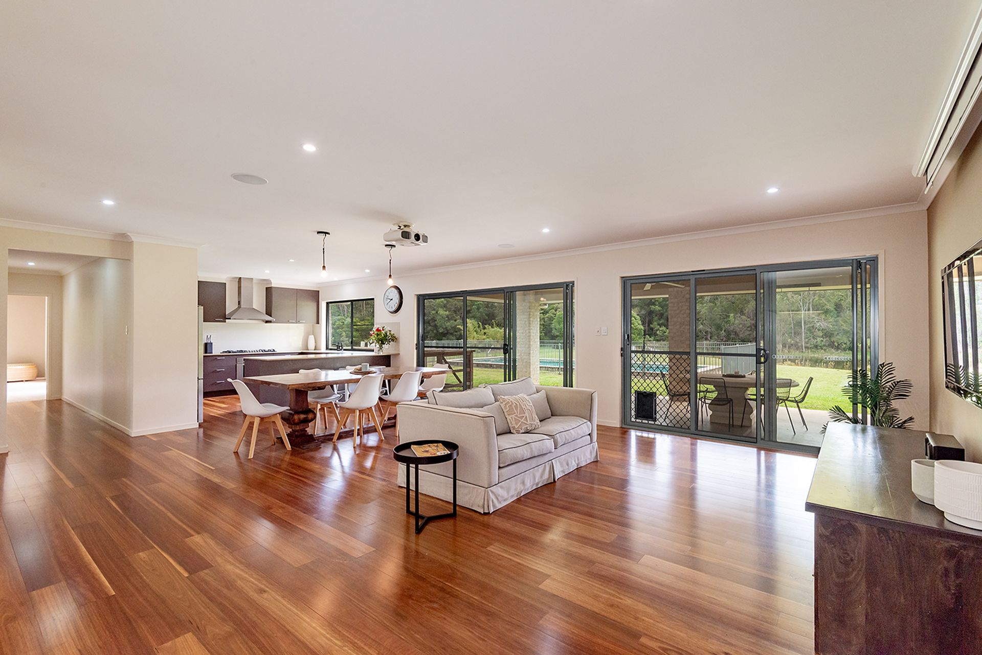 How rare to find a 2 hectare (5 acre) property that is situated within walking distance to the thriving town of Cooroy, yet with that feeling of peace and privacy. Set well back from the road is the spacious modern residence featuring five good size bedrooms, high ceilings, and timber floors in the open plan living area. This home caters for all the family with a dedicated lounge/media room, home office, and huge covered outdoor entertaining area. The fabulous kitchen is at the heart of the home with a superb outlook over the land and to the sparkling salt water in ground pool. There's gas/electric cooking, Caesarstone breakfast island bar, and a splendid walk in pantry. Great for family and friends gathering together, the living area also includes a projector and screen plus surround sound is already in place.