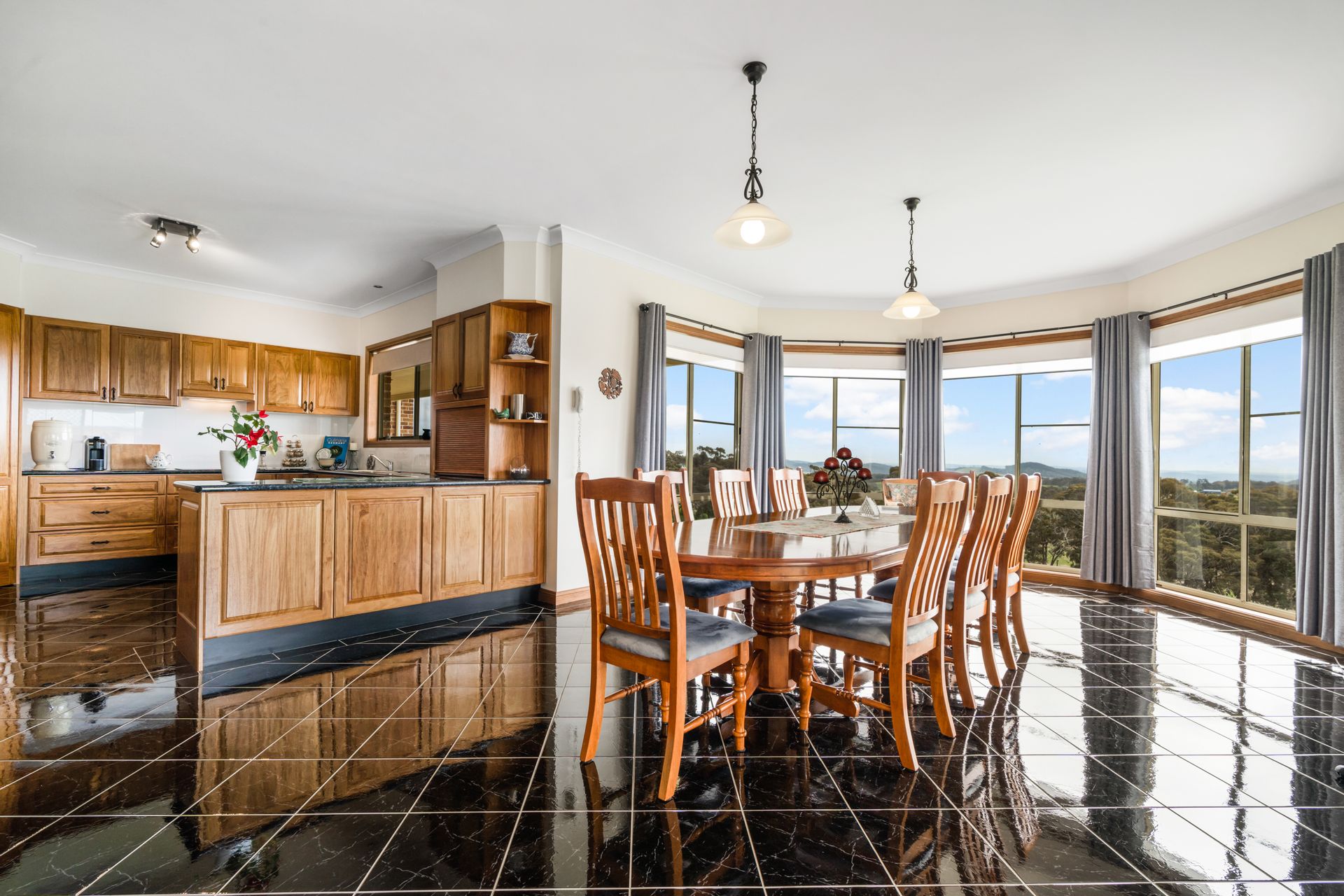 • Open plan living with tiled kitchen, dining, and family area taking in the expansive view