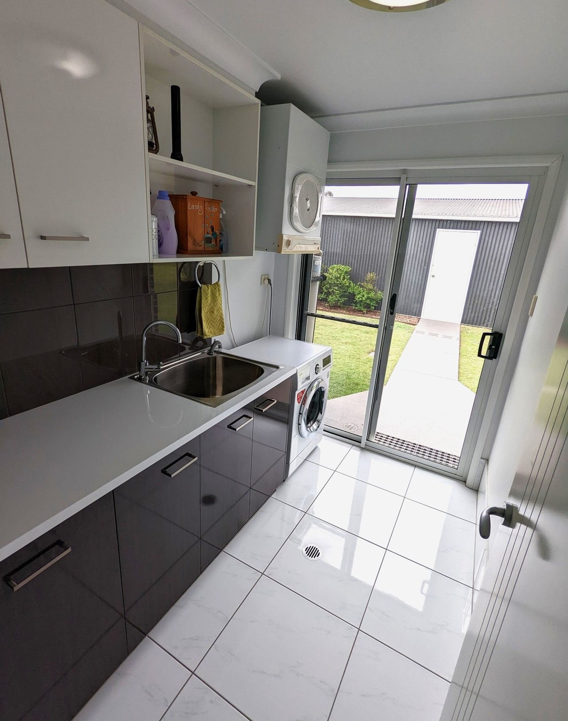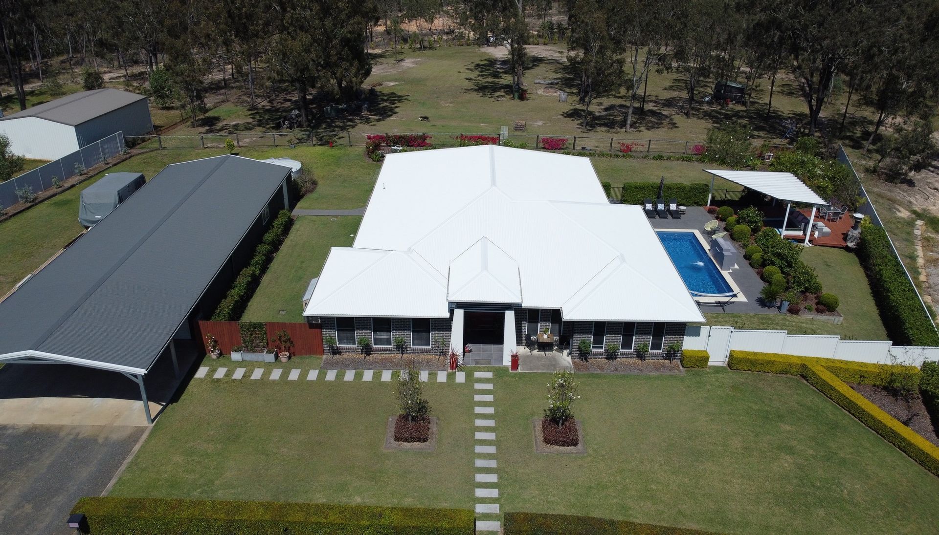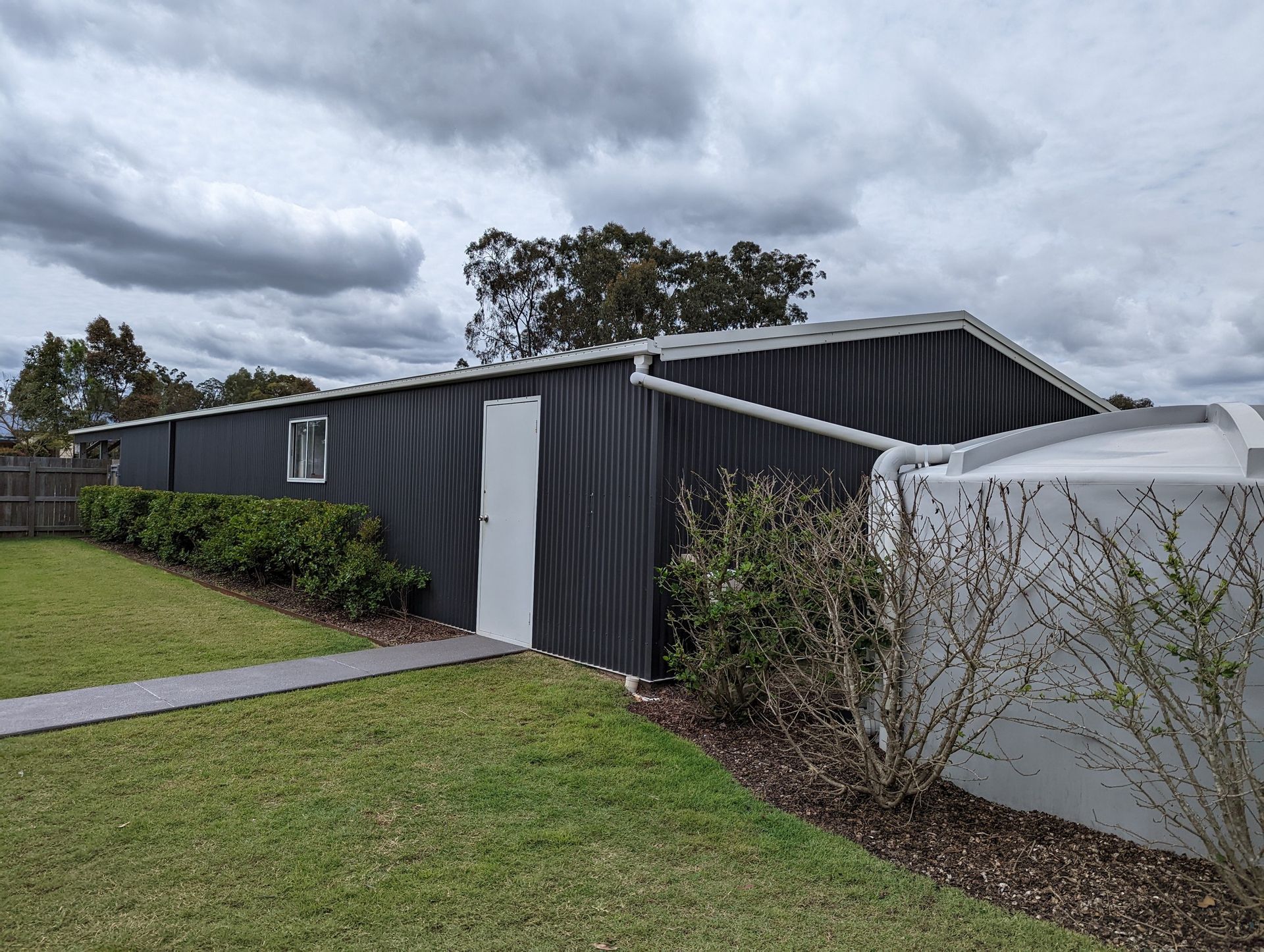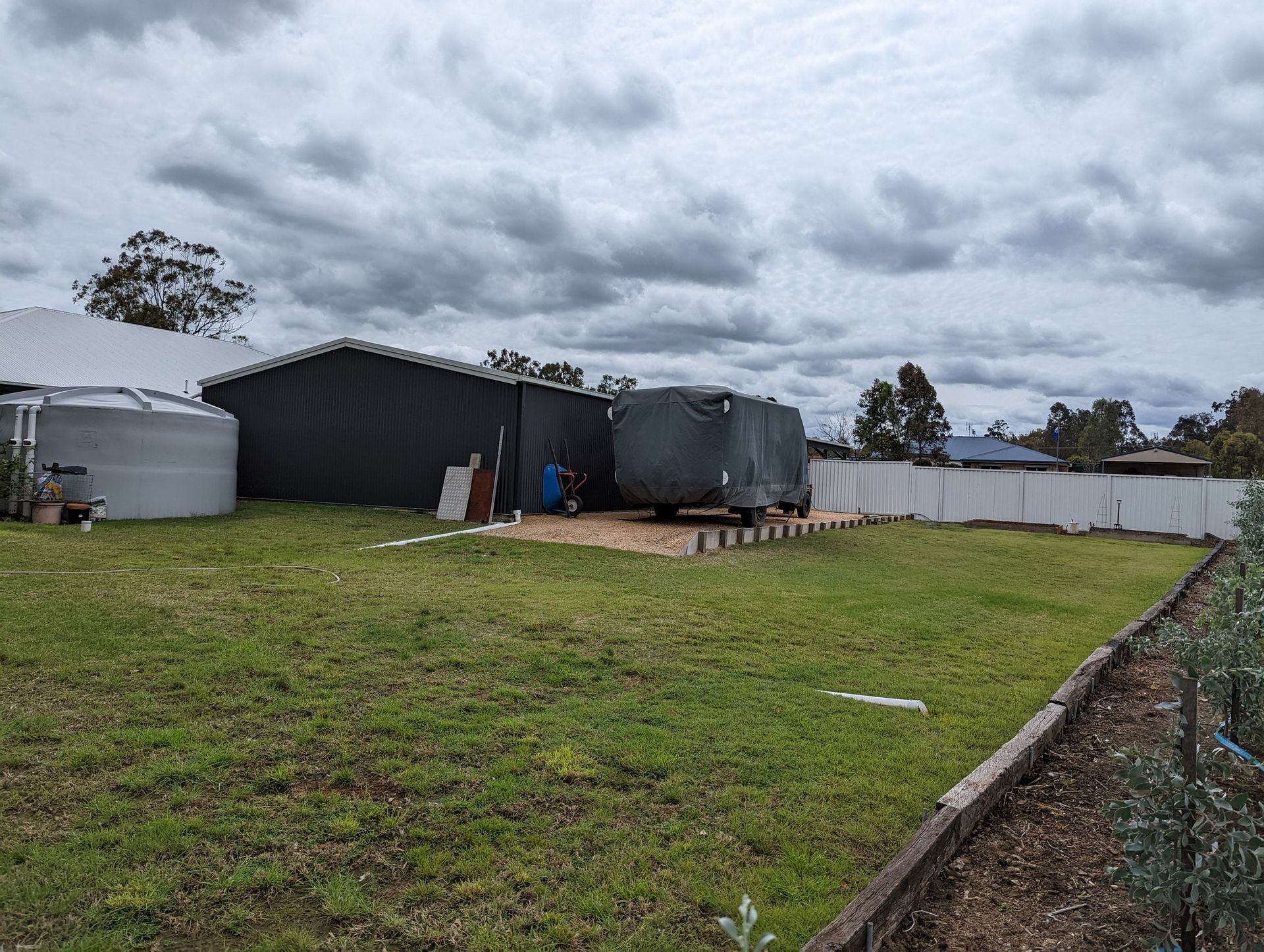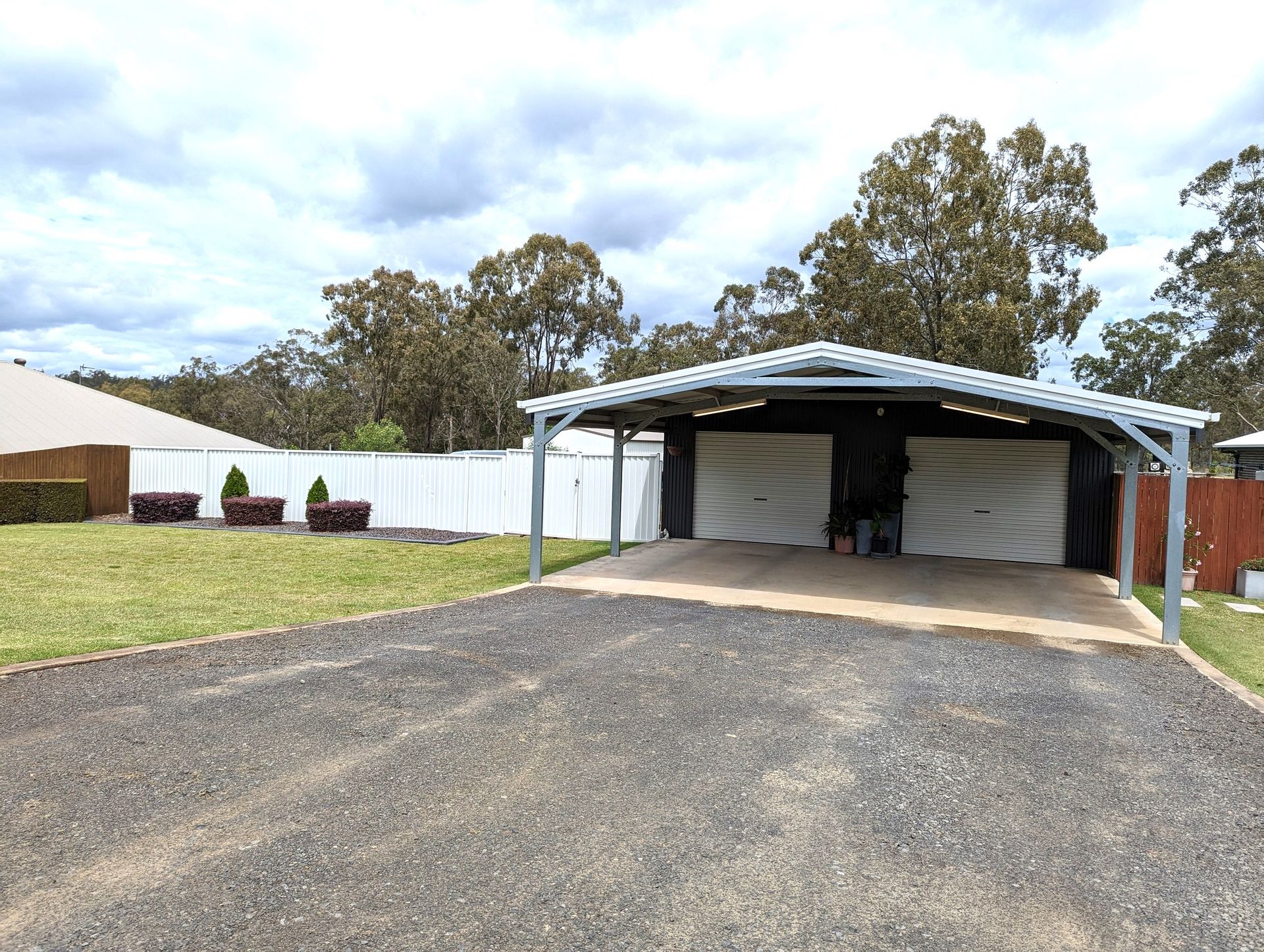 Massive steel framed 24 x 8 m shed and carport with room for 8 cars has power, plenty of lighting, and good storage shelves. Separate double gate access for caravans or truck with purpose built pad. Rainwater tank for water security.