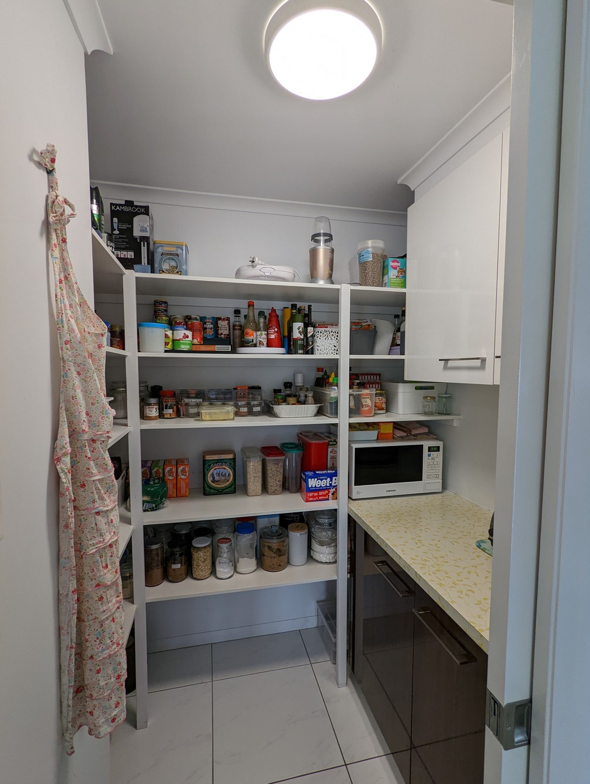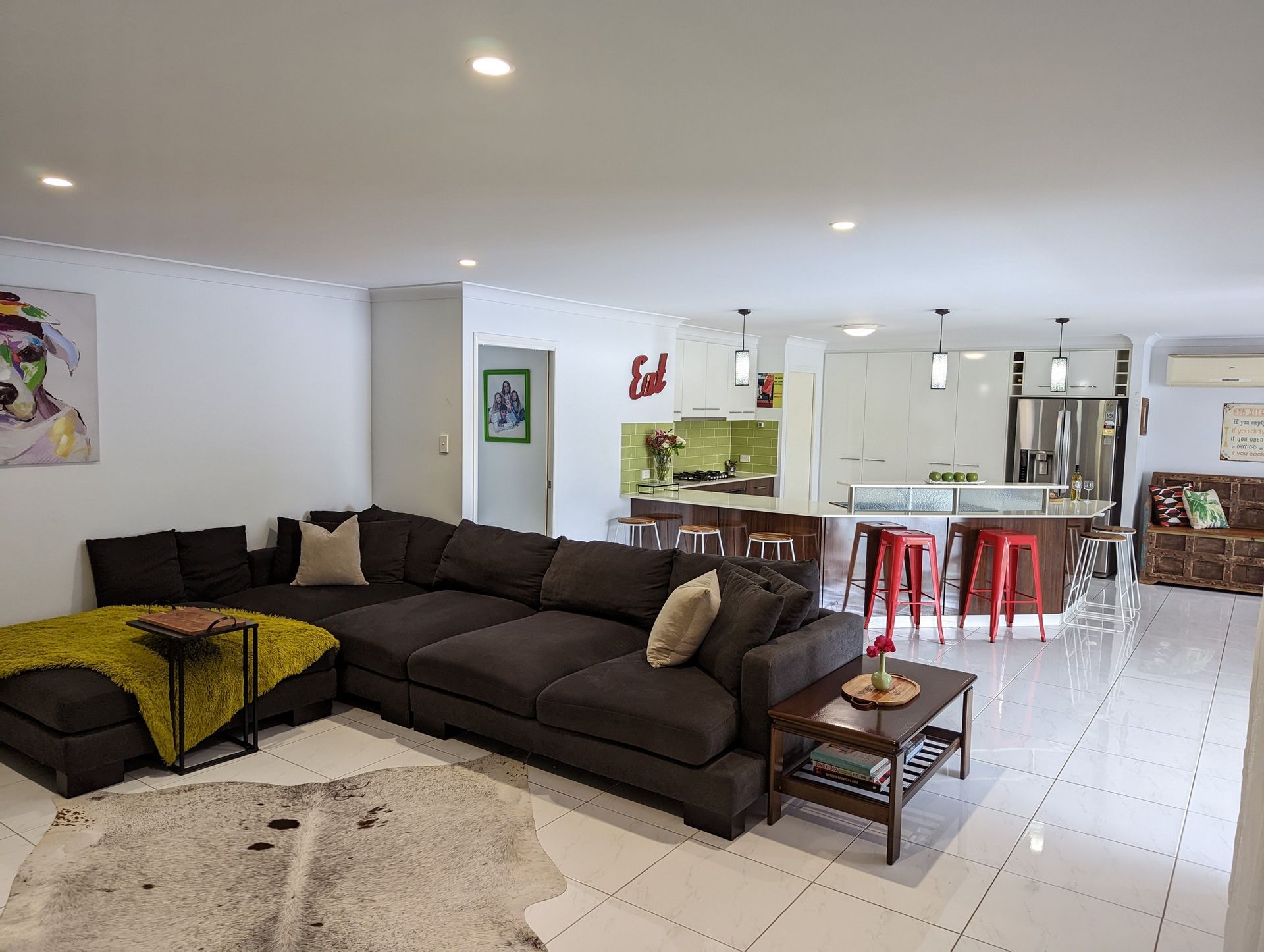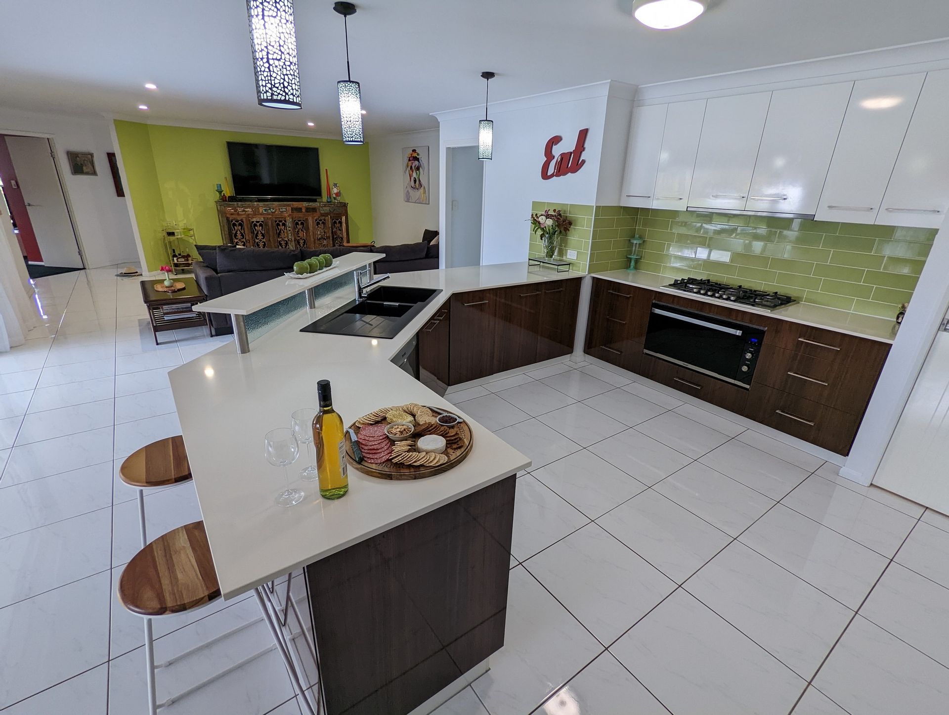 Open plan kitchen with plentiful bench space, Baumatic dishwasher and gas stove, brand new Delonghi oven, walk in pantry plus 2 huge extra storage cupboards, meals area and family room.