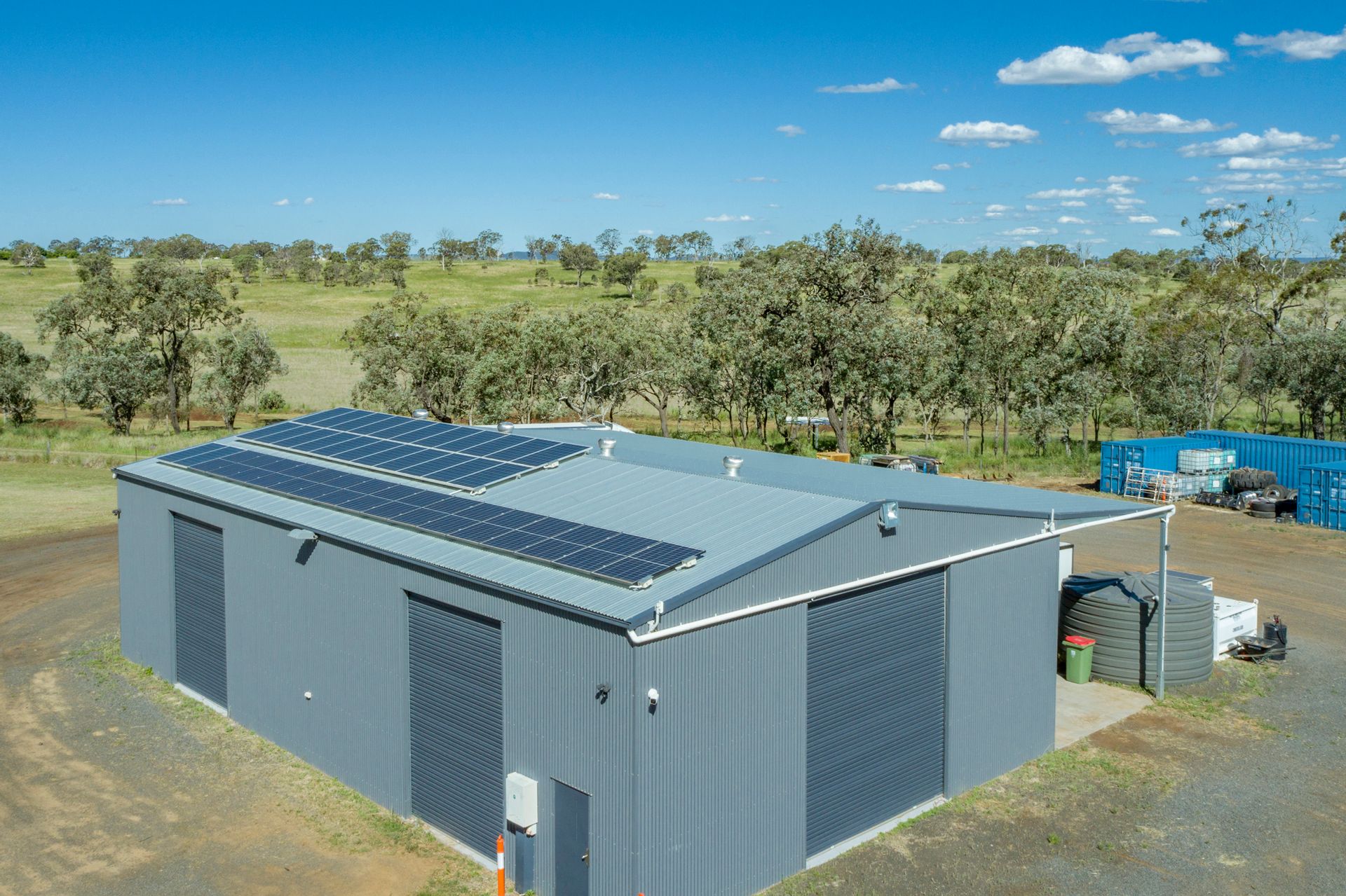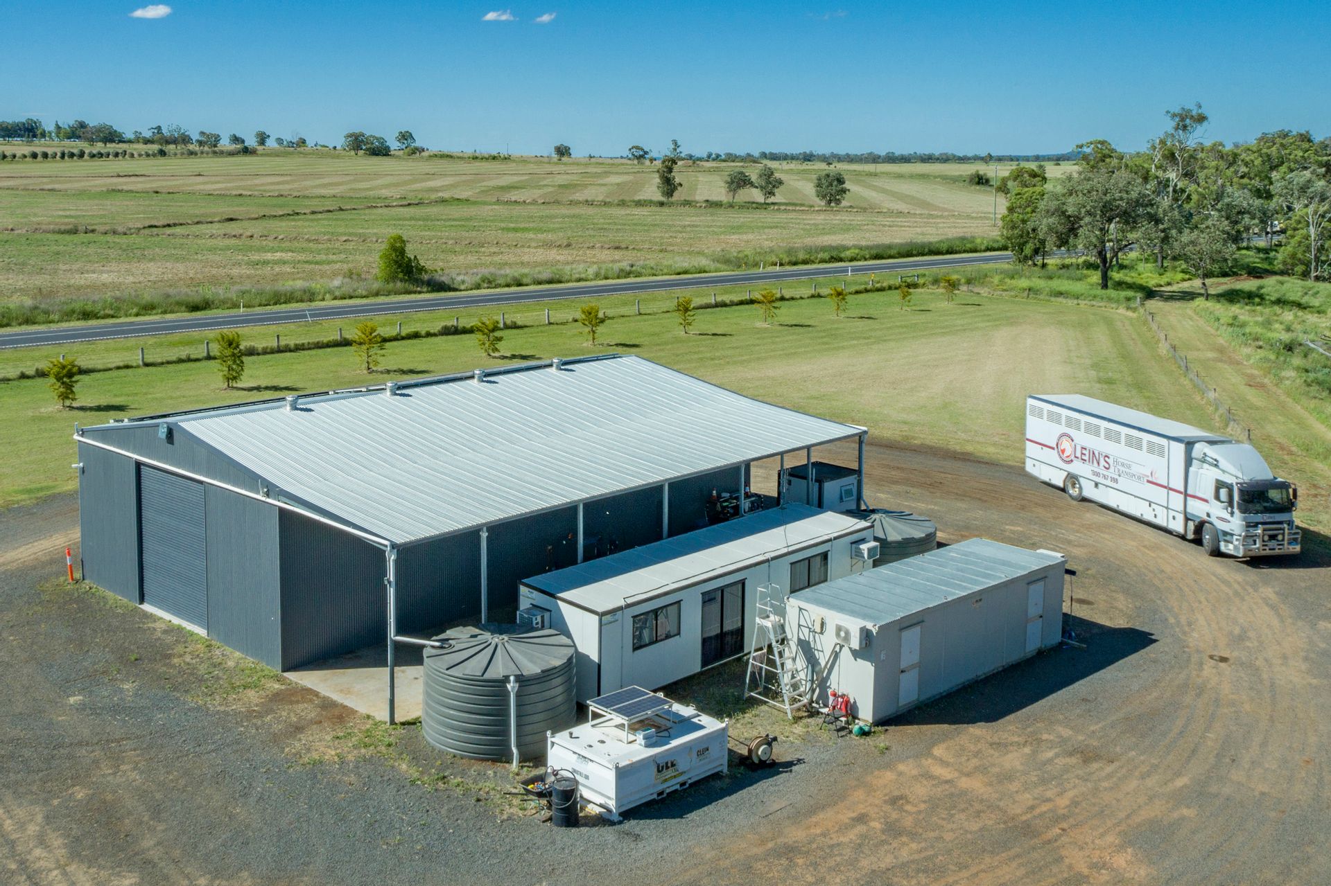 • 20*m x 12*m enclosed shed with 5*m high clearance, 5*m open awning, 1.5*m mechanics pit & 15* kW solar system