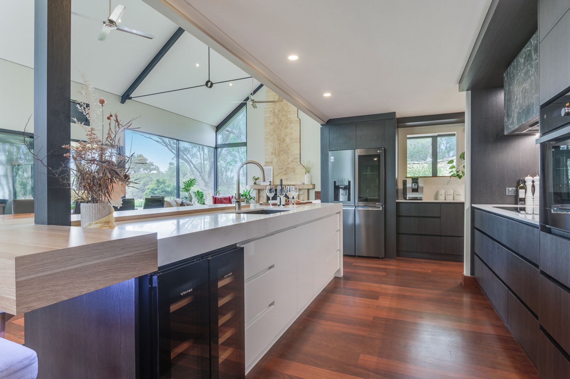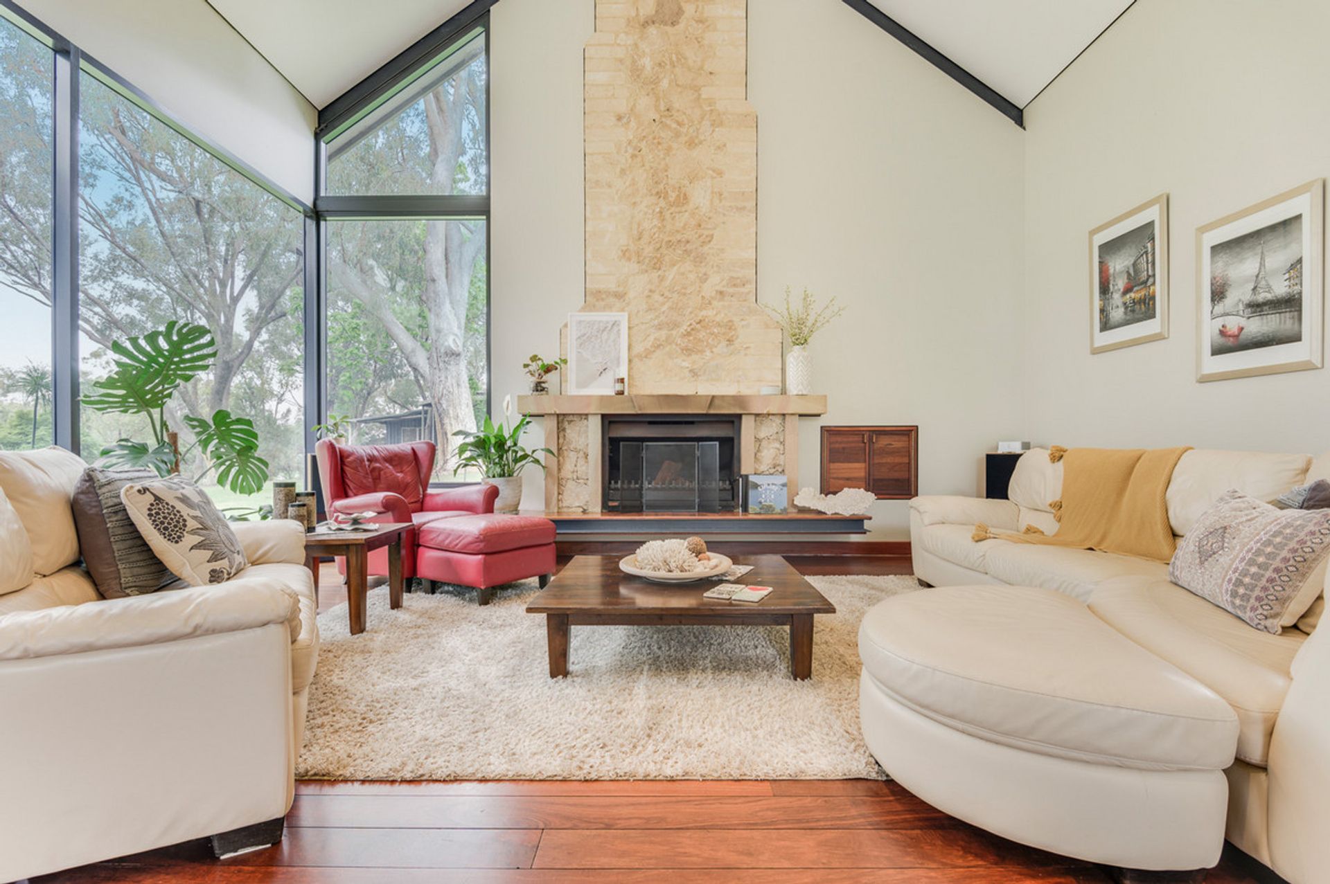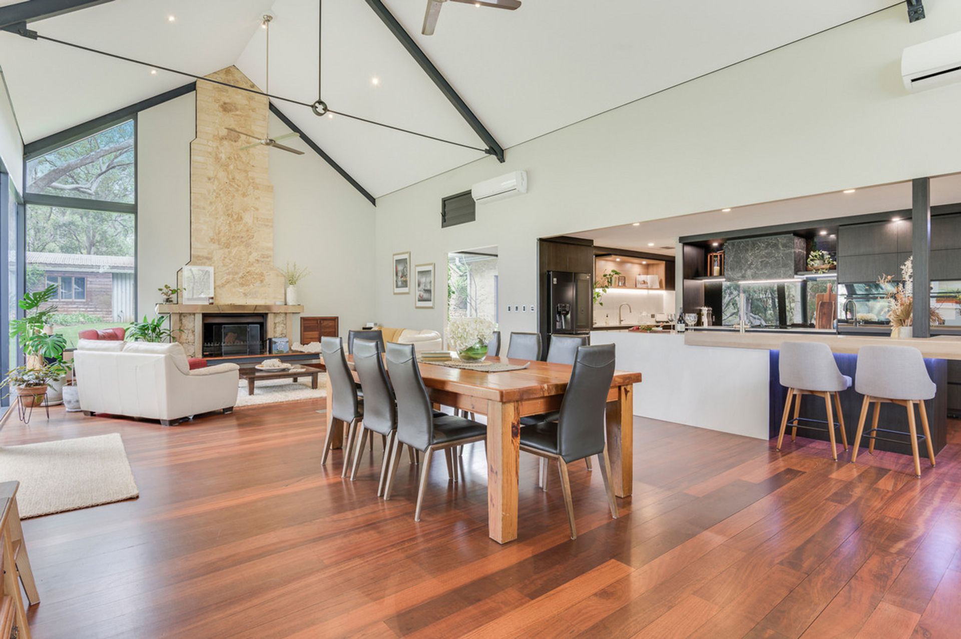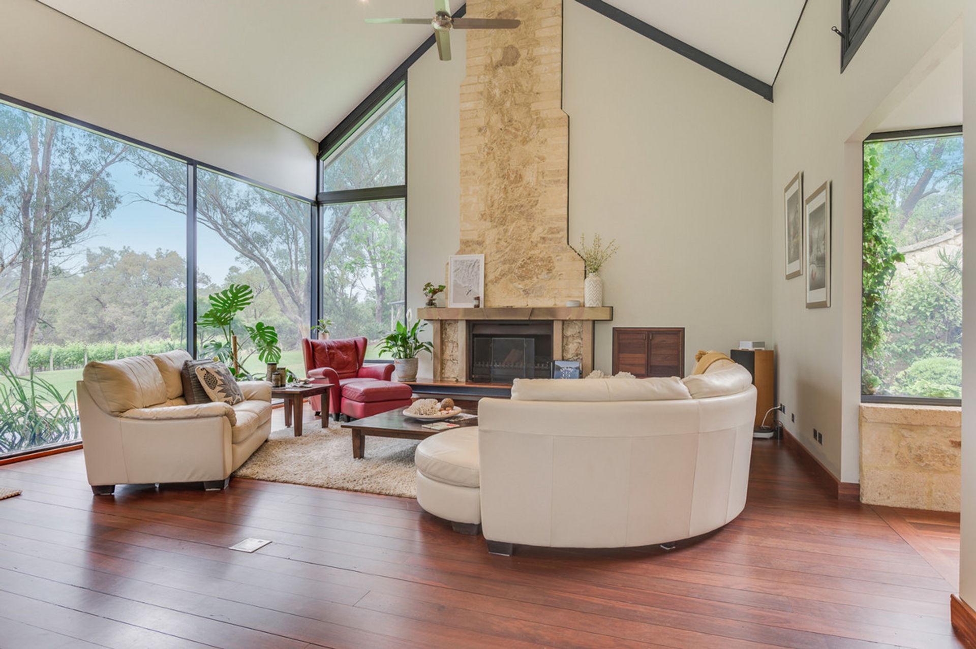 -Limestone feature walls with solid Jarrah flooring, high ceilings