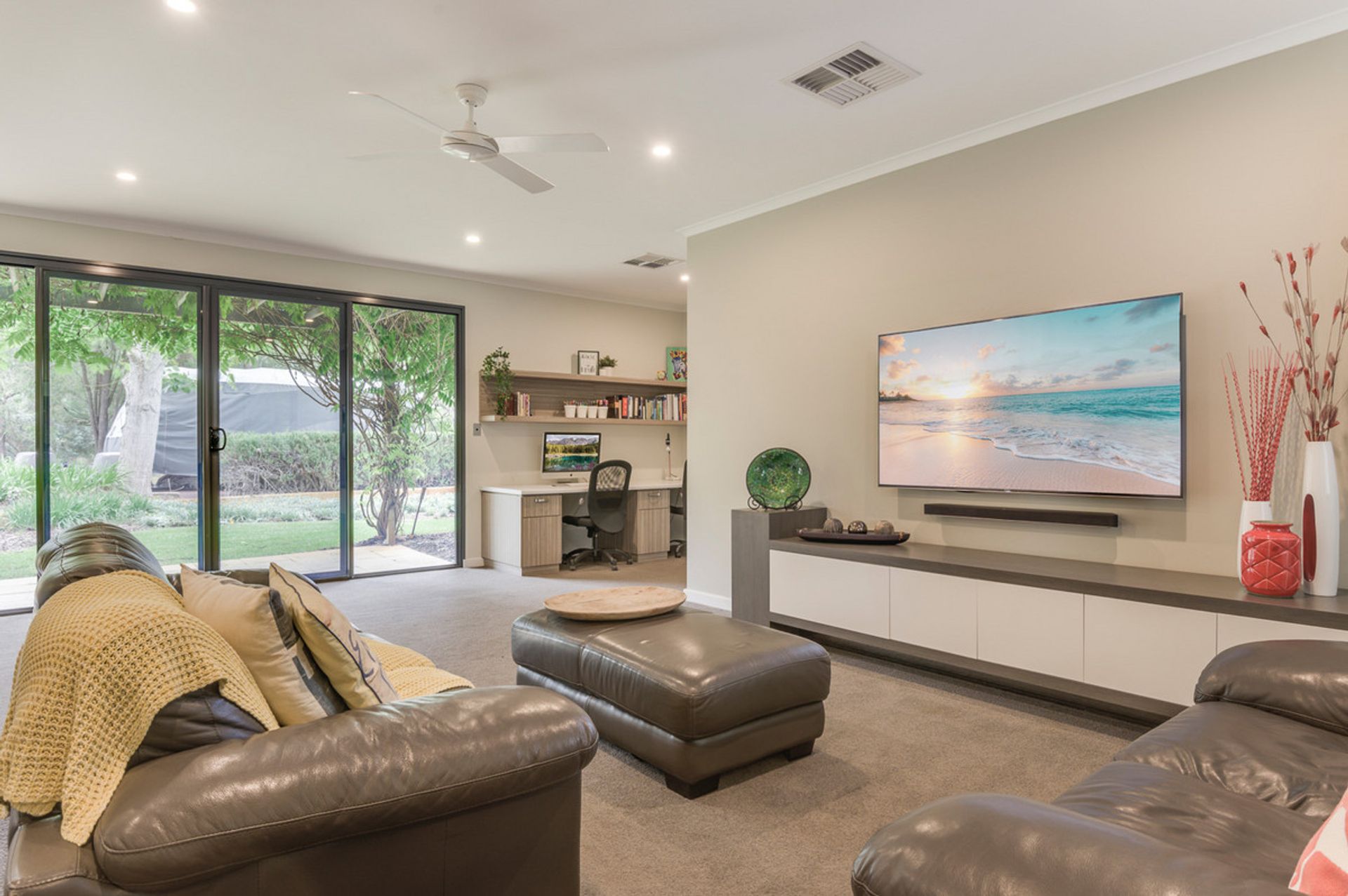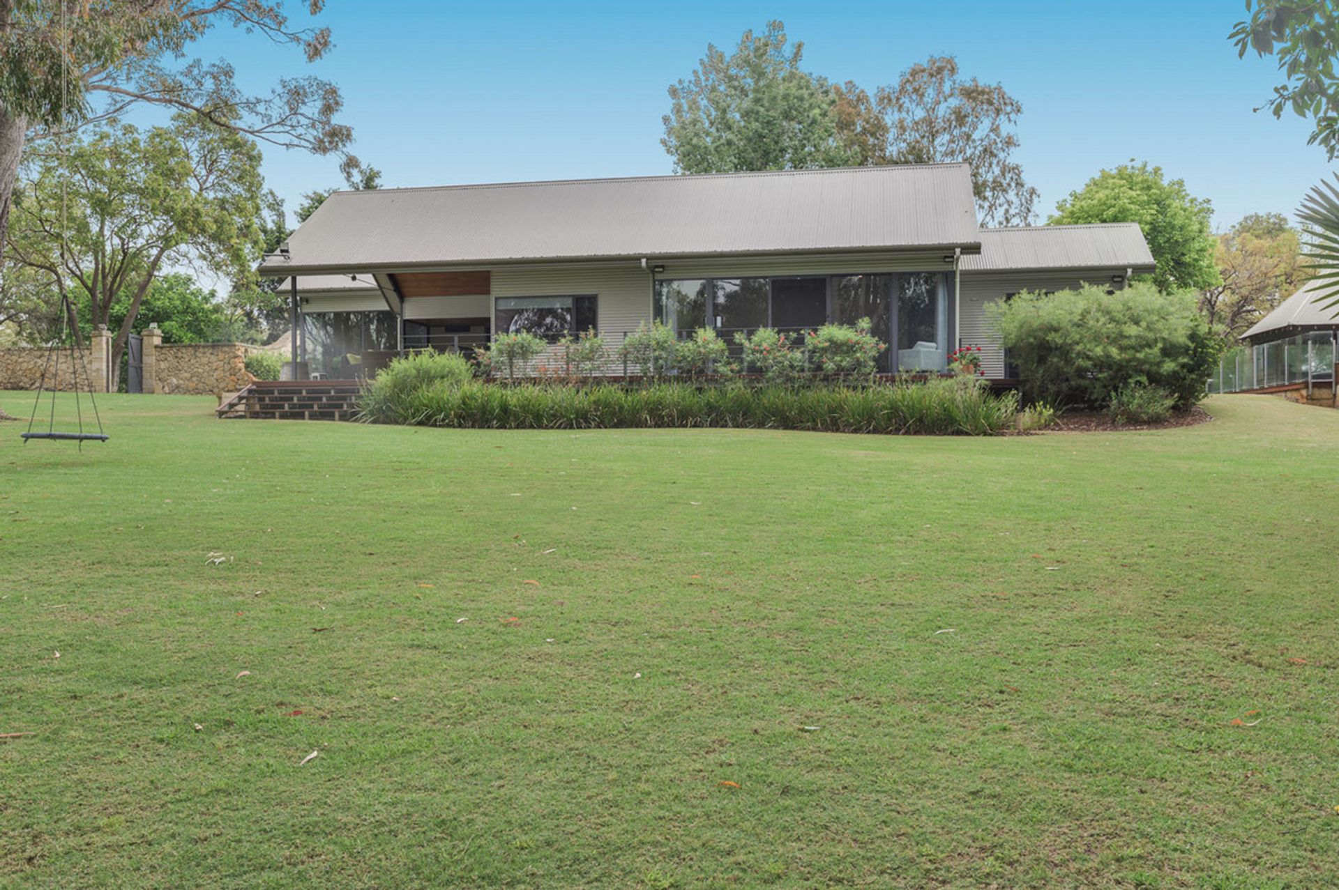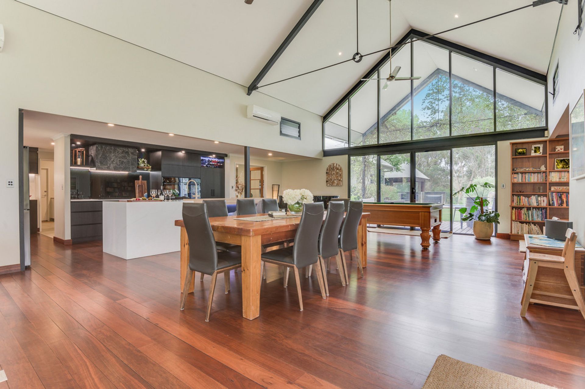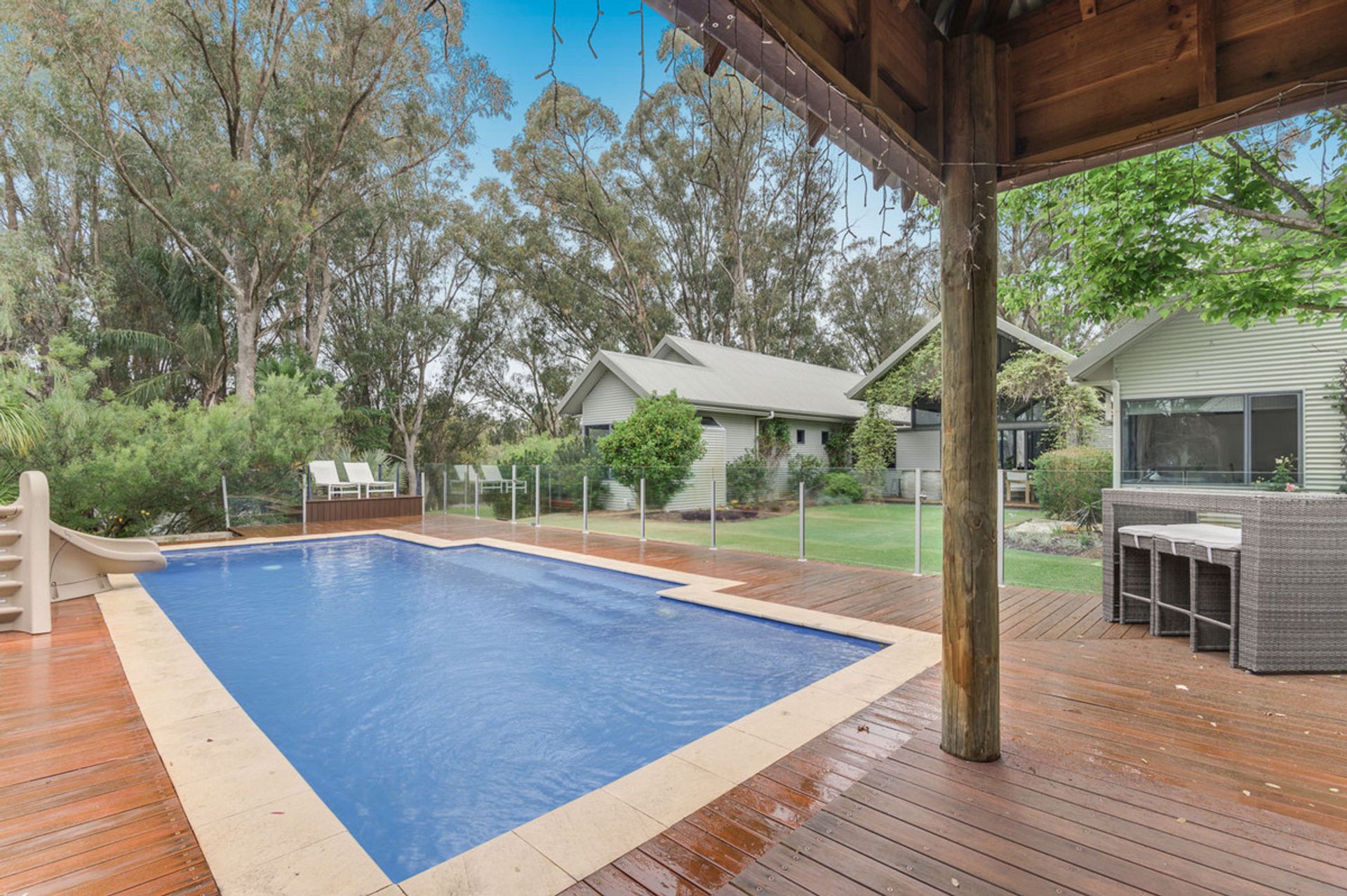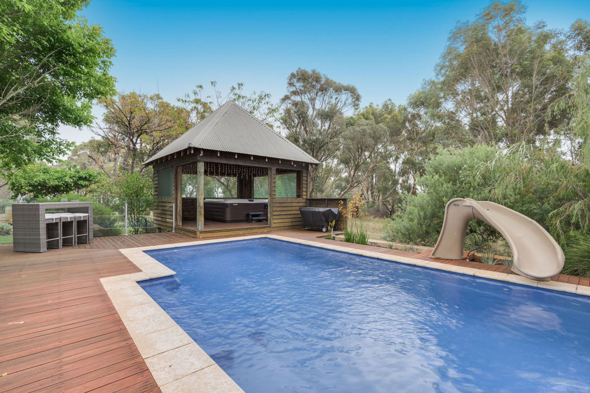Entering the main home you're greeted by luxury, with all fittings and every feature lovingly chosen. There are stunning solid jarrah floorboards through the main living and bedrooms, and huge windows which frame the gorgeous scenery of the property. This home has plenty of space for the entire family to spread out, with an open plan layout throughout and multiple living spaces including a library which leads onto the master bedroom. The kitchen is open plan and has been recently renovated with stone benchtops throughout, it also includes the latest appliances and LED mood lighting. The master suite looks like it's out of a luxury magazine, with a generous sized bedroom and luxurious ensuite and walk in robe. Off the main home to the left there is a teen retreat or games room that leads to two king sized minor bedrooms and a recently renovated bathroom. Straight off the kitchen and family meals area you have an incredible pool and deck that will be perfect for warm summer days with the family.