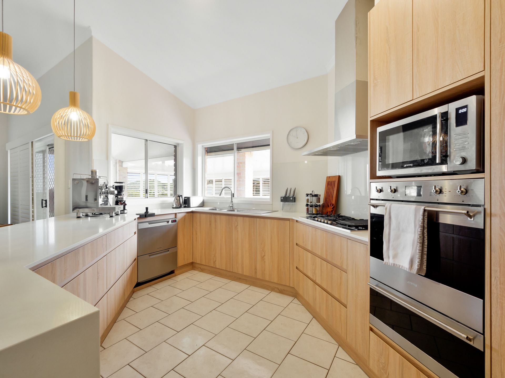 • Exquisite kitchen with stone tops, butlers pantry, gas cooktop, modern Smeg appliances, double oven & Fisher & Paykel dishwasher