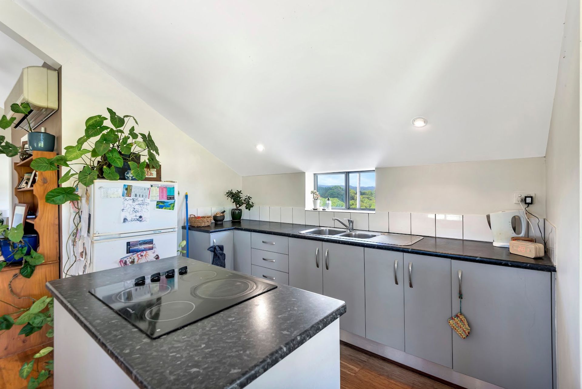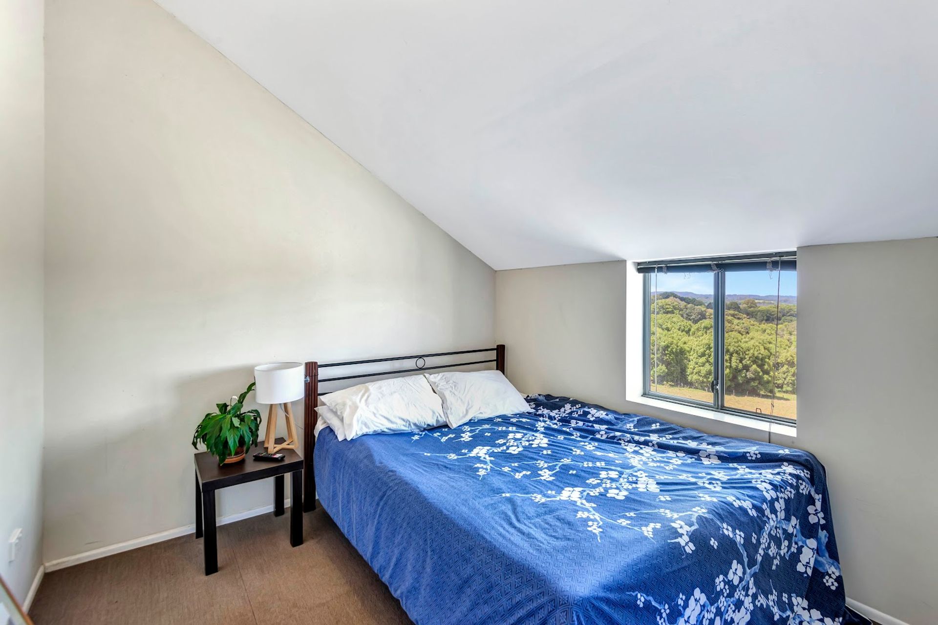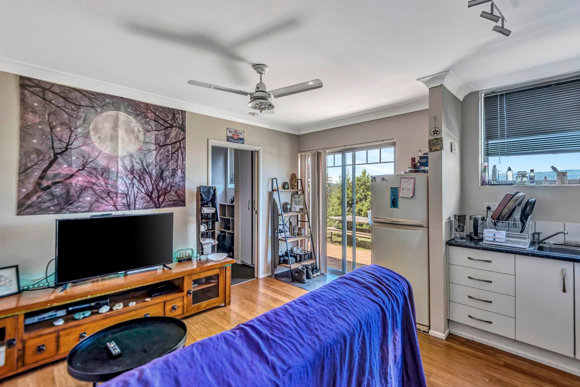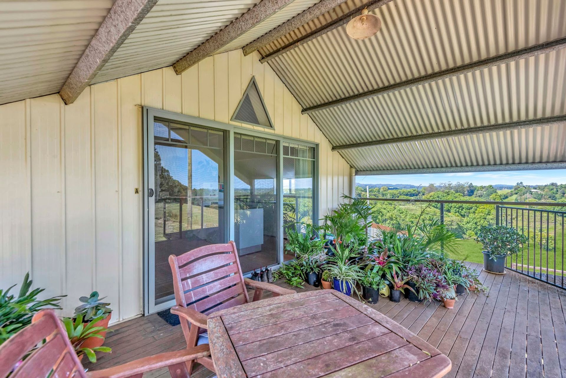 The upper-level studio with open plan light filled living area, kitchen, bathroom/laundry, two bedrooms and a large verandah enjoying expansive scenic views.