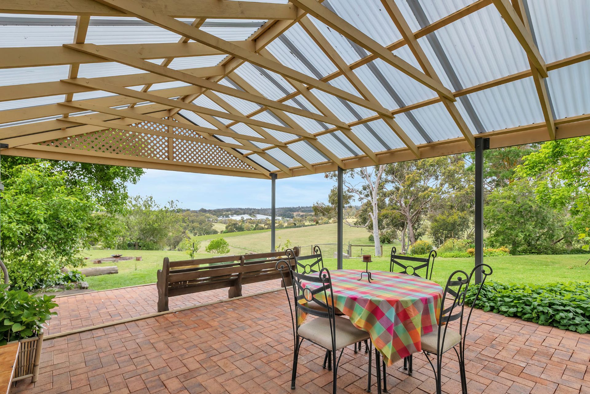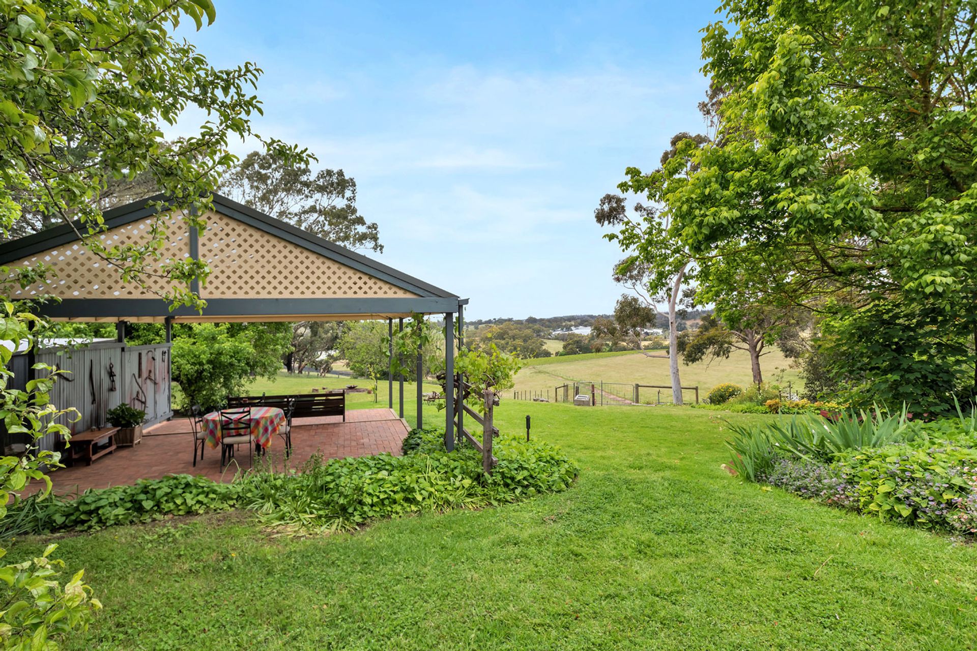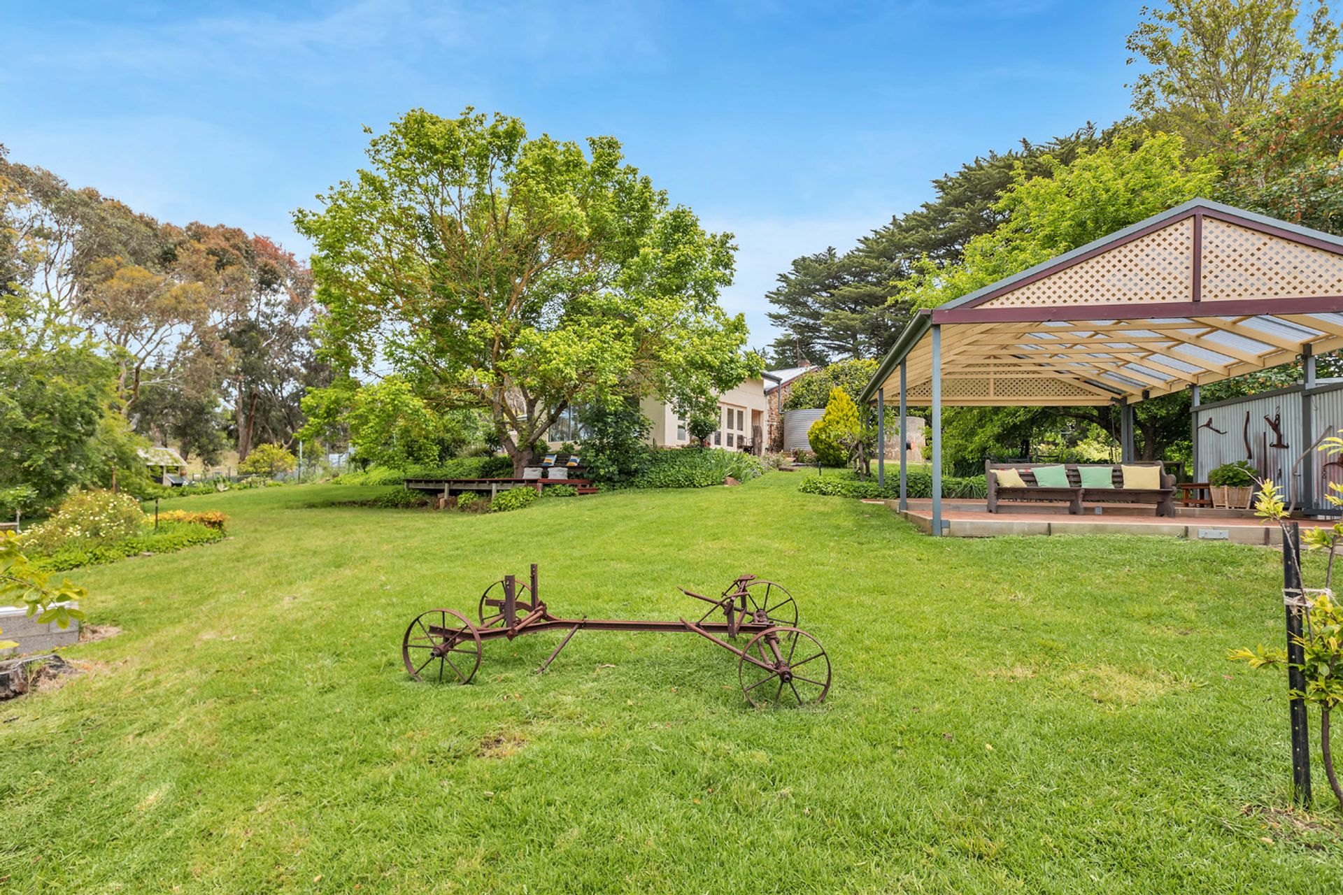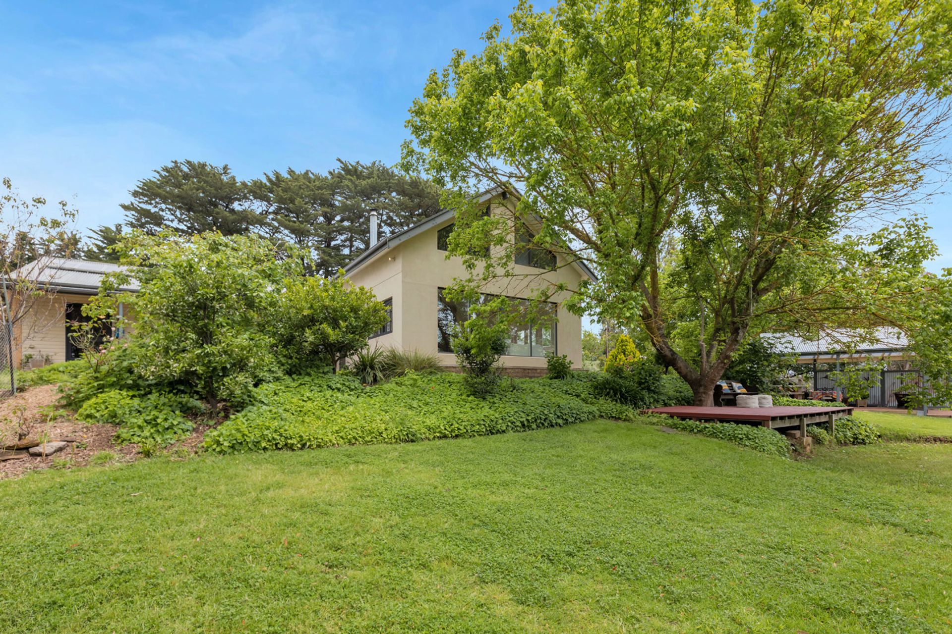• Timber barbecue deck under lovely big old shady Golden Elm.