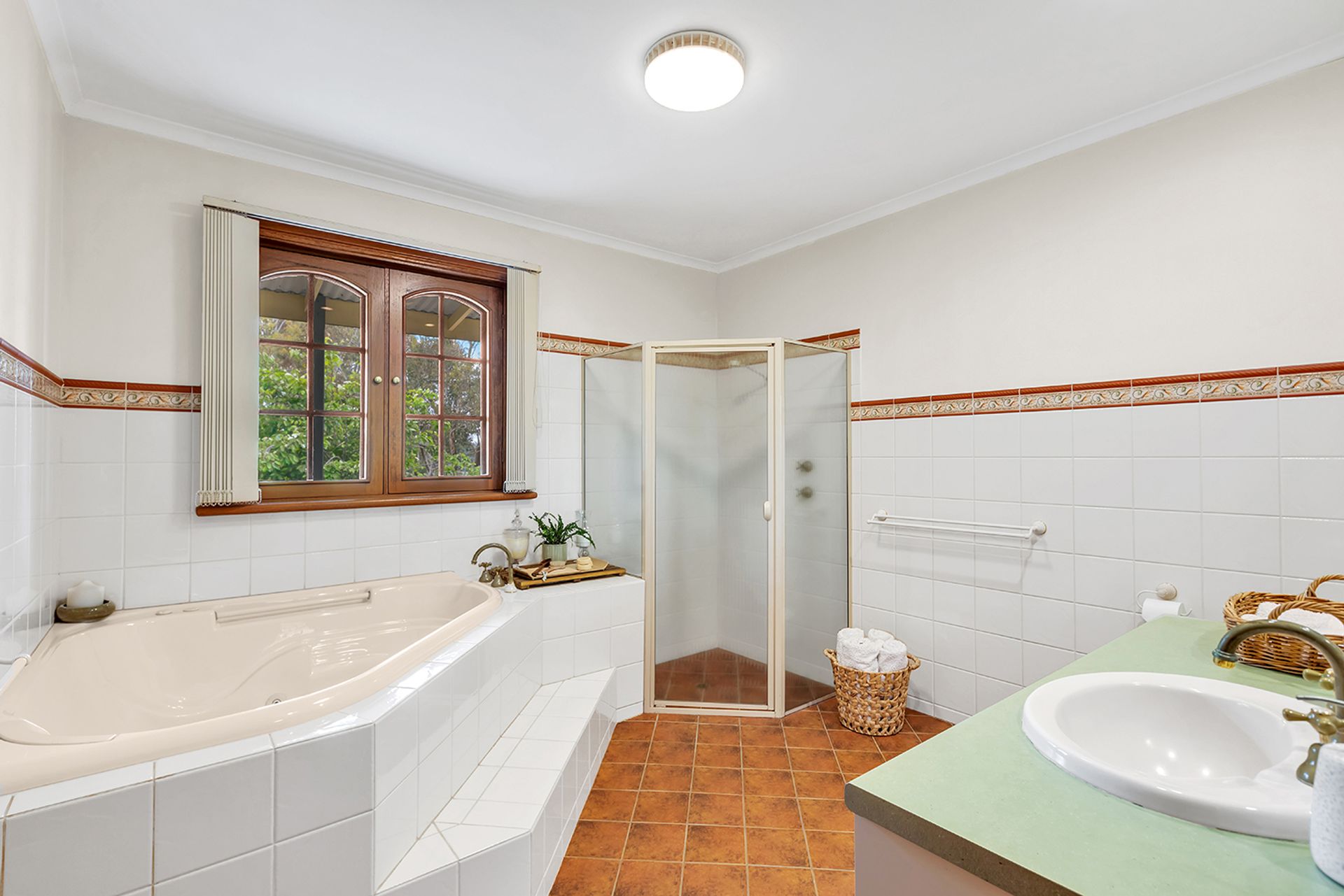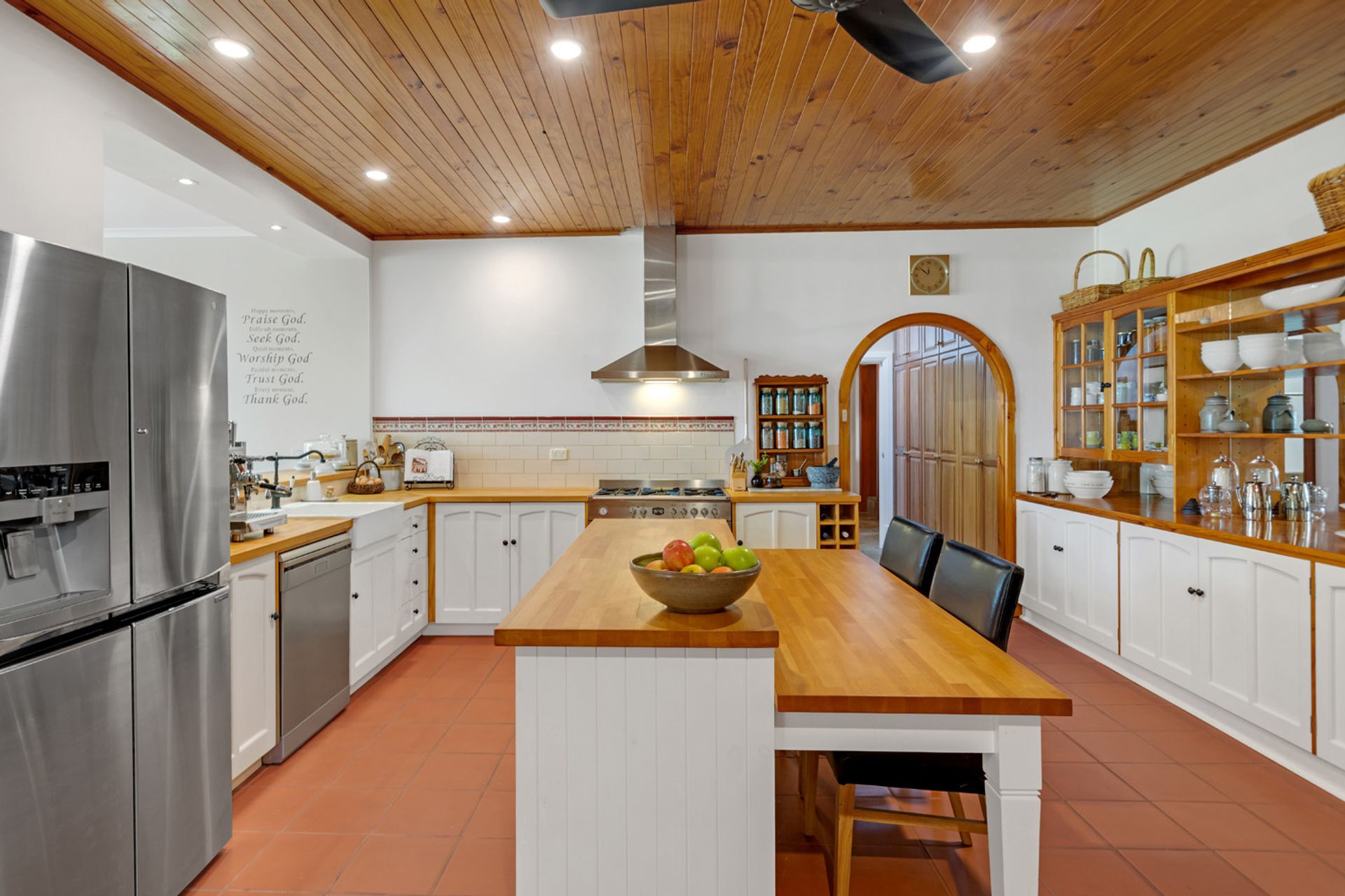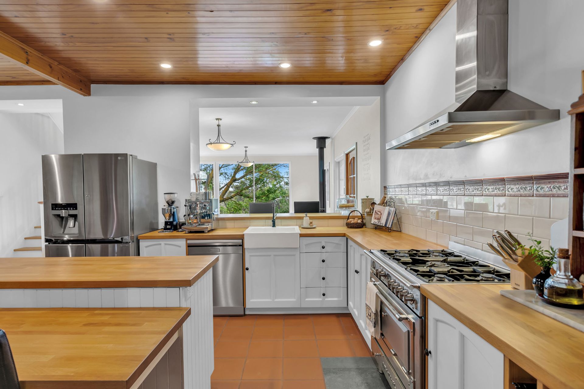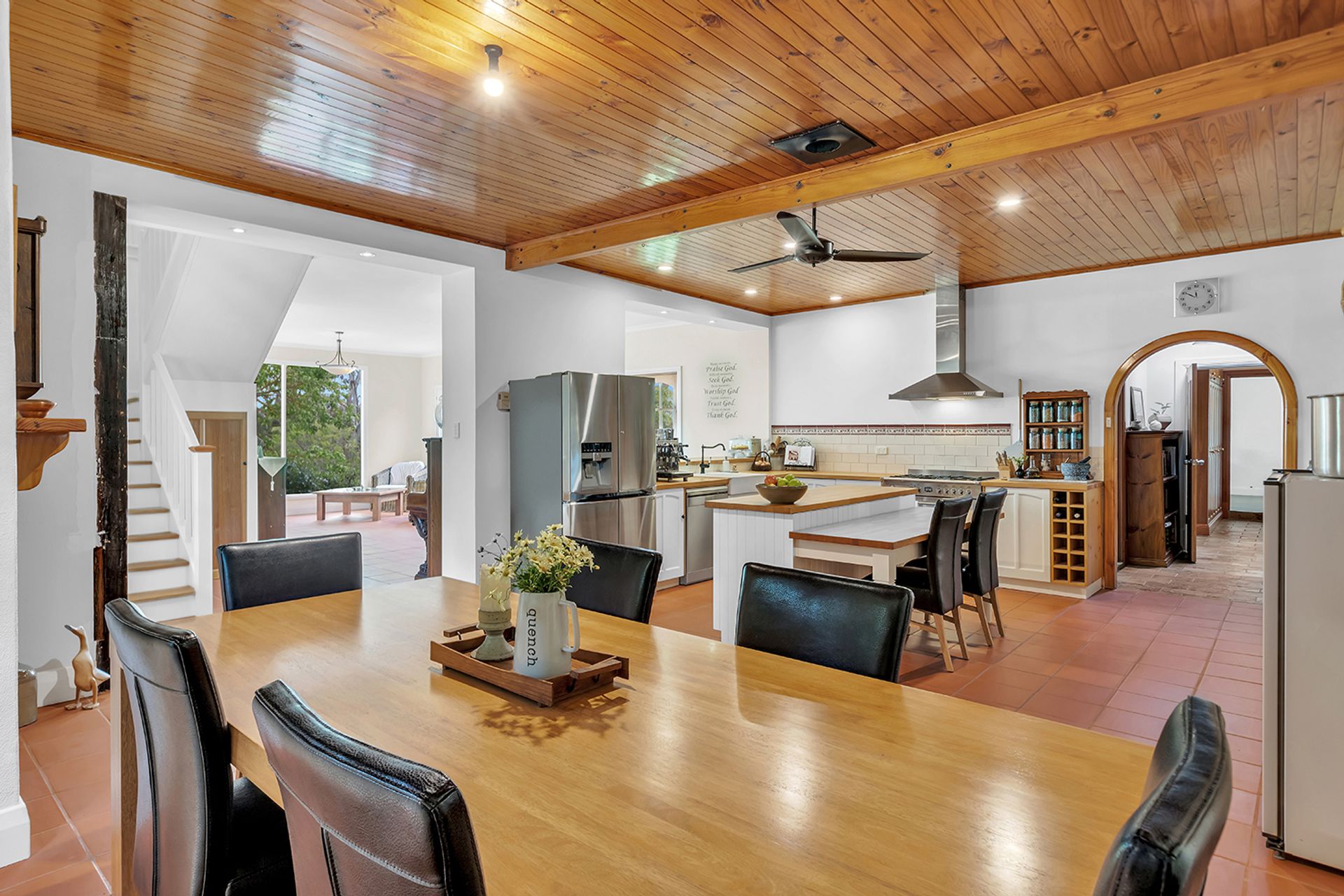 Entertainers will adore the country themed kitchen located in the heart of this family orientated home. Polished beams and terracotta floors add texture to a functional space brimming with extensive cabinetry (there is so much storage here!). Graze at the island bench or dress your dining table for the next family celebration. Move guests into the living area where you will find enormous picture windows framing the outside world. Flooded with glorious natural light and overlooking the gardens, it's a spot you will not want to leave.