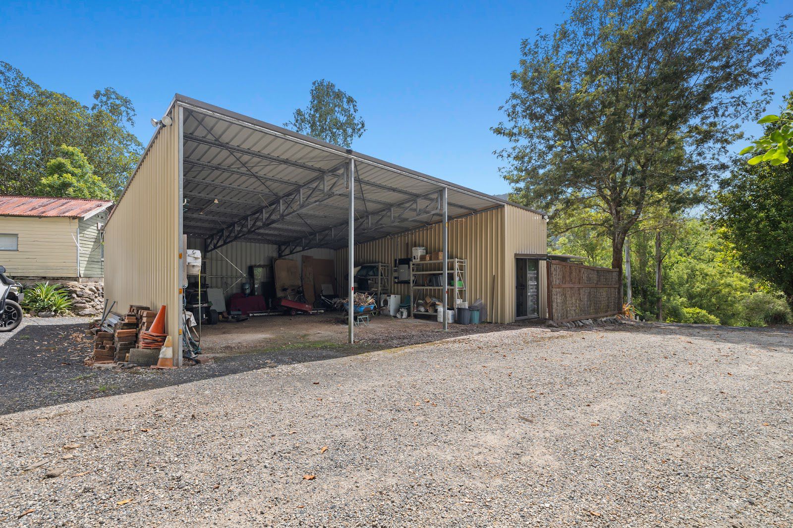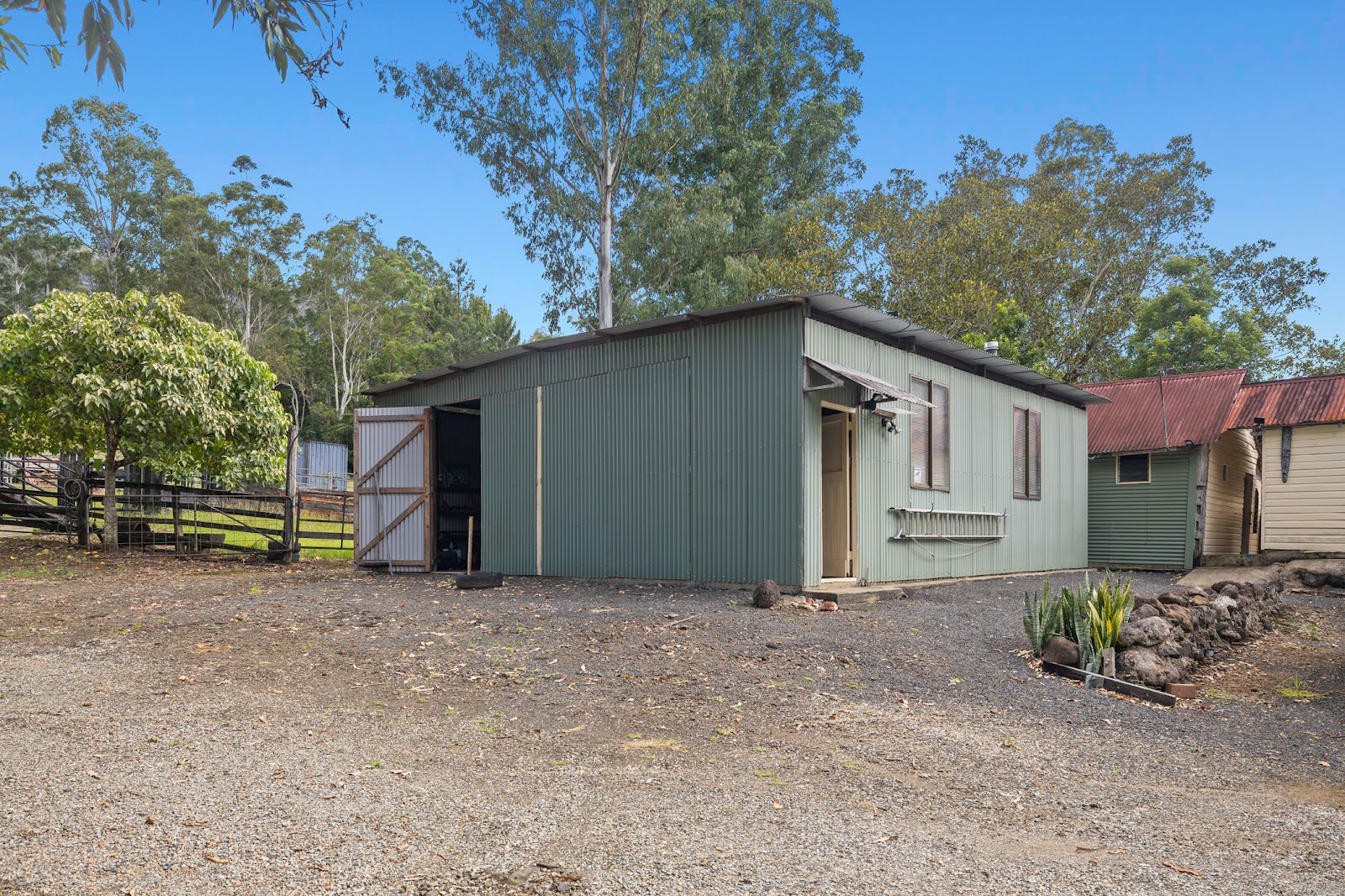 There is an abundance of sheds available, from a large, lockable structure with a concrete floor, ample power outlets, multiple work benches, and plenty of storage shelving, to a 4-bay shed with 3 bays open and the 4th converted into a large fully lined office, and the original old dairy bales and vat room, modified with stone walling and a large awning. Mains power is connected to the houses and sheds, with the addition of a substantial 10kw solar system harnessing the energy of the sun's rays. The meter box is designed to be able to read each structure separately. Additionally, there is a light-filled art studio with a stunning view and power, as well as a caravan under an awning with a paved area and nice outlook.