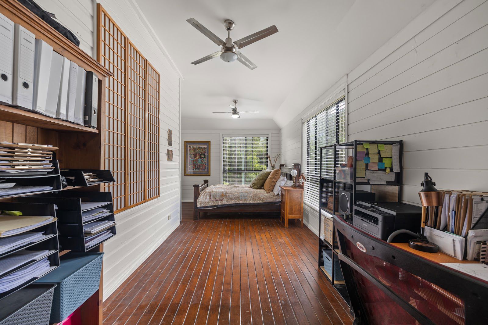 The "Hillview" farmhouse (approx. 172sqm) is a timeless timber structure, boasting a range of modern updates such as an updated kitchen and bathroom, ceiling fans, a walk-in closet, and a built-in wardrobe. The deck has been partially converted into a sleepout, yet the house still retains its original charm with polished timber flooring, a wood heater, wainscoting panels on the walls, high ceilings, and a traditional bullnose roof. From the wide verandas on two sides, one can enjoy the morning winter sun and the views of the surrounding area. The original two-room farm cottage, constructed from timbers milled on the property, is still part of the house, adding to its undeniable charm.