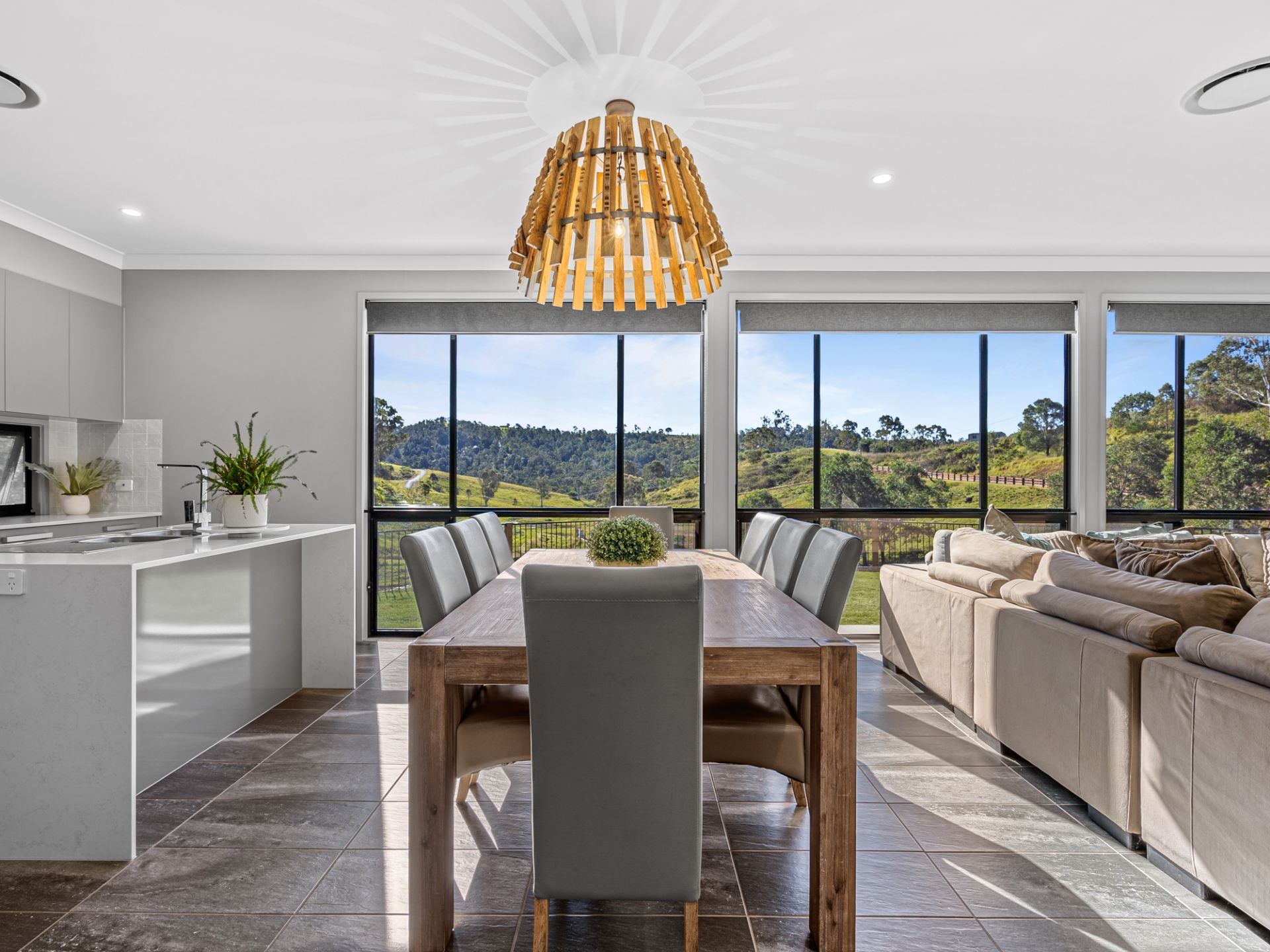 > Combined lounge & dining features a beautiful feature light & indoor fire place