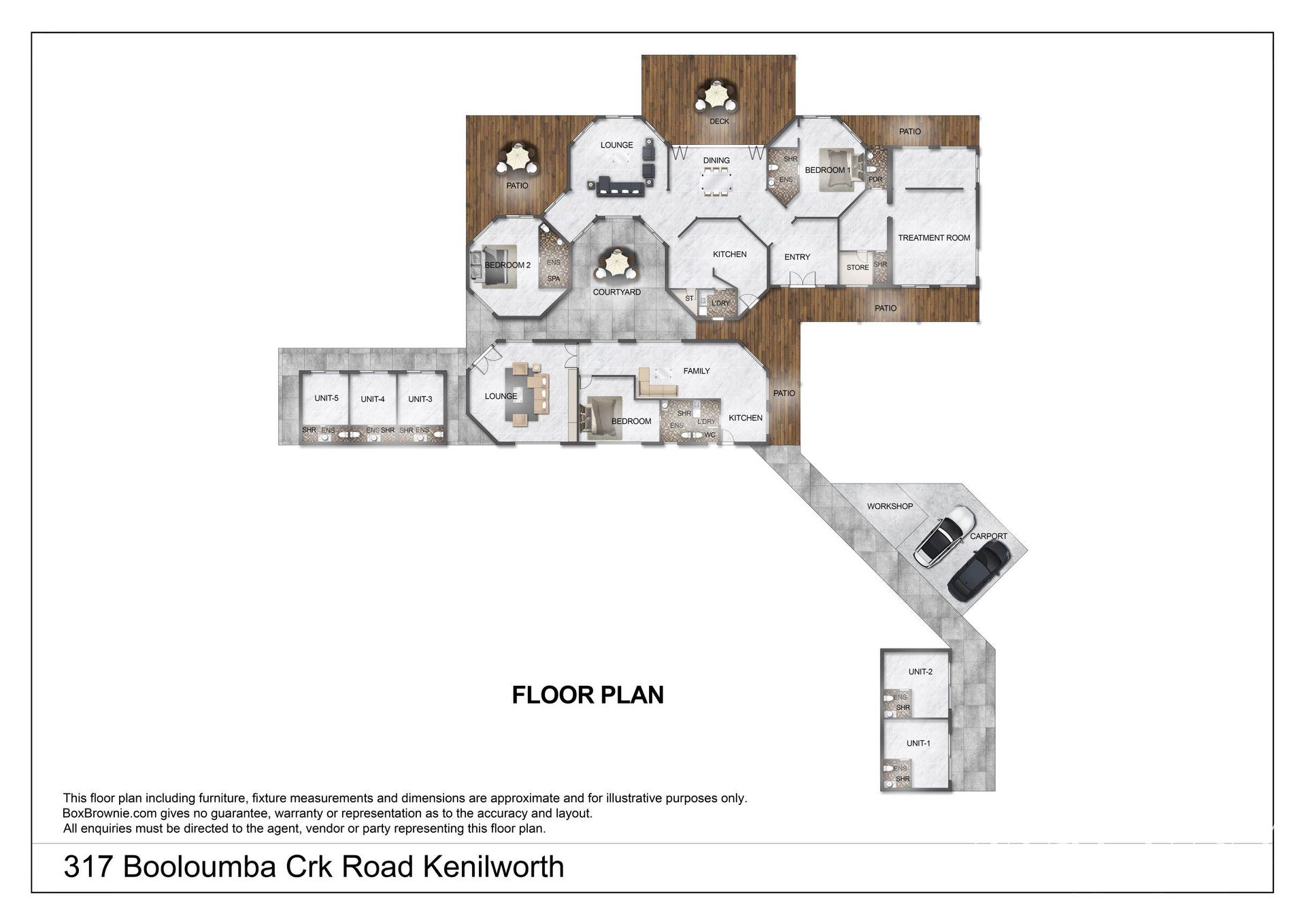 Across a single level the main residence comprises formal entry, treatment room(s) with shower and powder room, two ensuited master-sized bedrooms, separate living areas opening out to expansive hardwood decking and inground pool with spa, granite kitchen, separate laundry, and a rear European style courtyard.