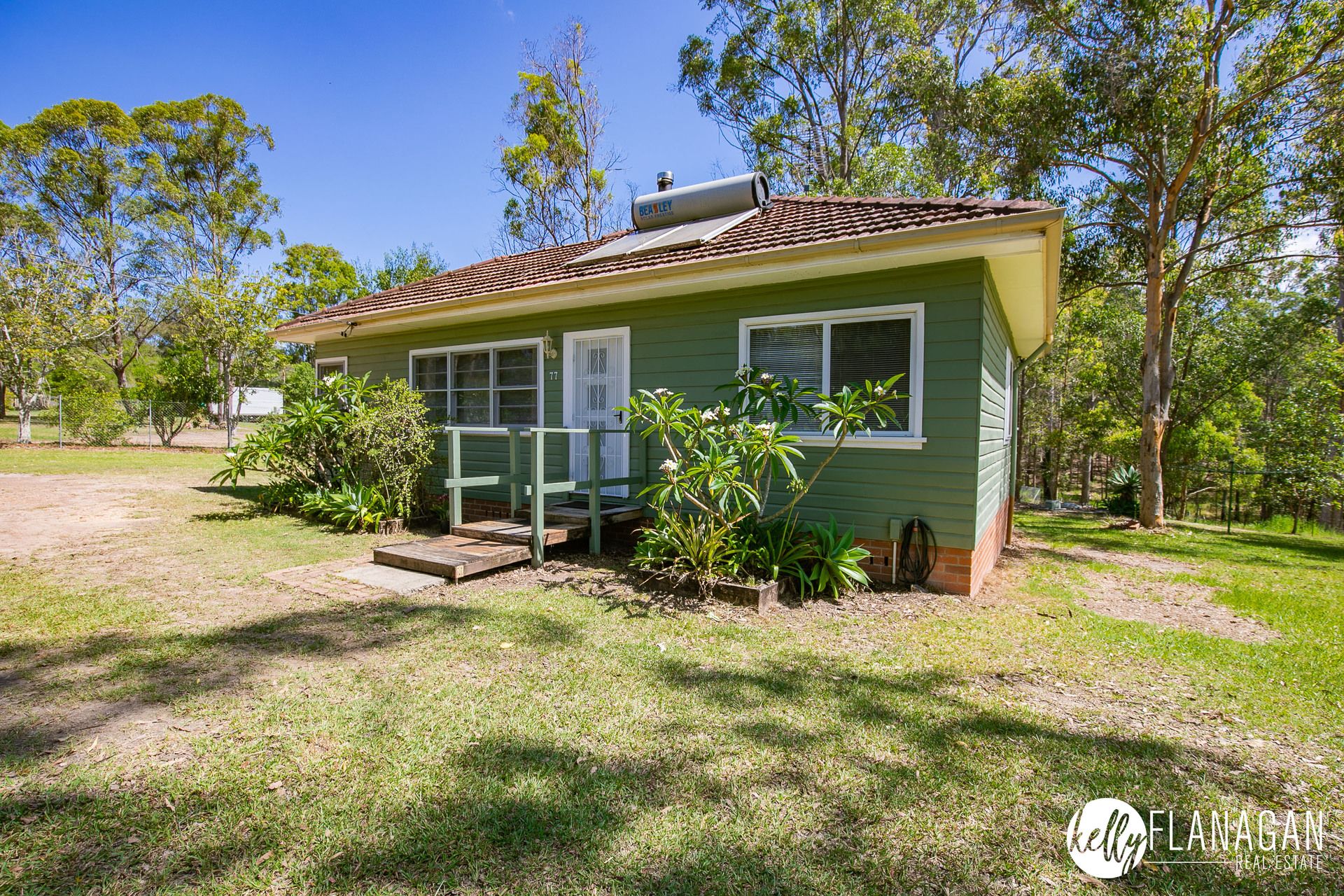 This hardwood home rests private in a tree-studded front yard, a lovely high shrub hedge keeps you rather secluded from the street. The house yard is flat to slightly sloping and then the back paddock is a gentle slope either side with a small gully in the middle.