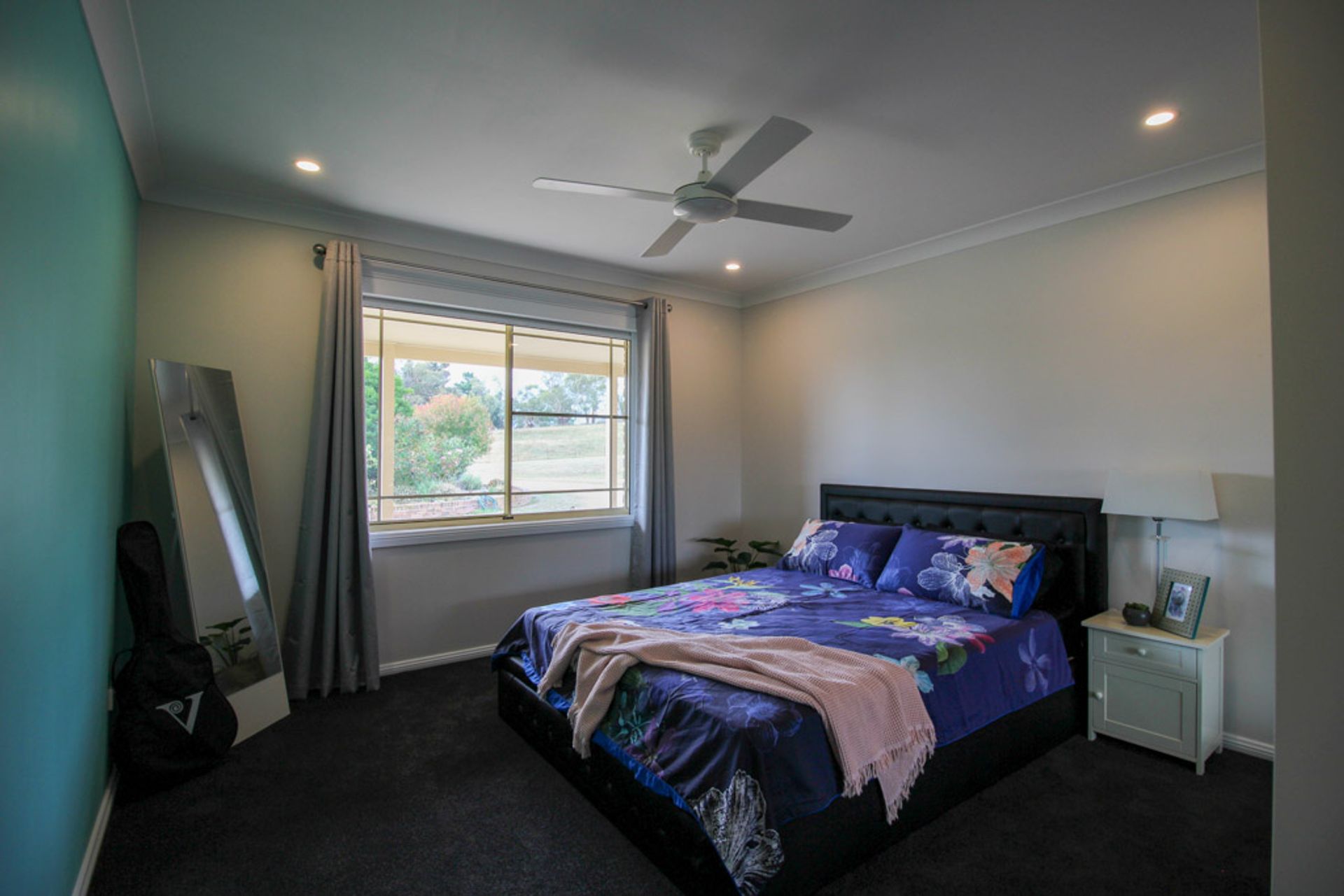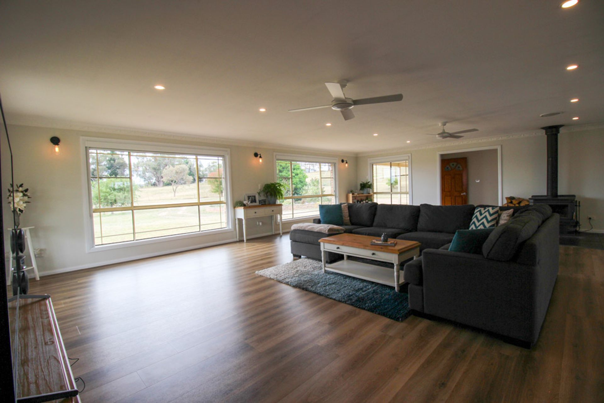 • Slow-combustion wood fireplace with ducted heat transfer into the living rooms, slab heating and ceiling fans throughout