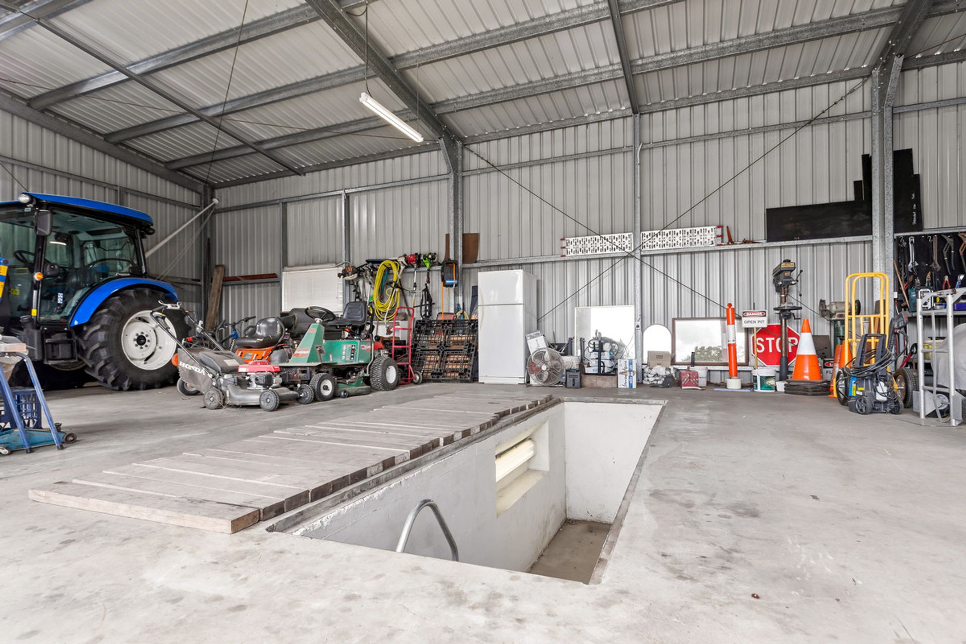 • 9m x 18m machinery shed with concrete flooring and 3 phase power outlets & vehicle/truck inspection pit.