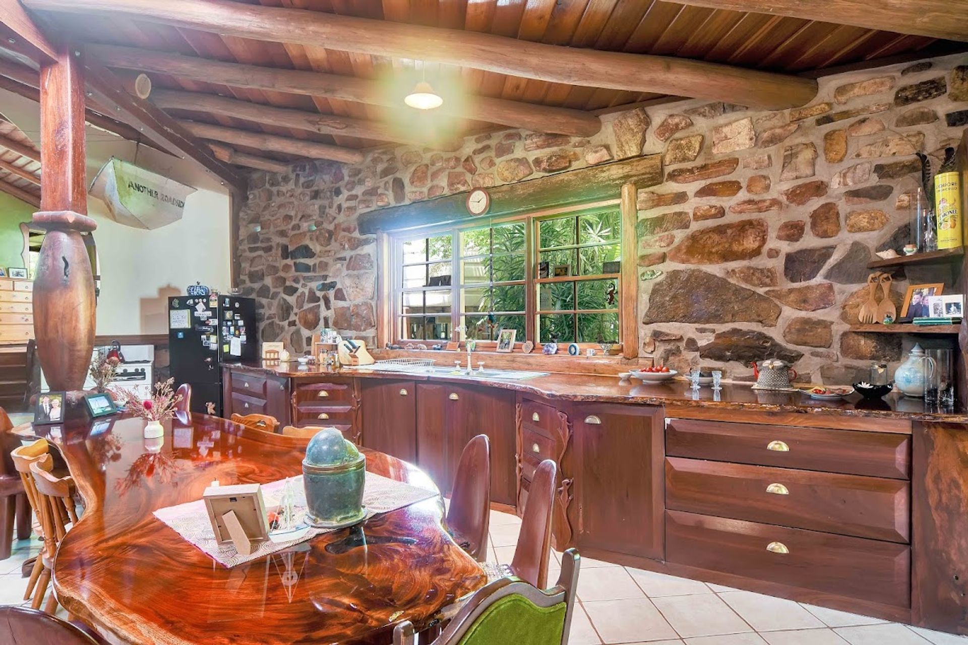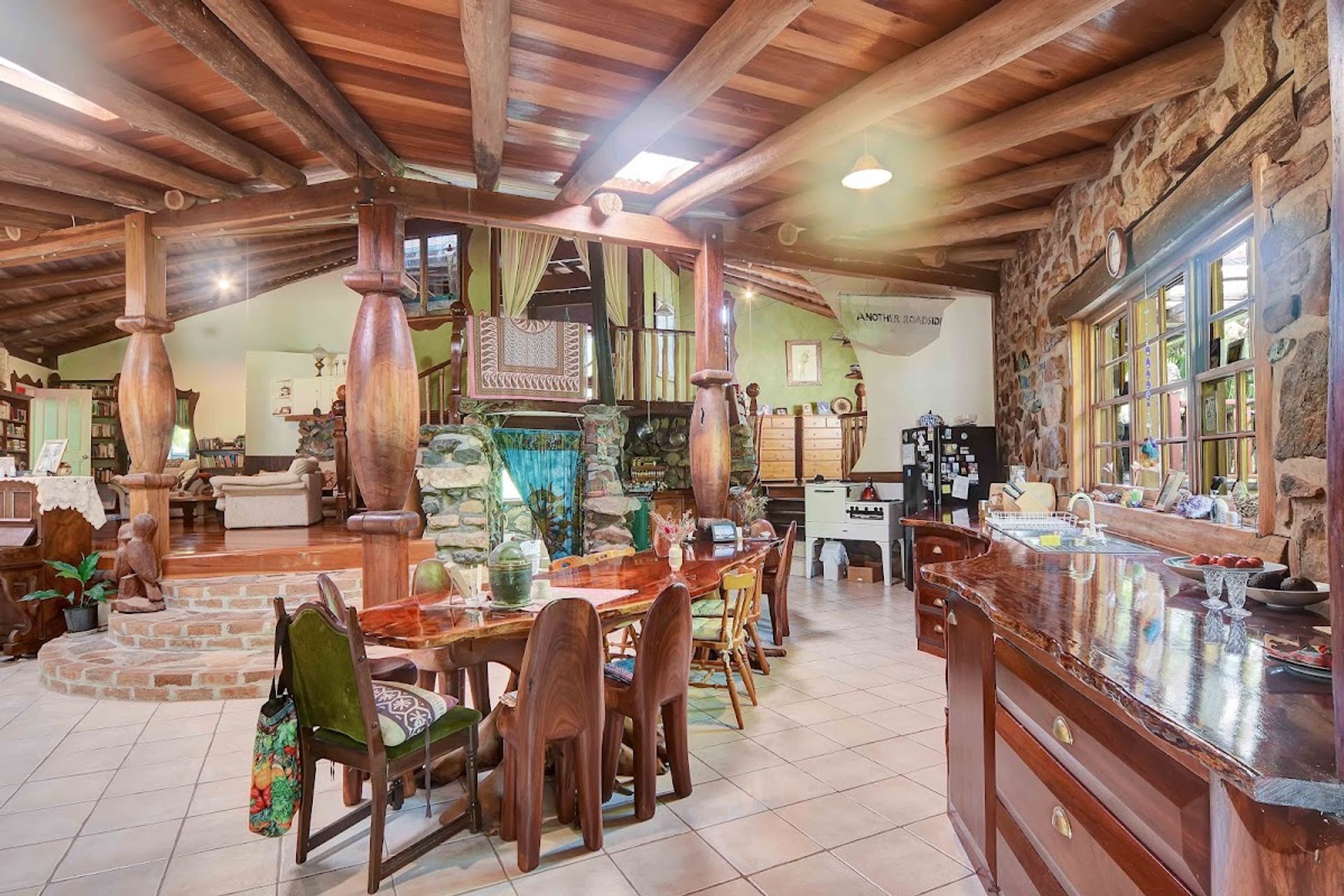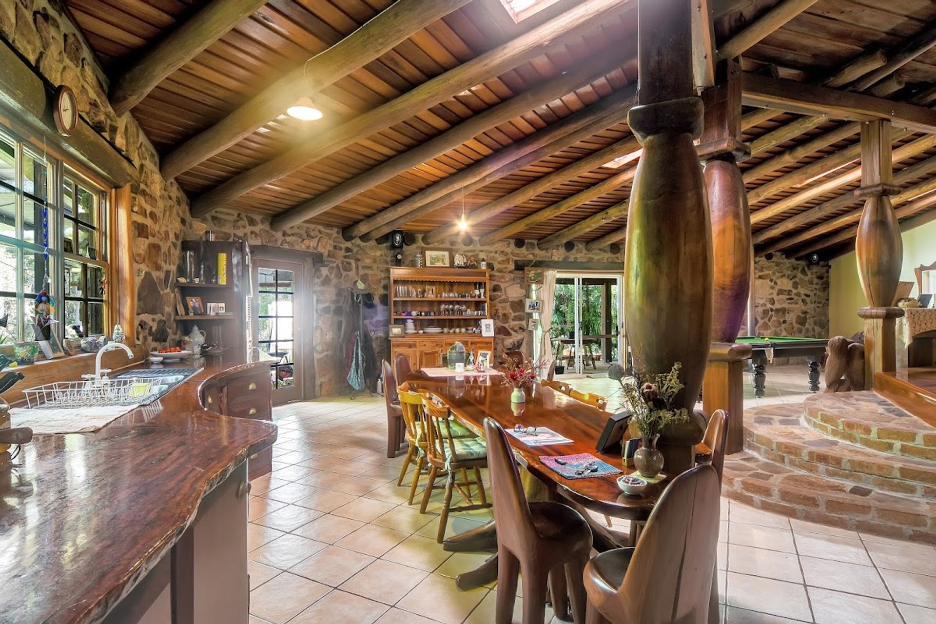 The kitchen is massive with a stunning bloodwood benchtop, a gas cooktop and oven, a woodfired oven and stove. A hand carved red cedar timber table runs the length of the kitchen. Plenty of pot drawers and storage space.