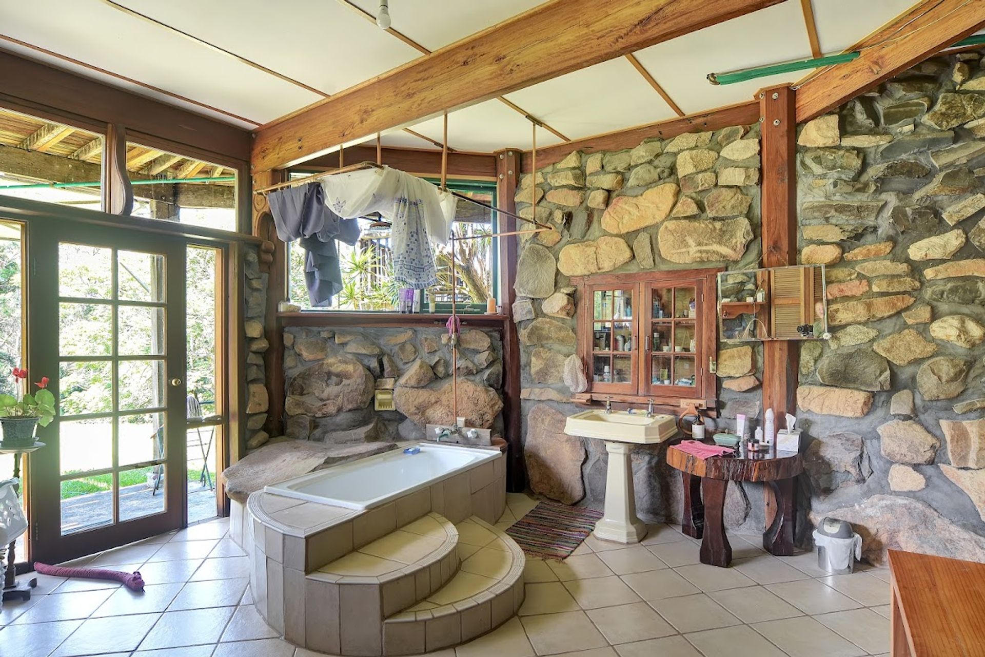 Combined laundry and bathroom is deliberately positioned at the lowest point of the house, to enable water to be gravity fed with ample pressure. The room features stone walls and timber supports with plenty of natural light. Shower is located above the bath and a couple of steps make it easy to access.