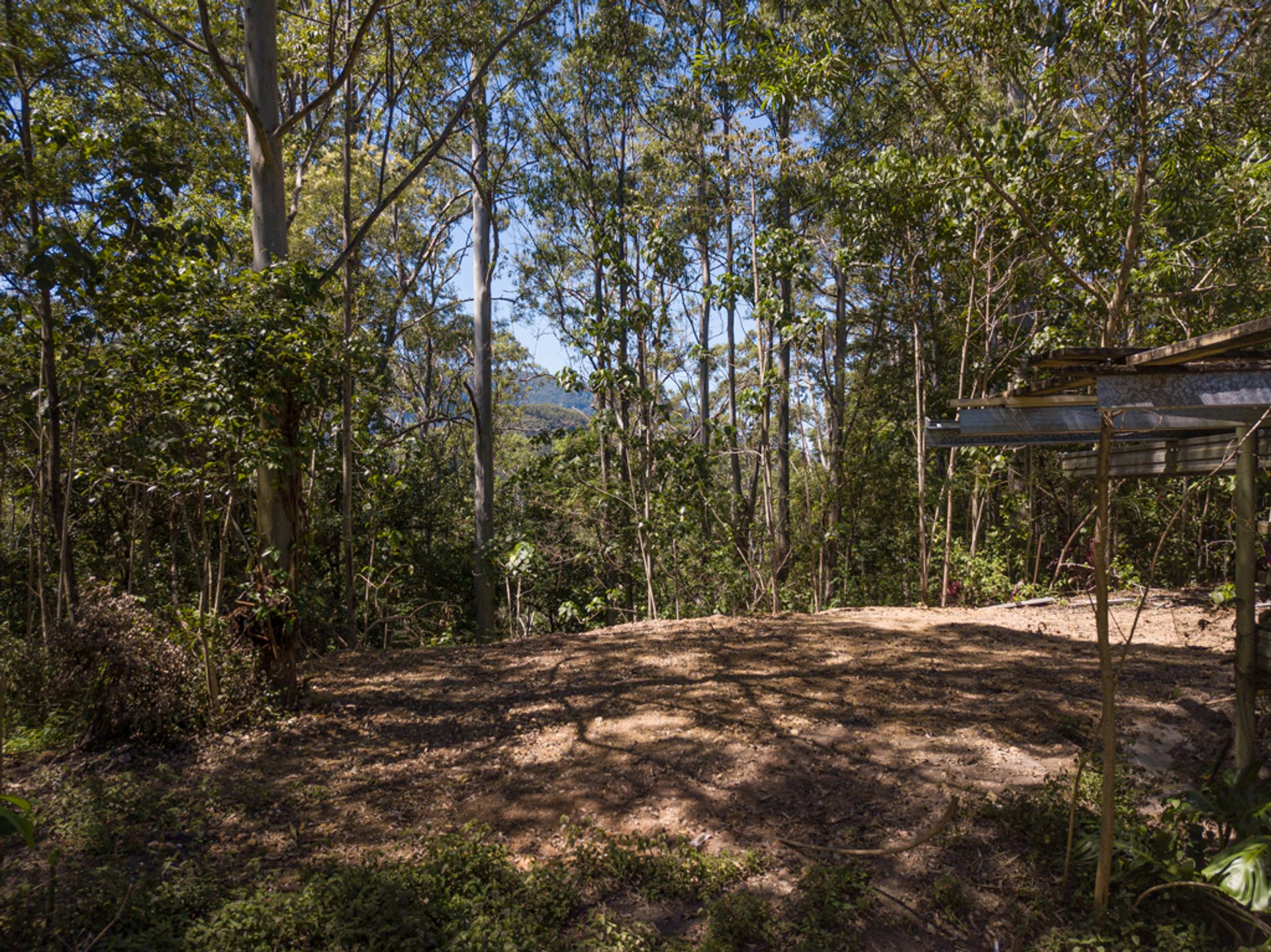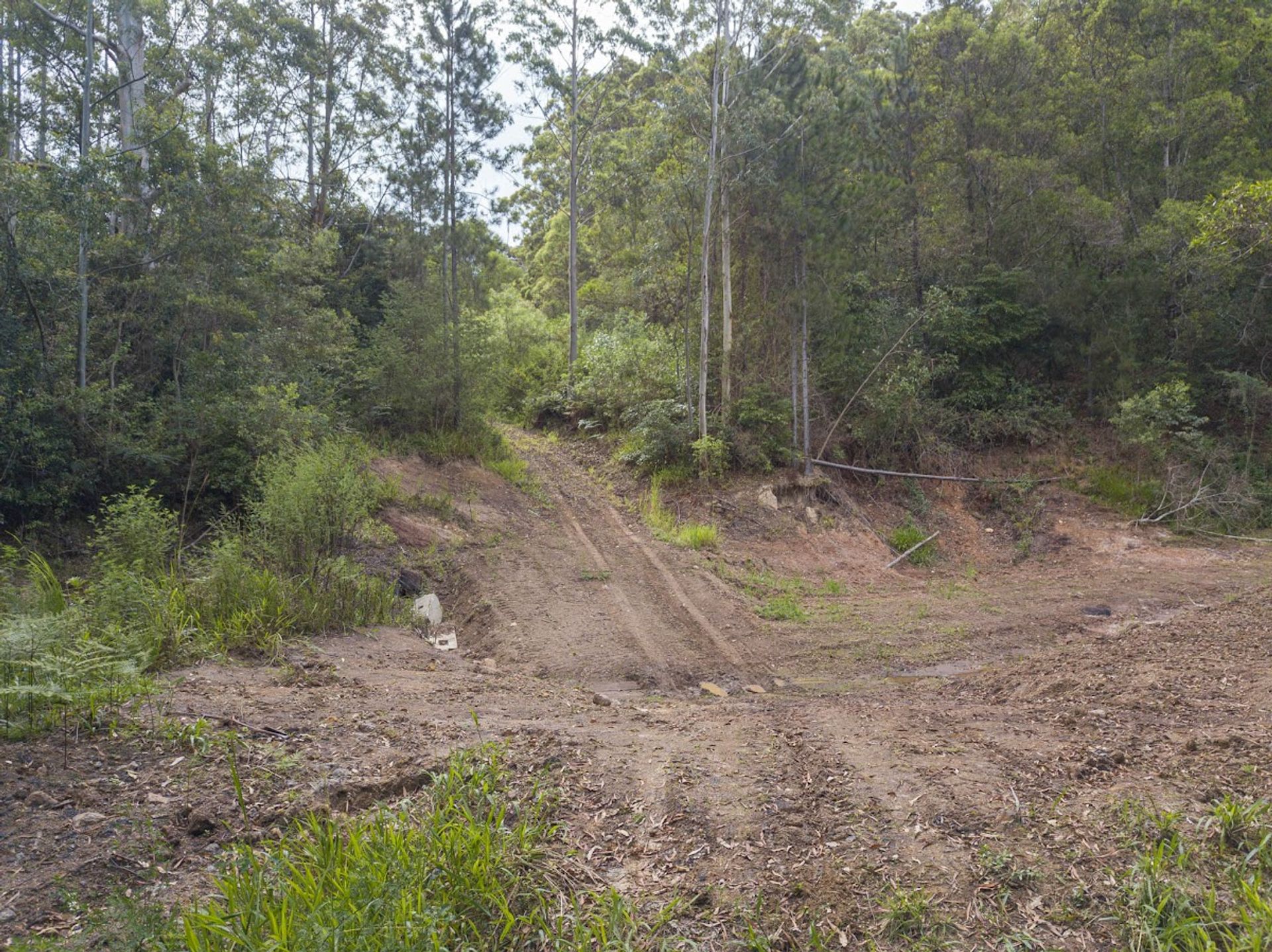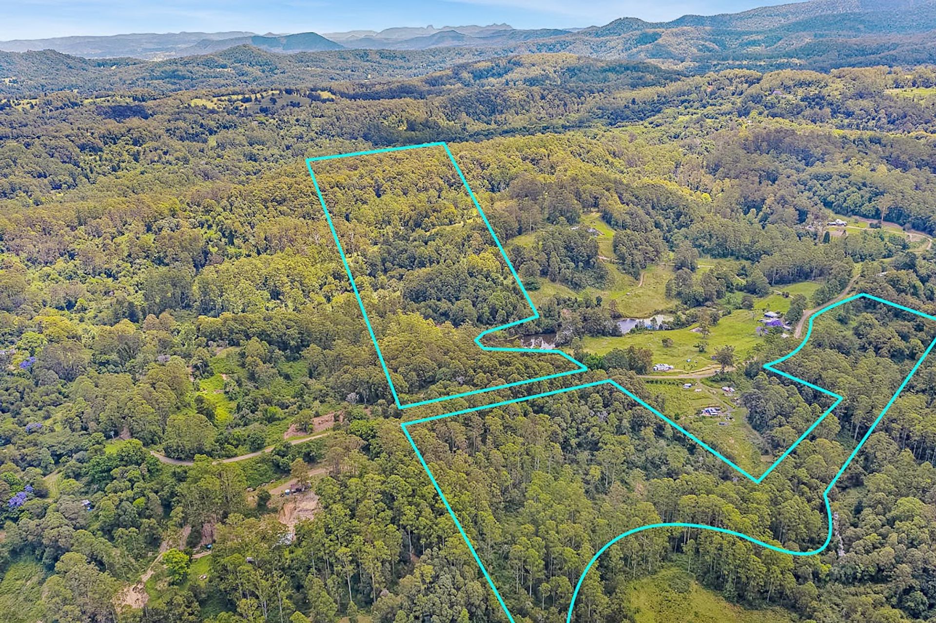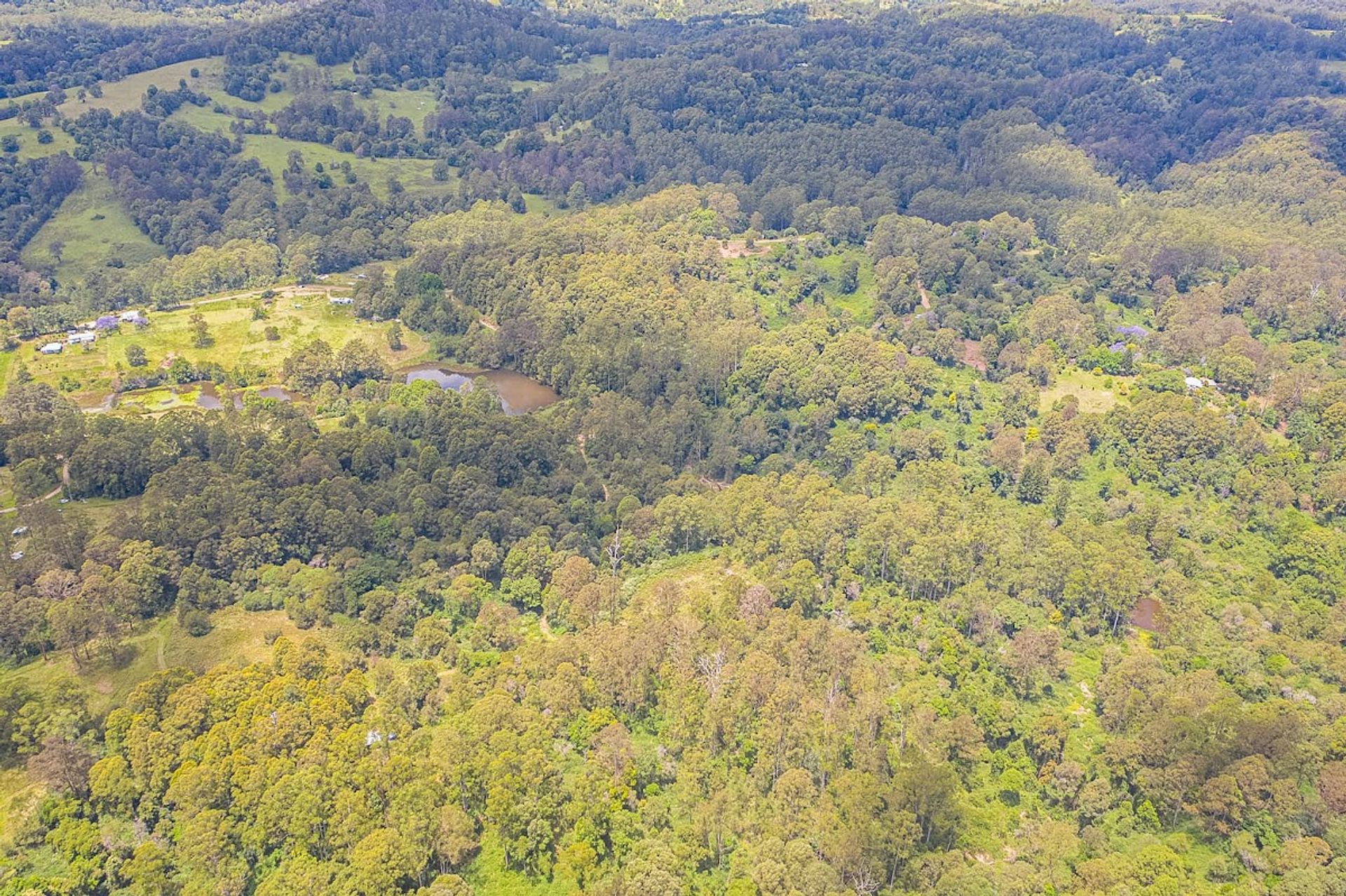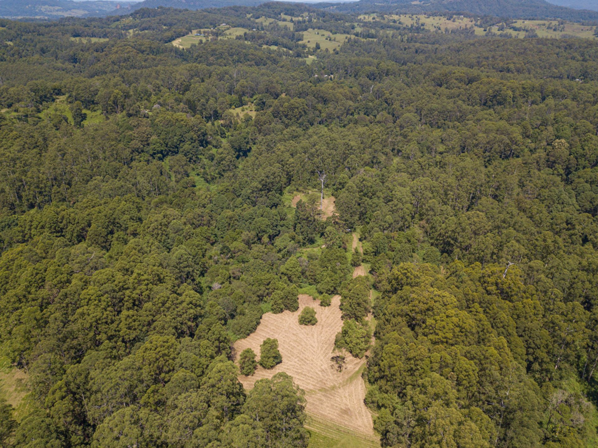 Split by the road, there is roughly 30Ha on the western side of Gabal Road & another 10Ha on the eastern side, the 10Ha is home to the steel structure, three 40ft shipping containers, (it has come to light that the structure has been built on a crown road) approx 800m of Websters Creek frontage & a noll that will deliver views of Mount Warning & Blue Knob. The Western 30Ha is very large & diverse, it has two natural waterways, one of which you cross on an internal track to get to the elevated plateaus & open shed.