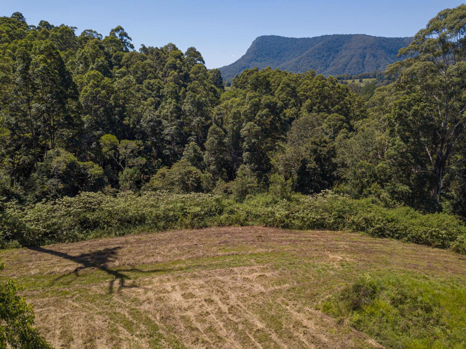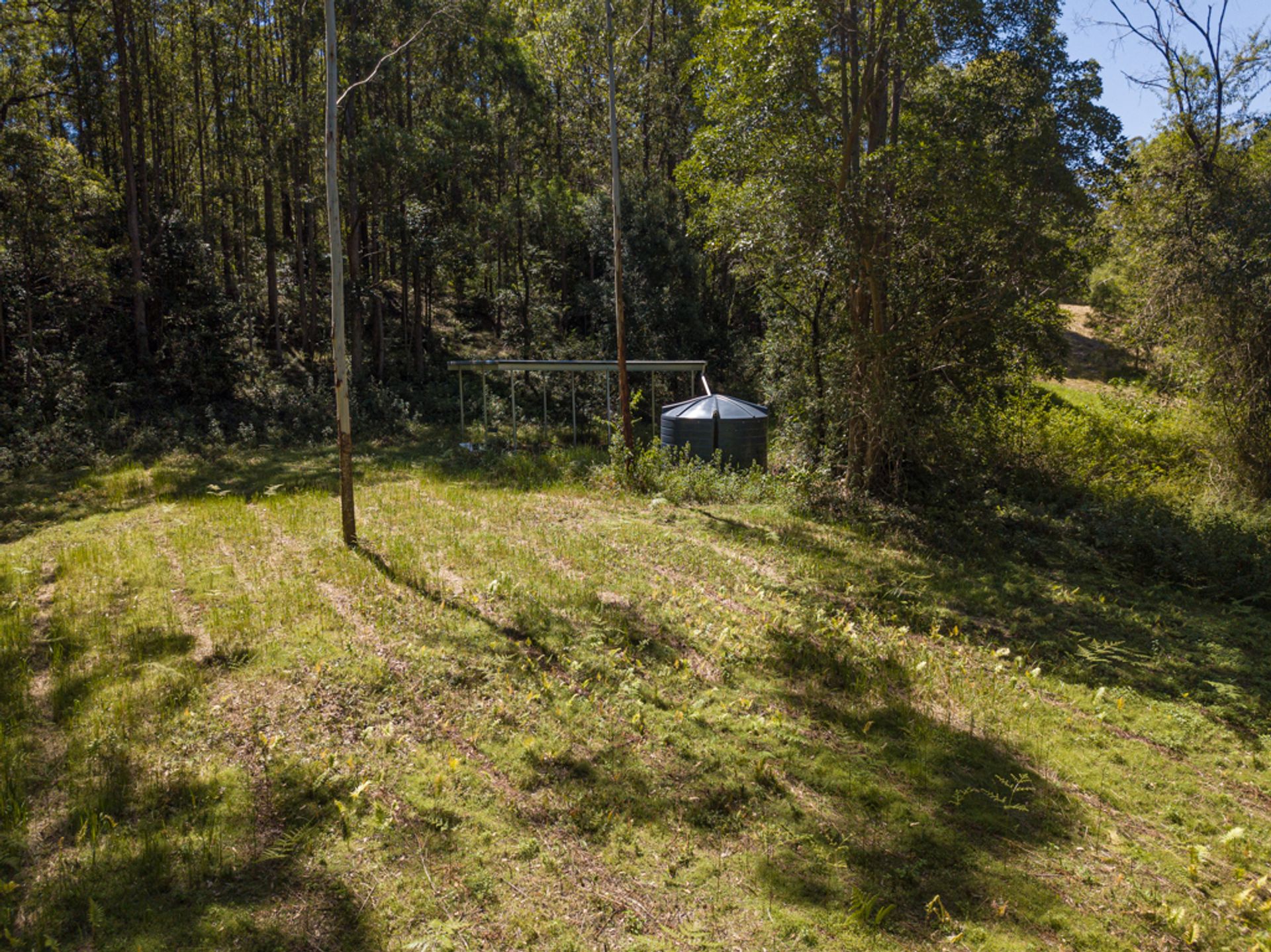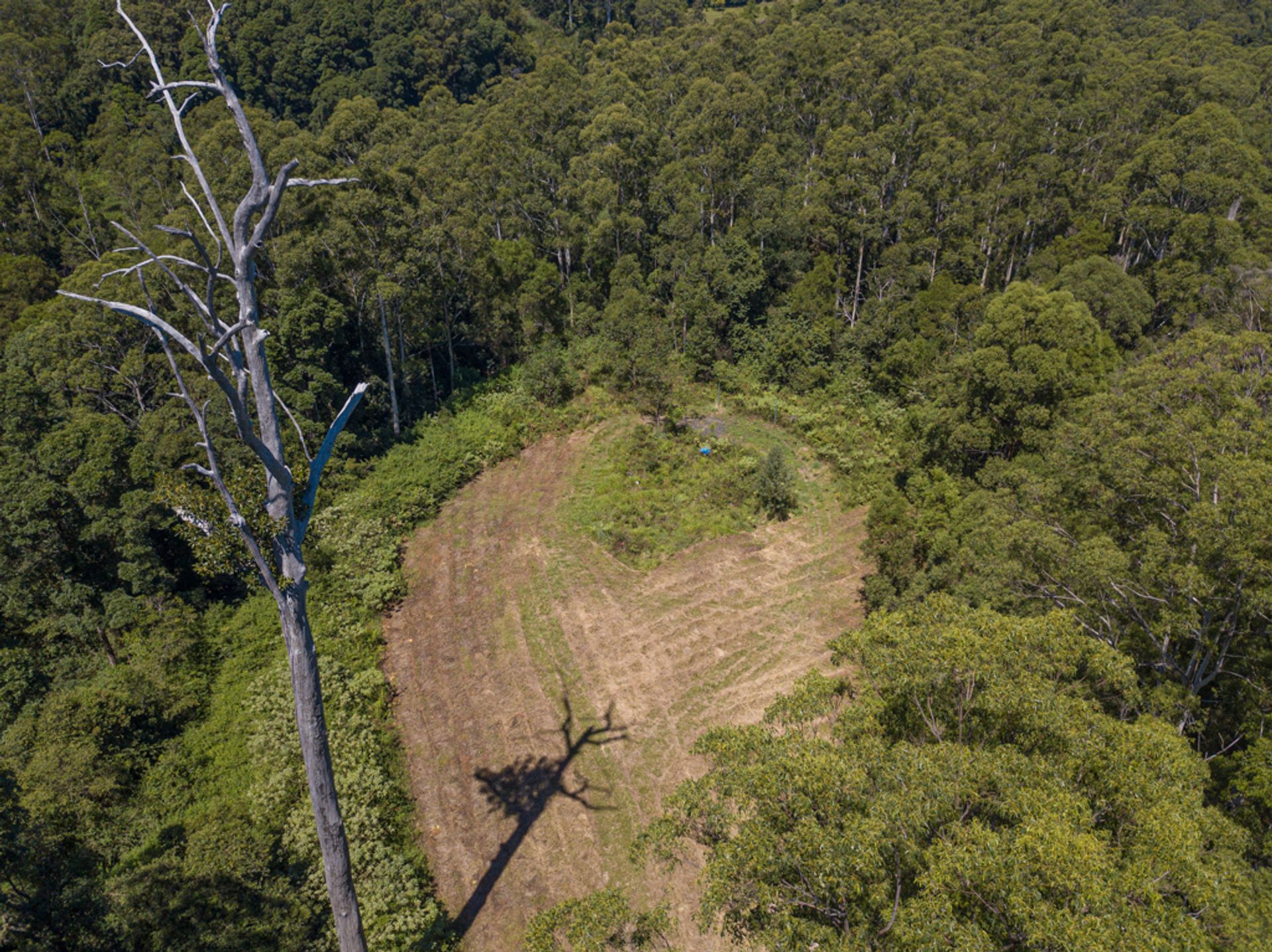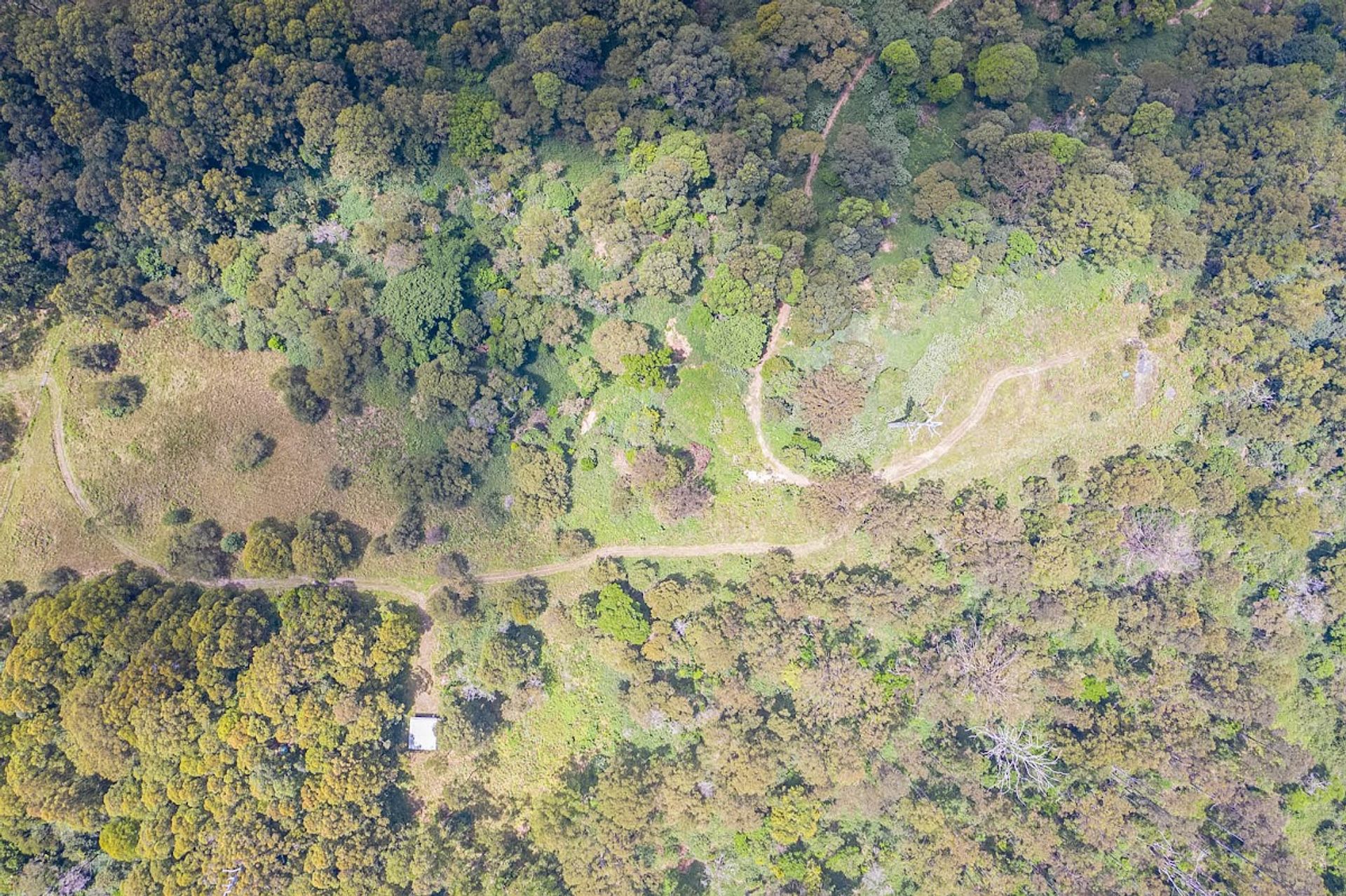 Split by the road, there is roughly 30Ha on the western side of Gabal Road & another 10Ha on the eastern side, the 10Ha is home to the steel structure, three 40ft shipping containers, (it has come to light that the structure has been built on a crown road) approx 800m of Websters Creek frontage & a noll that will deliver views of Mount Warning & Blue Knob. The Western 30Ha is very large & diverse, it has two natural waterways, one of which you cross on an internal track to get to the elevated plateaus & open shed.