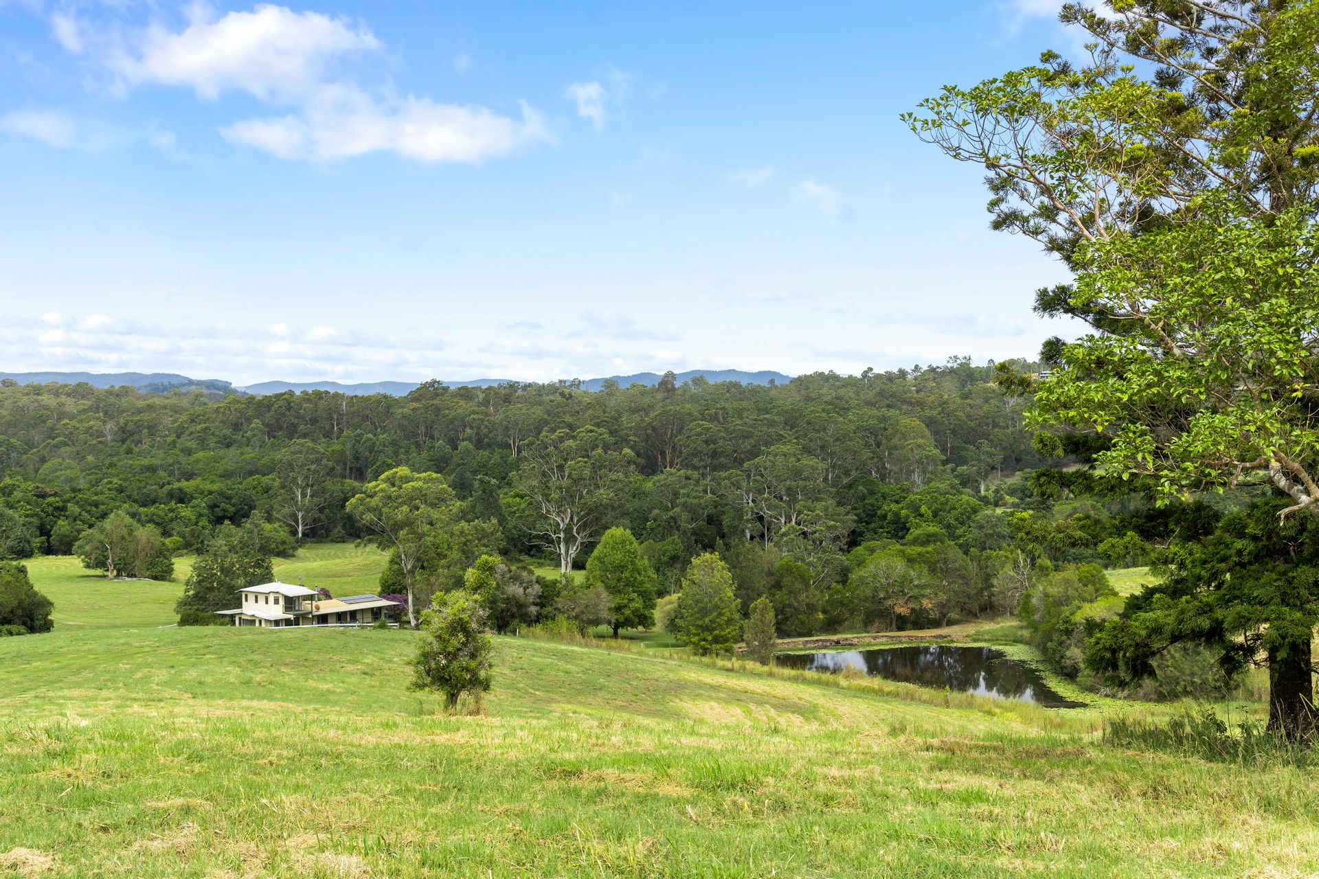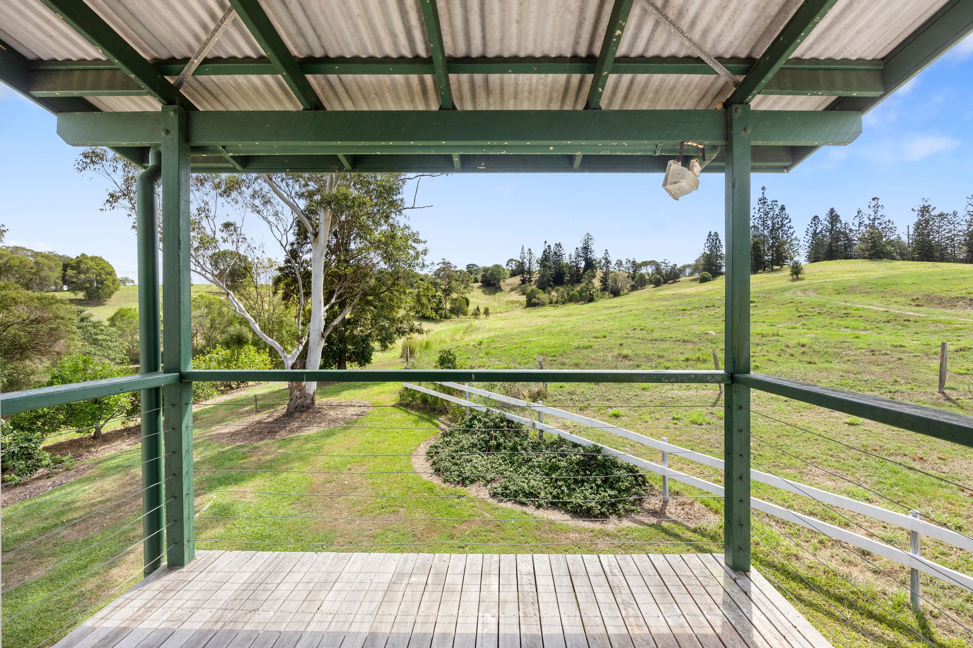 The split-level home was built in 1984 and is designed to maximize the panoramic views over rich creek flats to steeper ridge country. It incorporates character features like raked exposed beam ceilings and timber floors. The main level includes an air-conditioned open plan living area with bay window and combustion fireplace, a country kitchen with gas cooking, plus a separate spacious family room. Verandahs on both sides give you a choice of options for relaxing and enjoying the fresh air and tranquil outlook.