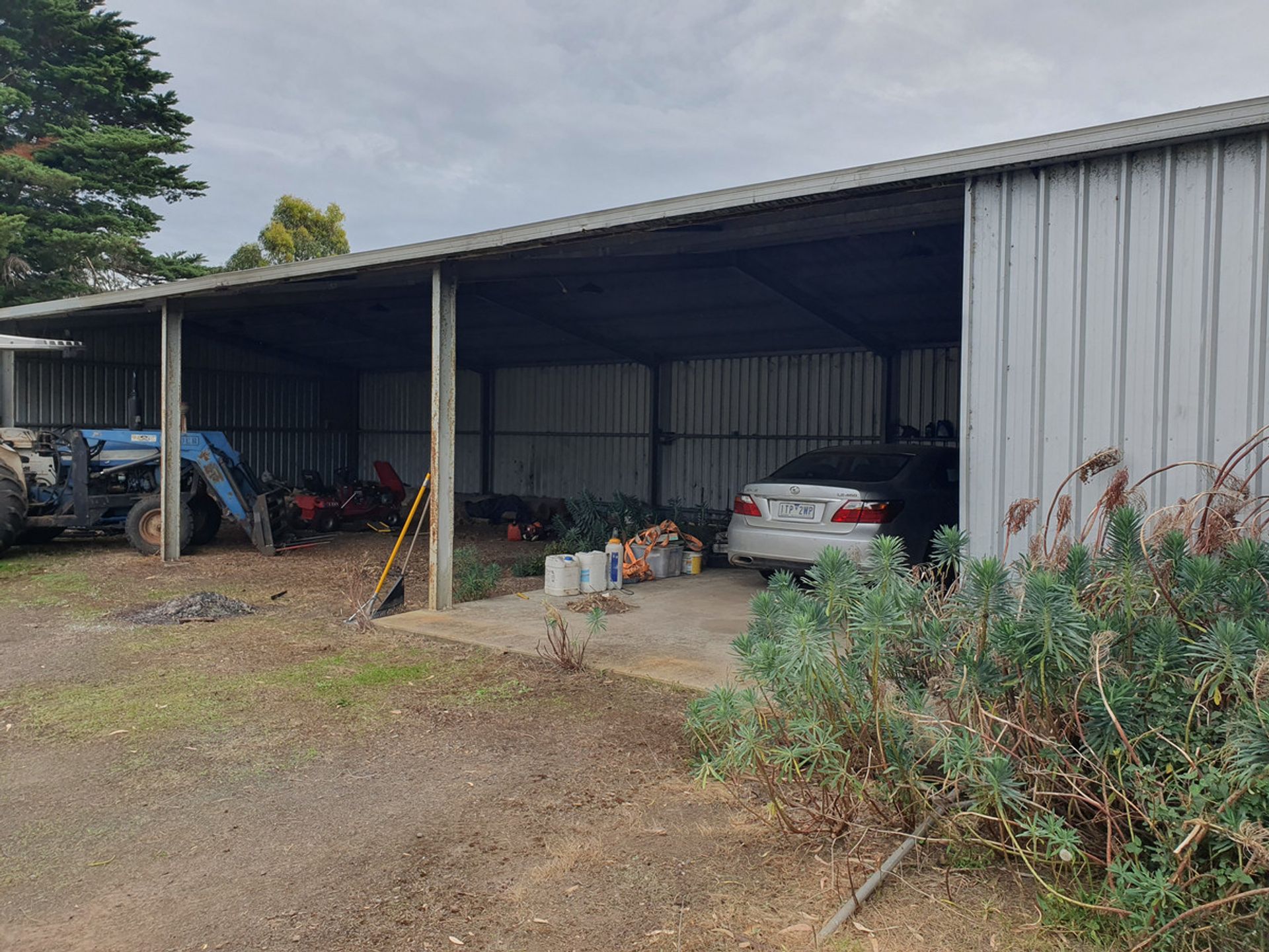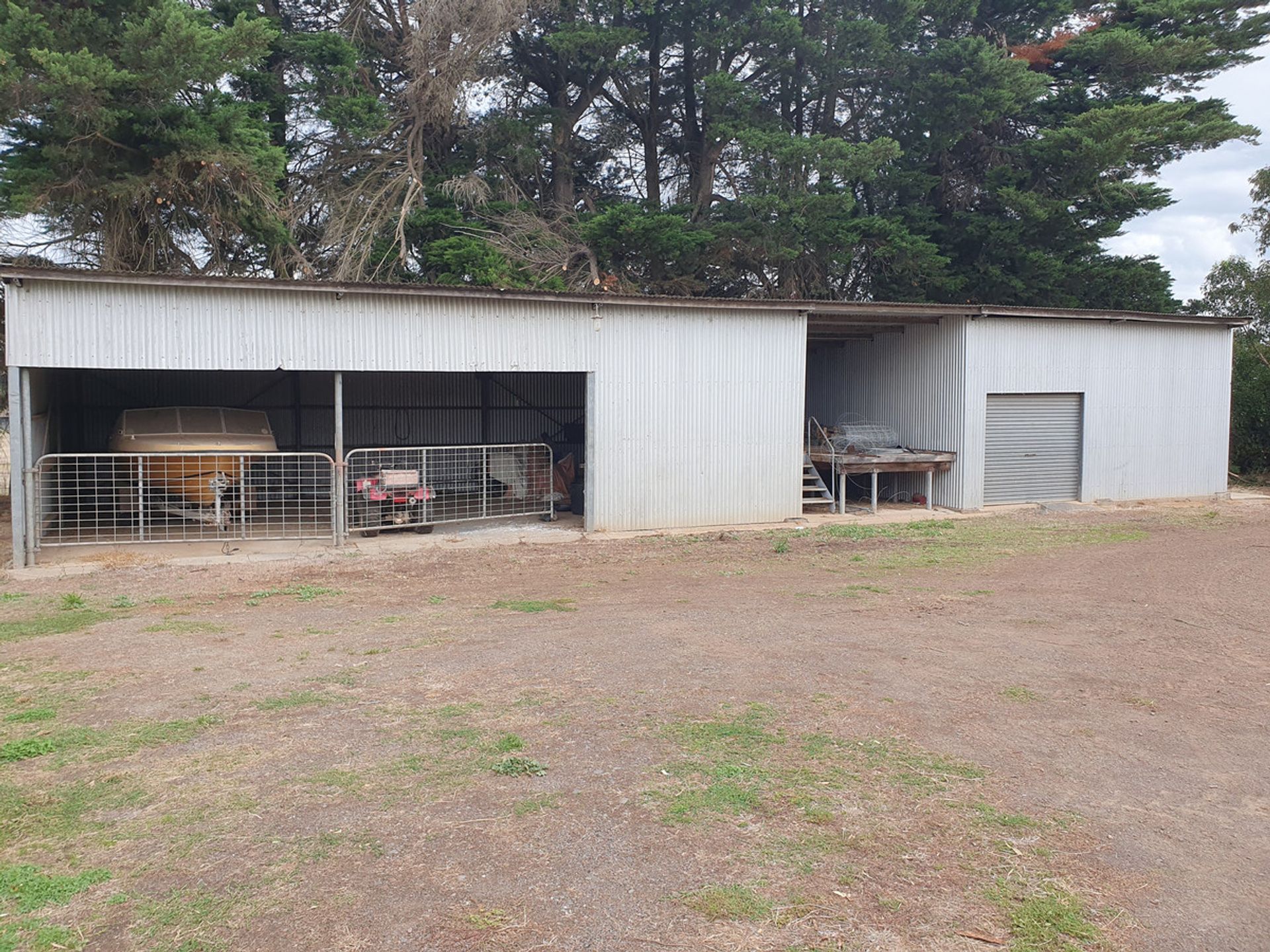 Workshop and garage- galvanised iron shed with side and rear walls, with one bay enclosed. 3 bay hay shed with galvanised iron roof.
