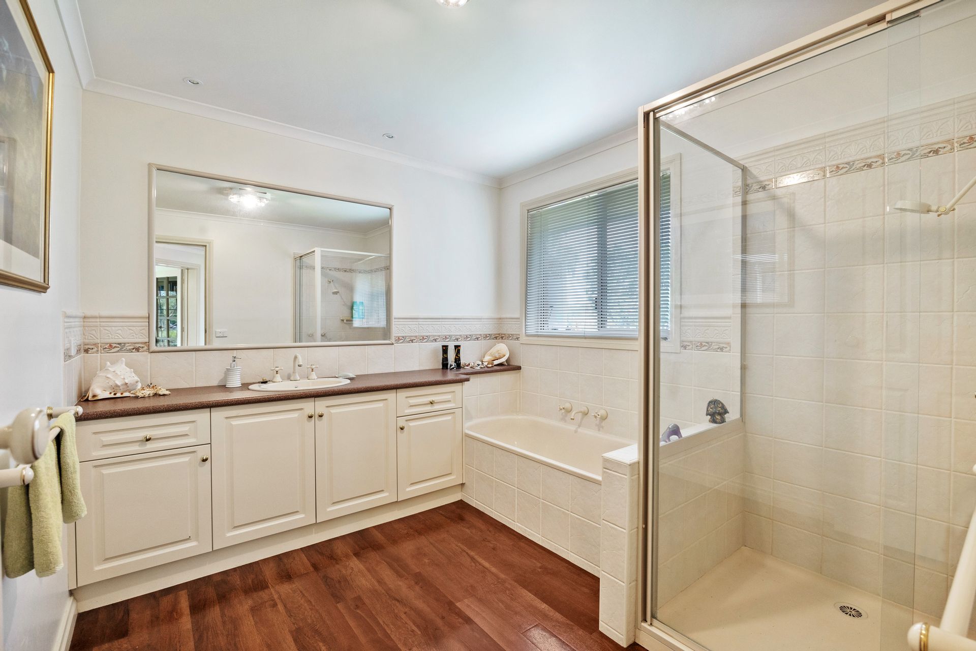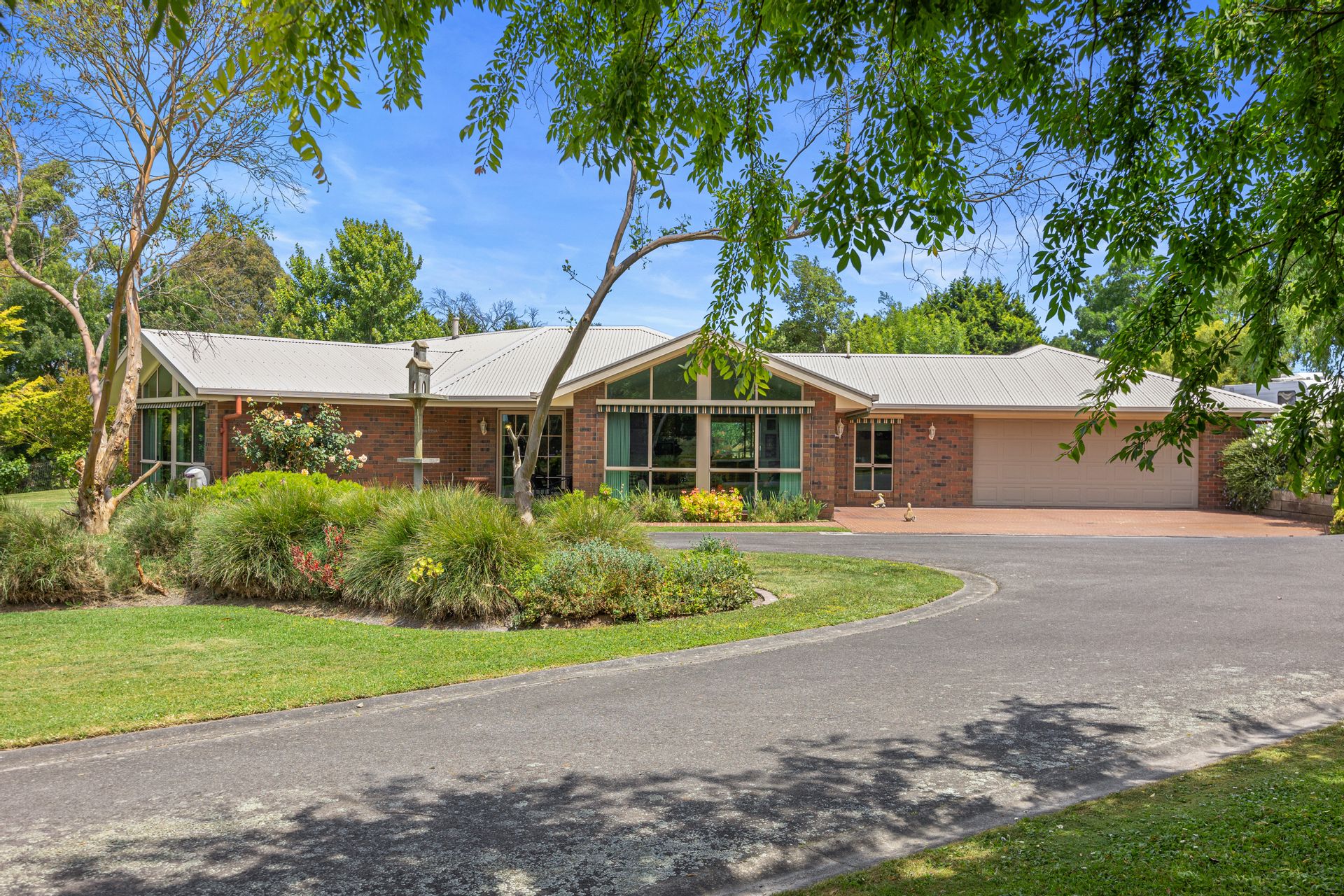 The double remote-controlled garage is accessed directly from the driveway, which then sweeps on past the house to the high clearance 9m x 12m steel shed at the rear.