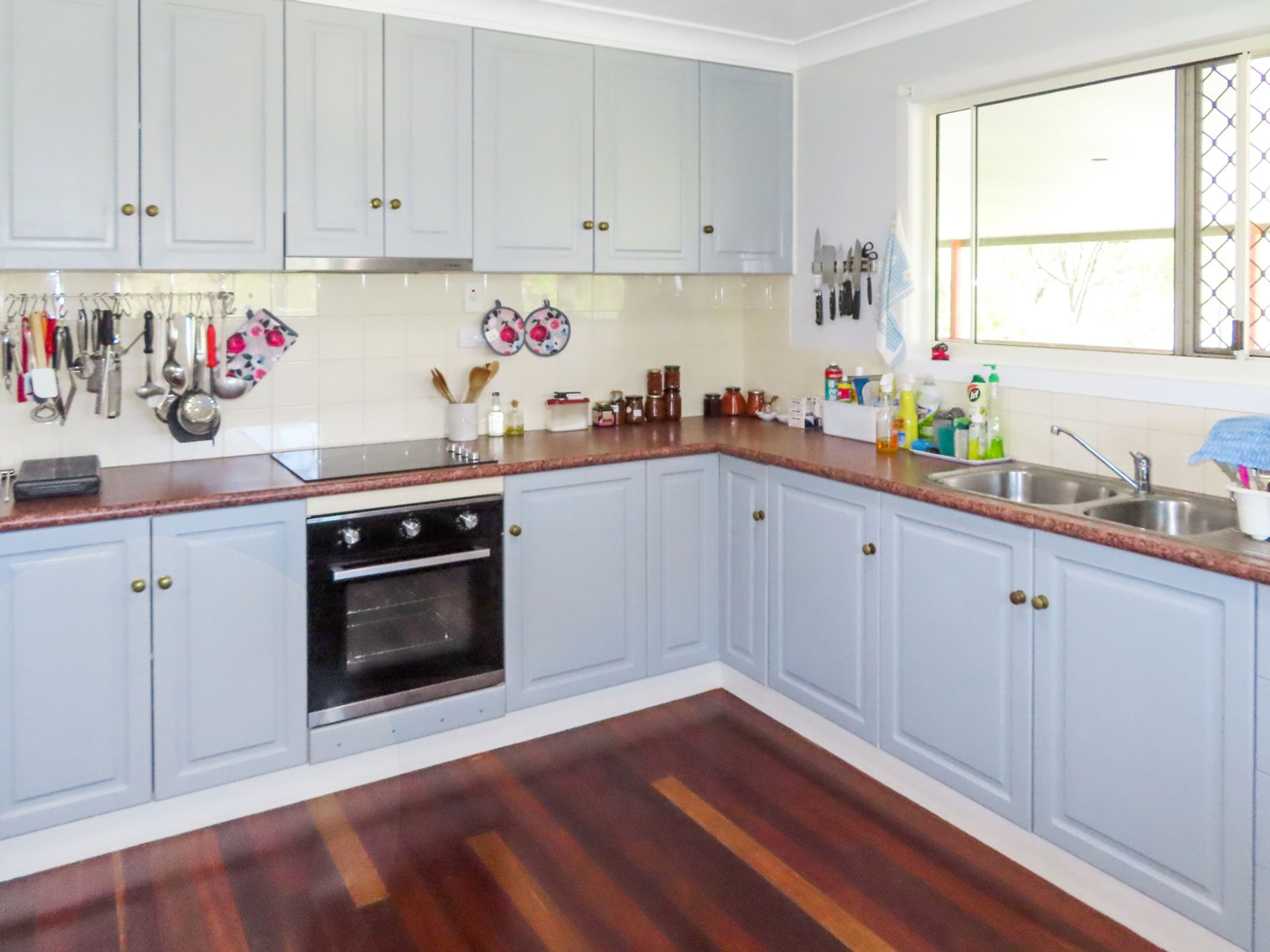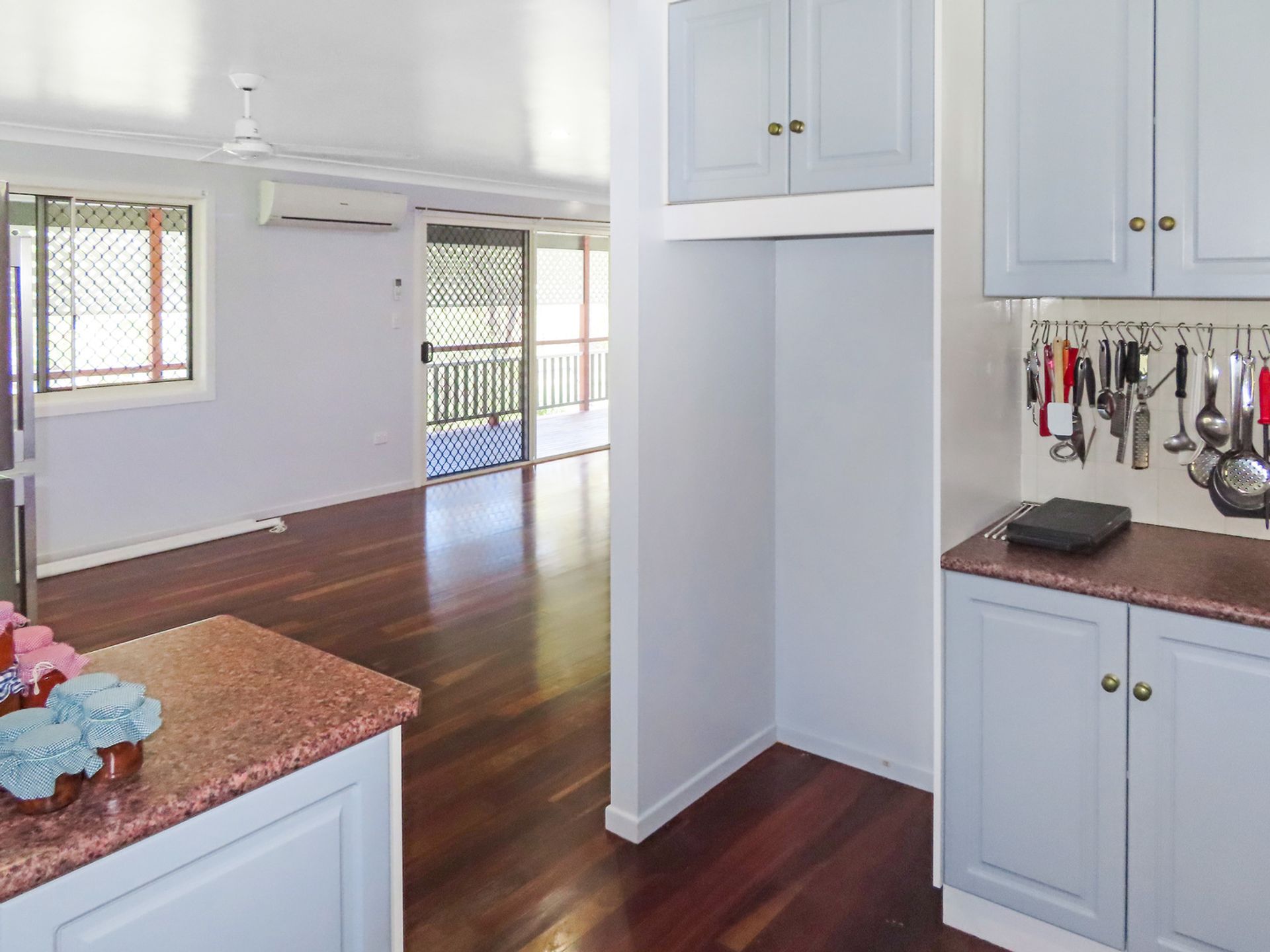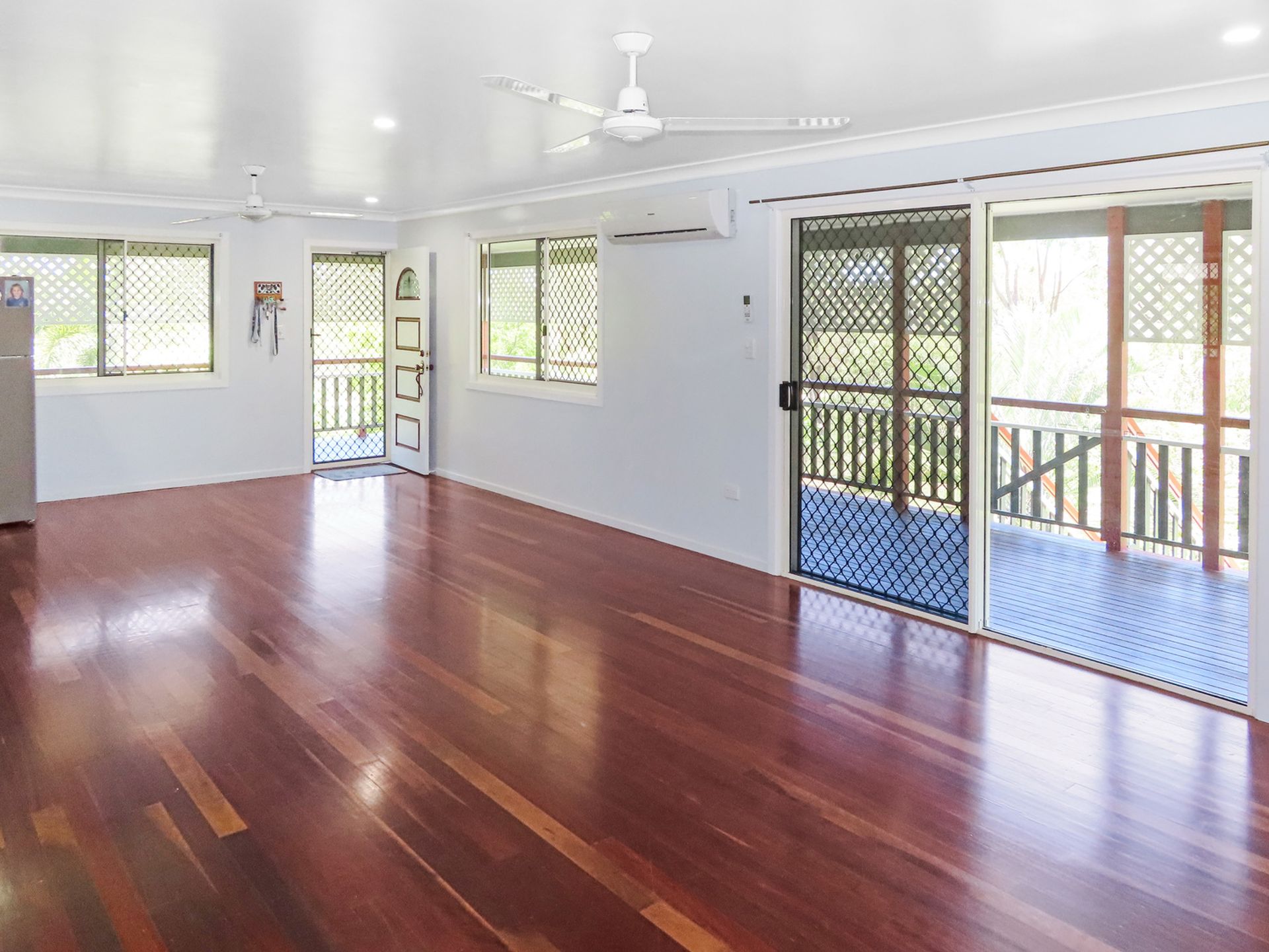 The home is security screened and there it is fully air-conditioned - 6 split systems. Downstairs is tiled while upstairs has glorious spotted gum polished timber floors.