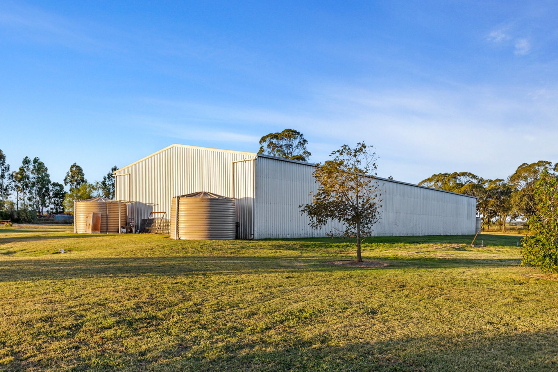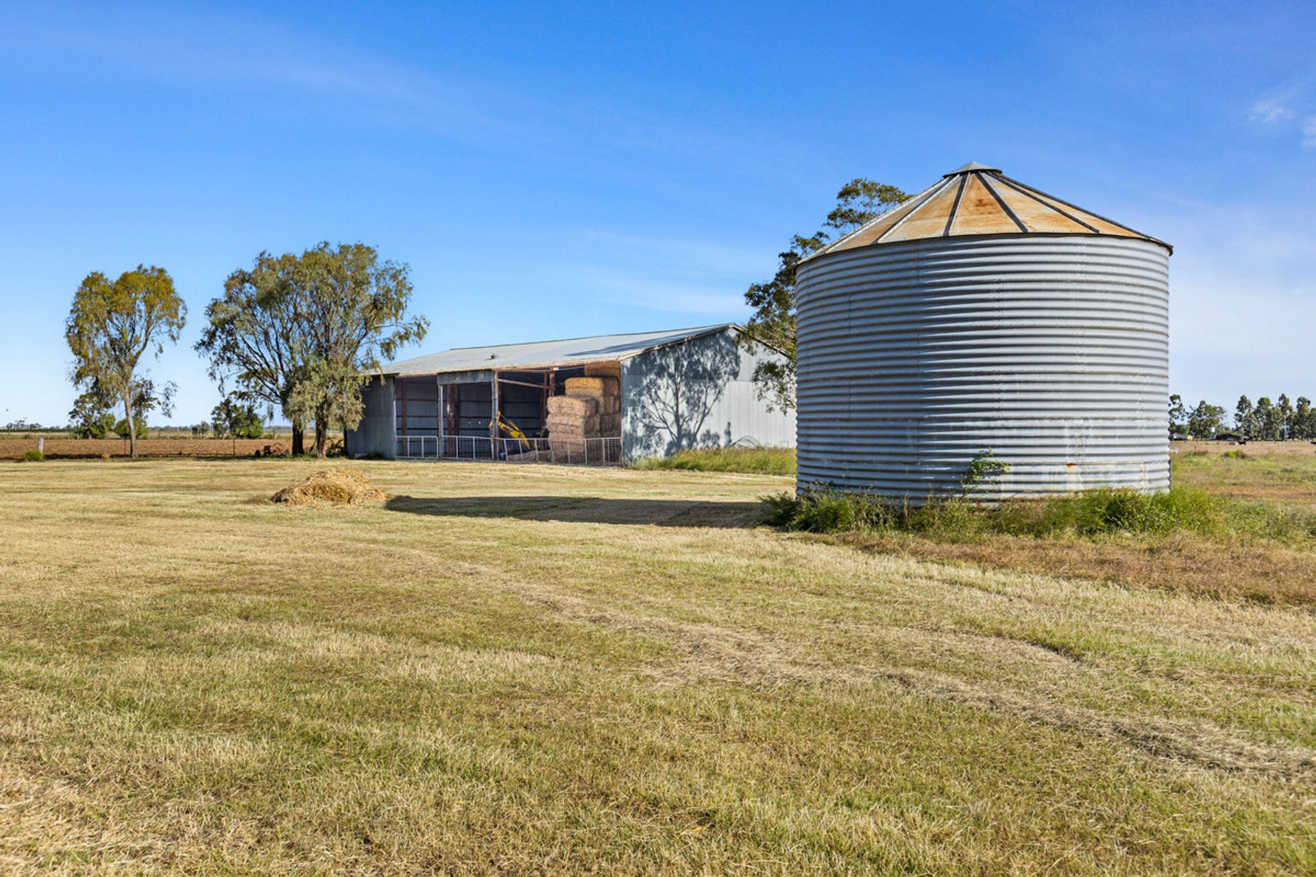 Improvements - Machinery shed approx 42m x 15m with 3 phase power and incorporates a workshop with concrete floor in two bays which is fully lockable and has a 4-post vehicle hoist + Hay Shed 20 x 15m – open front with one concrete bay and gravel floor.