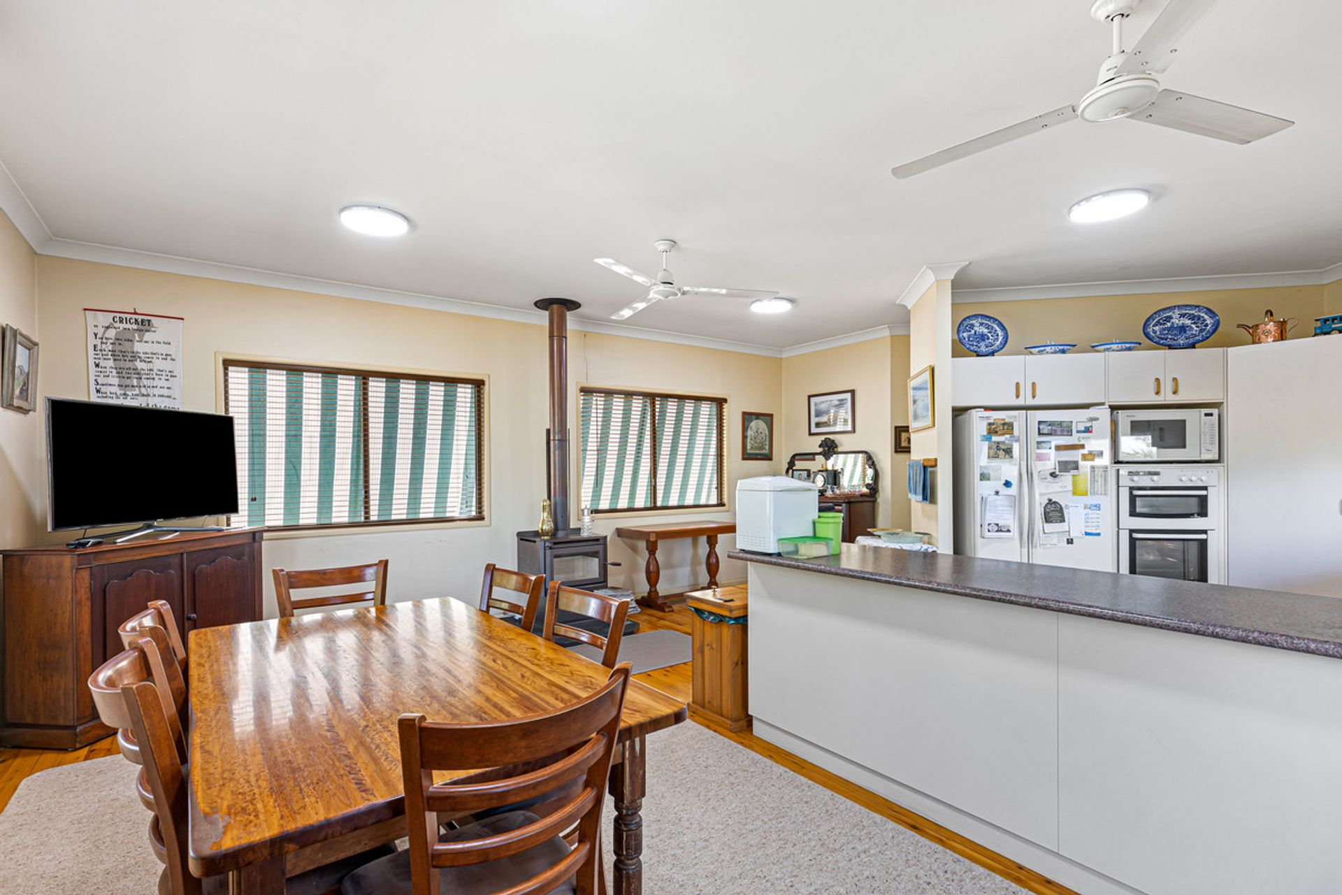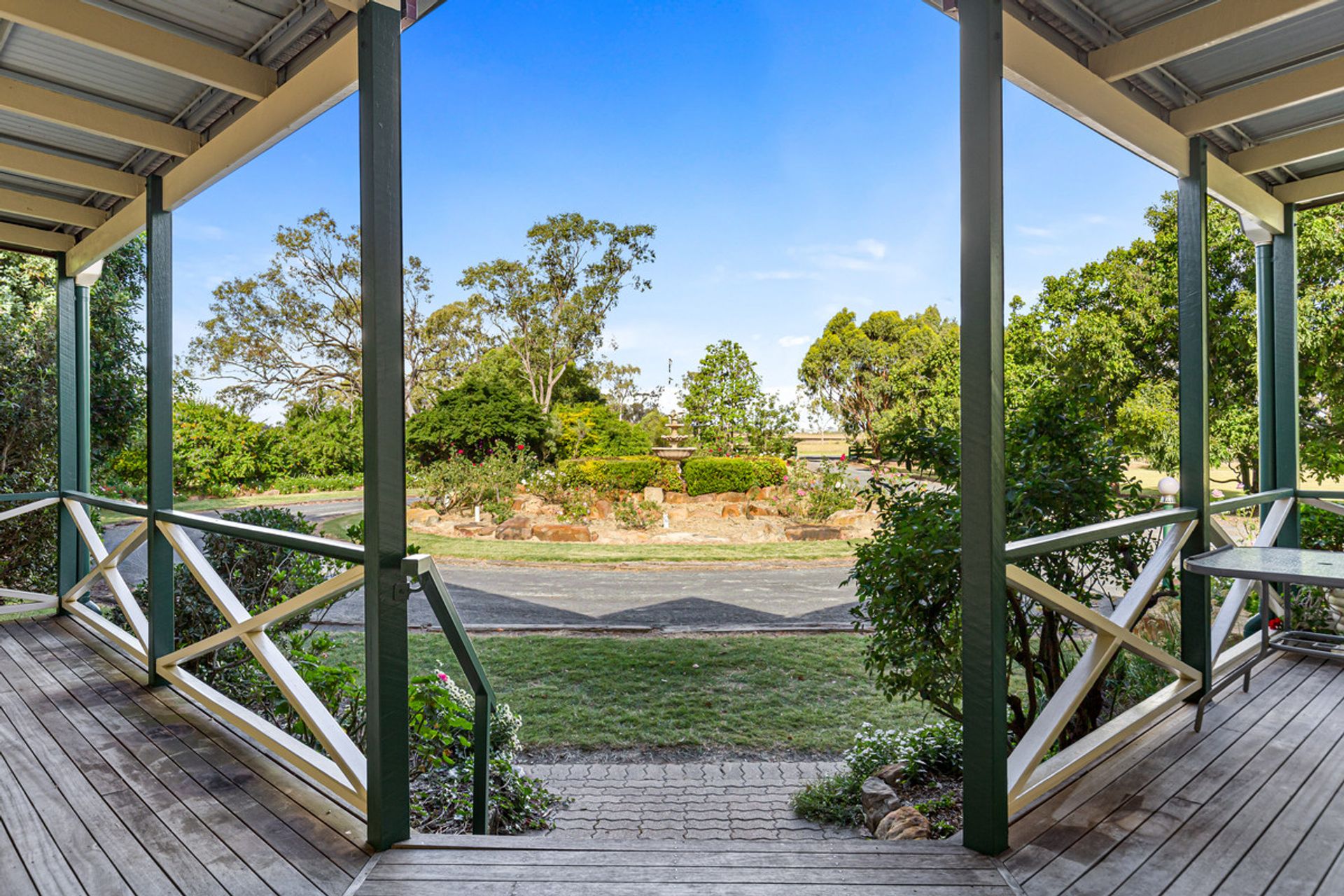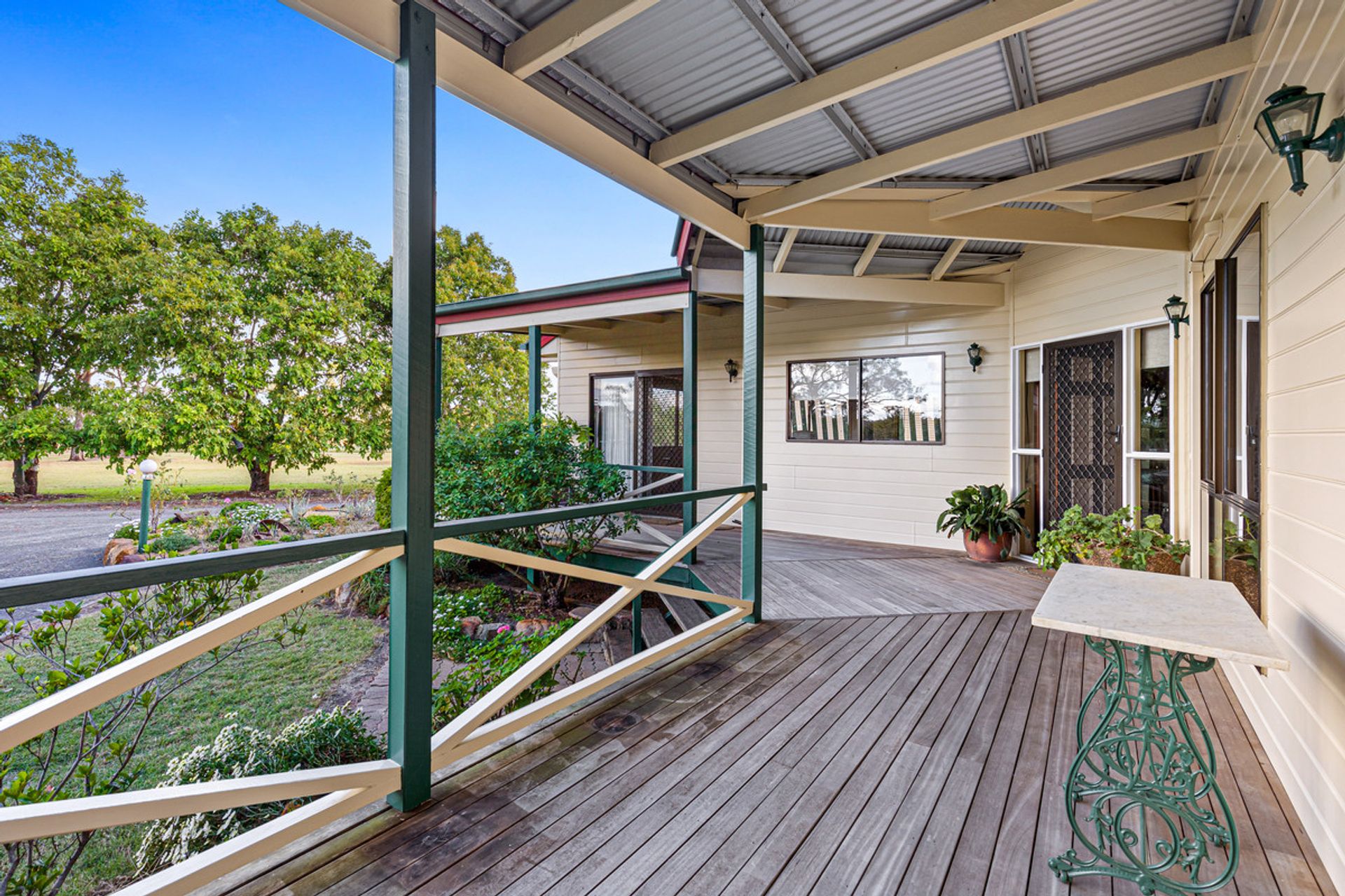 Homestead – The open plan lounge and kitchen/dining areas with fireplaces provide a cozy and inviting atmosphere for family and guests. The inclusion of a reverse cycle air conditioning systems + ceiling fans in these areas also makes it possible to regulate the temperature to ensure comfort throughout the year. Having verandas both at the front and back of the home is also a nice touch. This allows for outdoor relaxation and entertainment while enjoying the surrounding environment. The use of polished timber flooring throughout the house creates a warm and welcoming feel, while also being easy to clean and maintain. The inclusion of an office space is a valuable feature for those who work from home or need a dedicated space for study and organization. With three bedrooms in total, this home is suitable for a small family or a couple who may require additional guest rooms or storage space. The main bedroom with ensuite and walk-in wardrobe is a luxurious feature that adds a touch of elegance to the home. The homestead gardens also have an integrated irrigation system to help with the upkeep all year round.