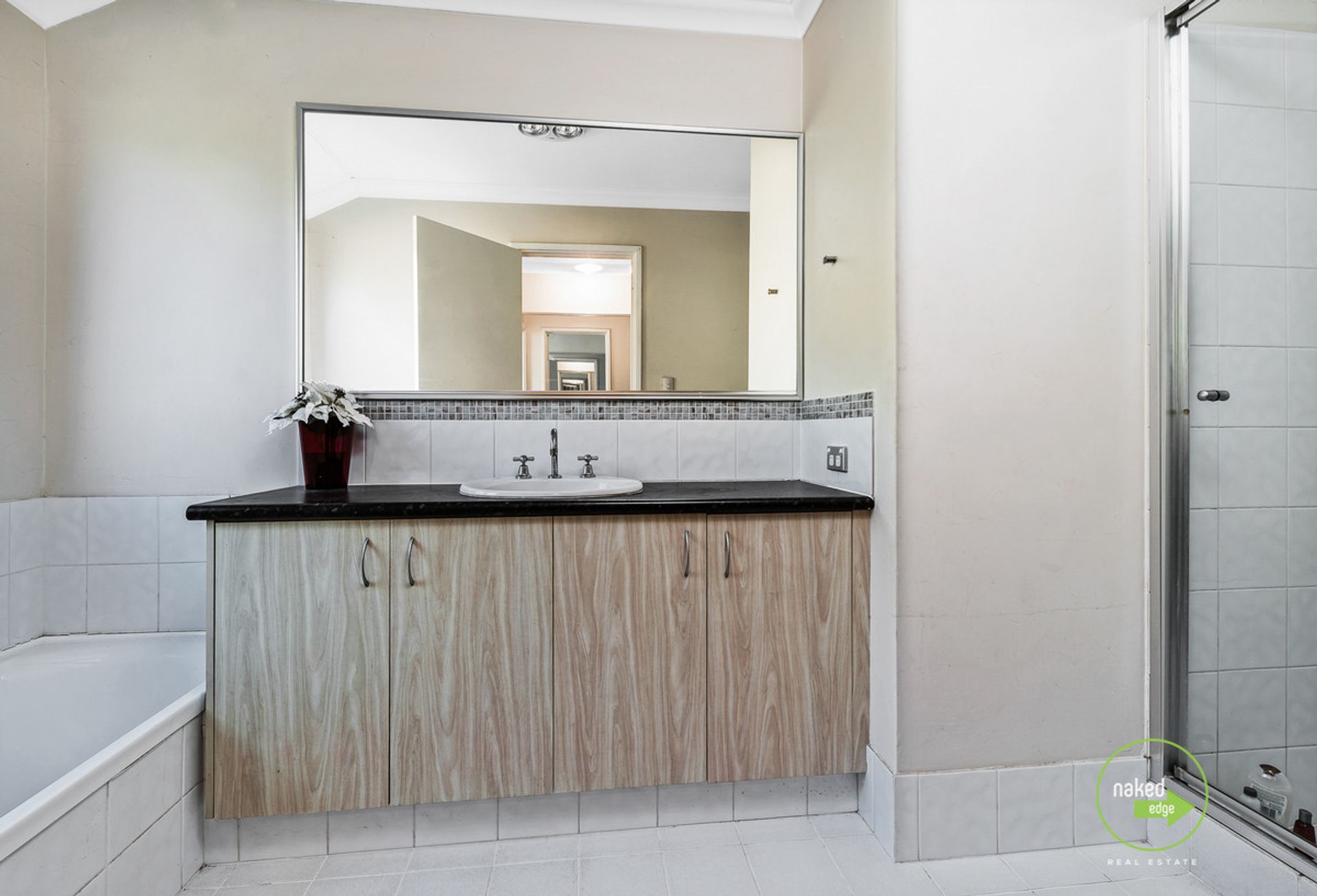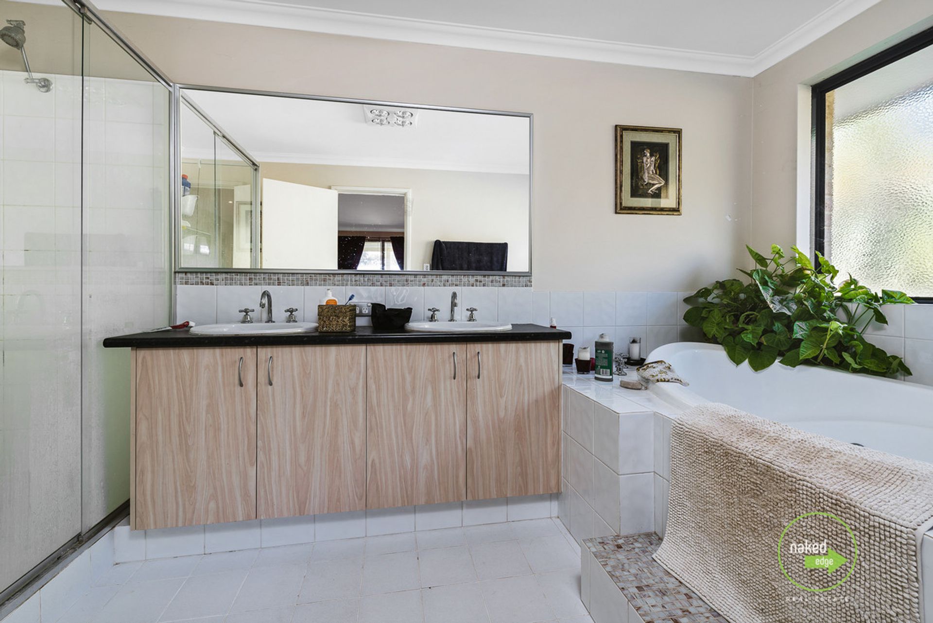 Spacious main bathroom, separate bath and shower