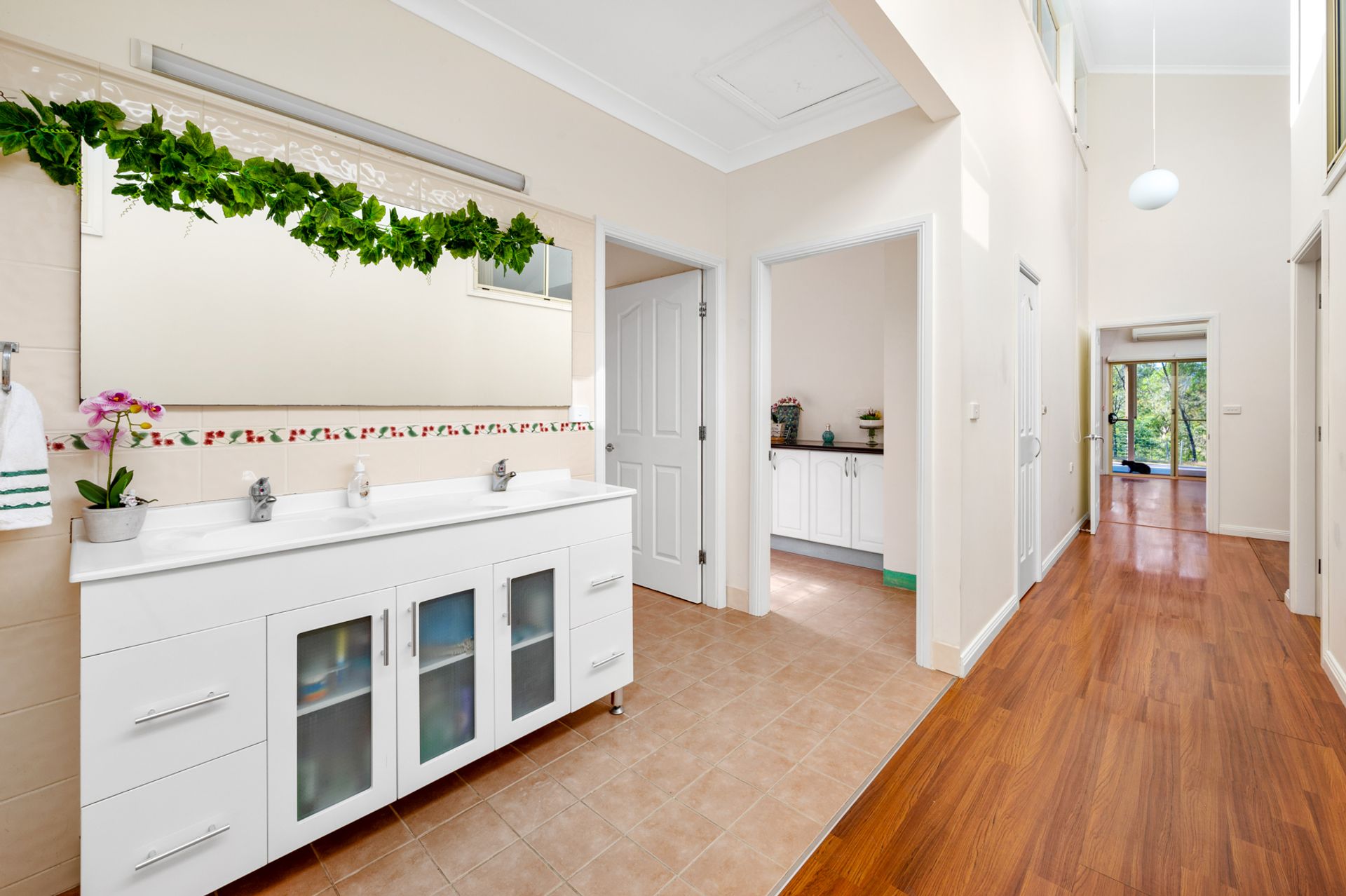 • Spacious main bathroom, with double vanity, corner bath, shower and toilet