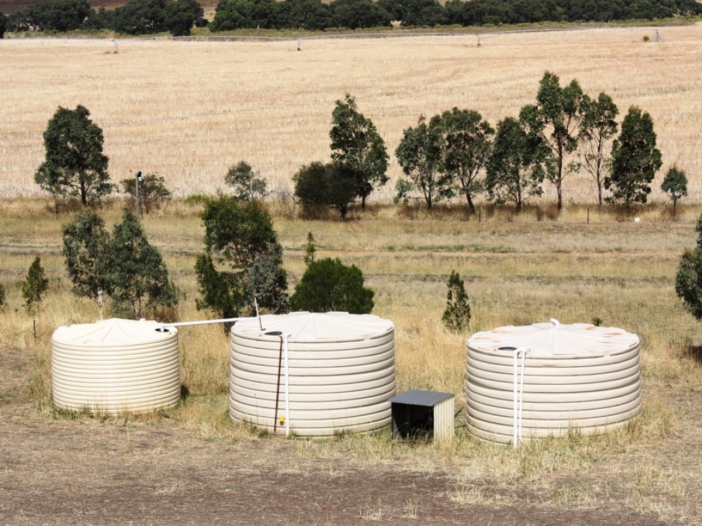 * Poly rainwater storage tanks for domestic consumption, river water for gardens, standpipe with freshwater for spraying purposes, 3 town water tappings