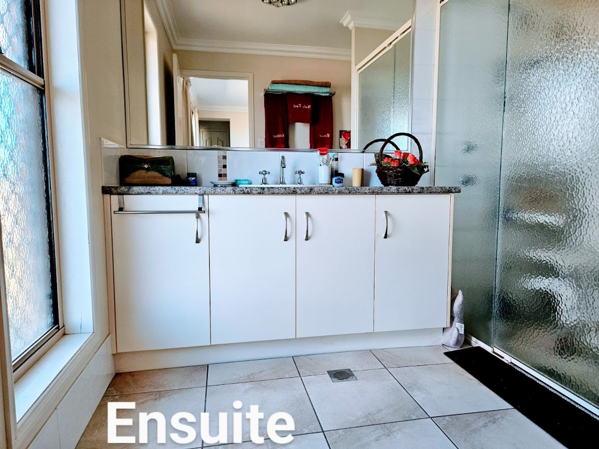 * Tiled family bathroom with vanity shower and bath.