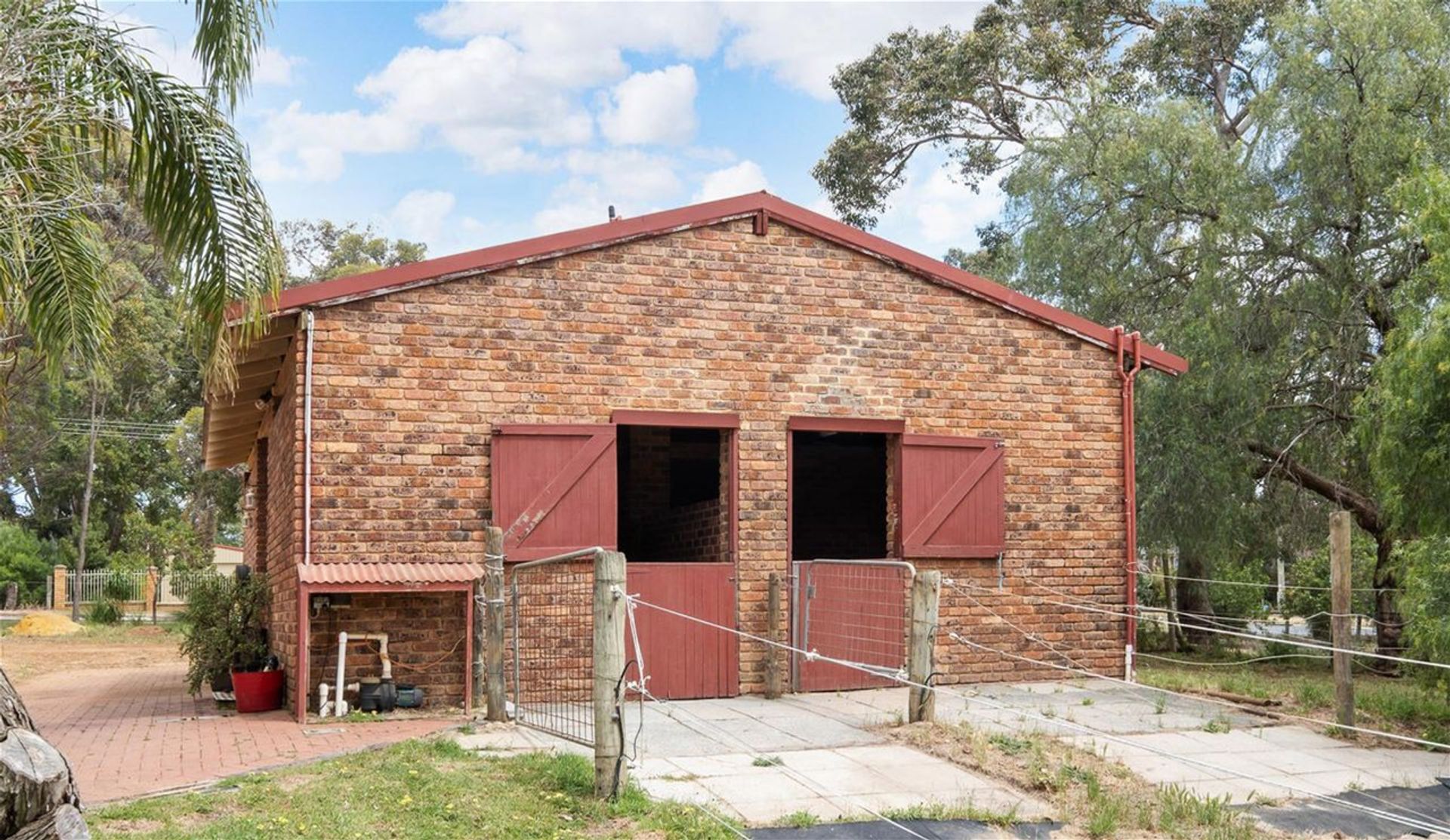 • Brick, three stall horse stables with WC and bath facilities. Exterior hot water wash-down area power and lighting.