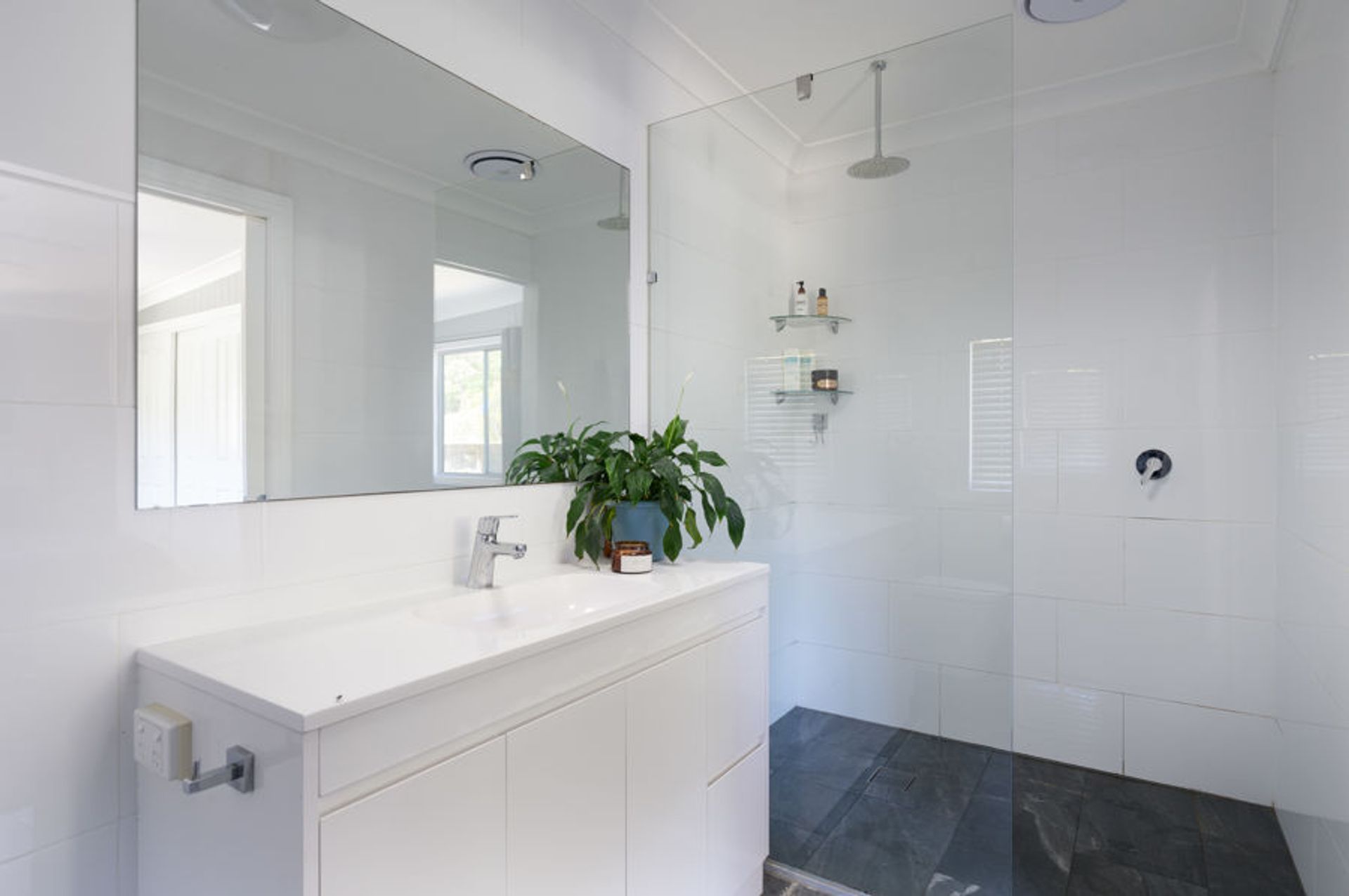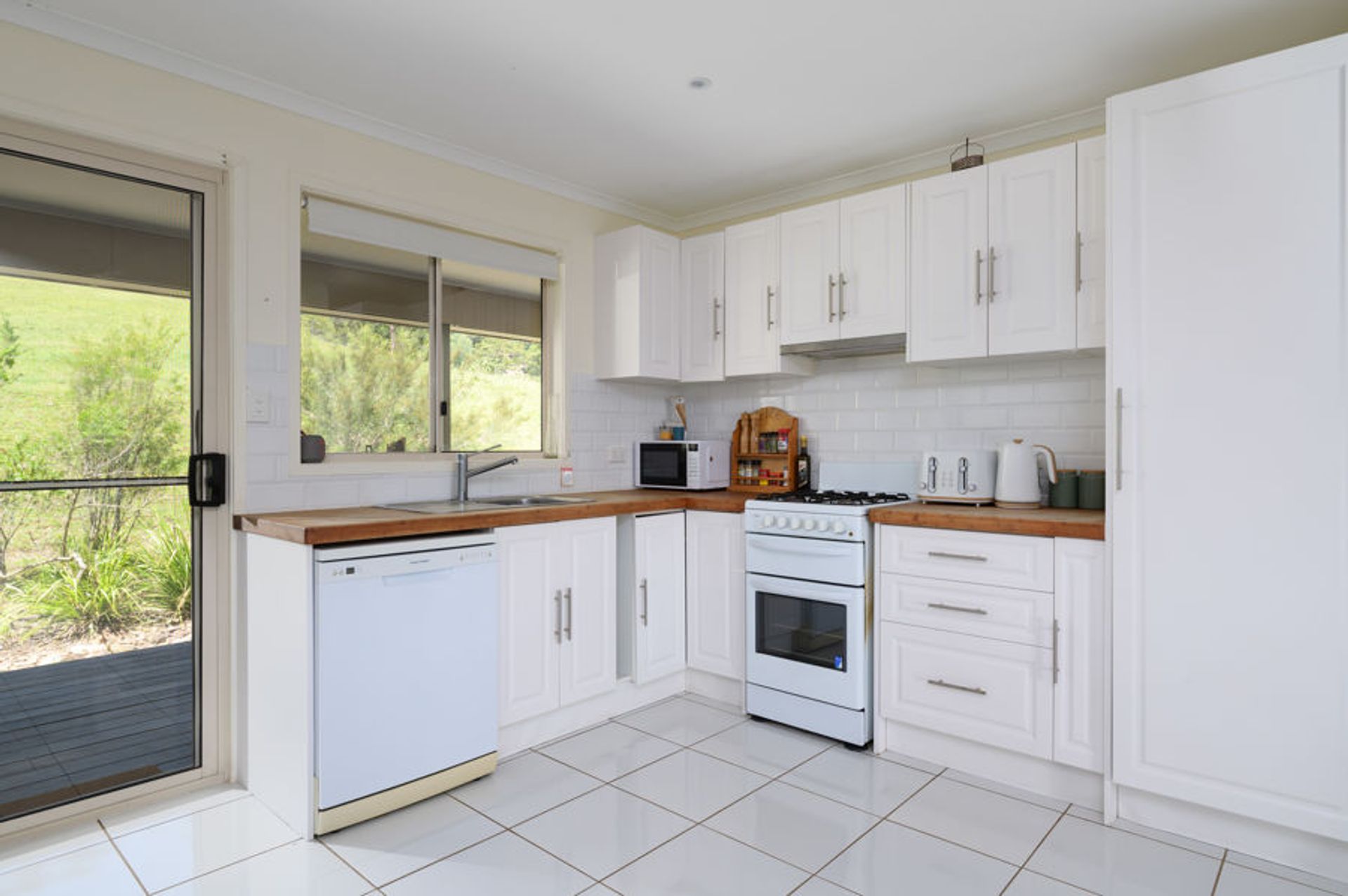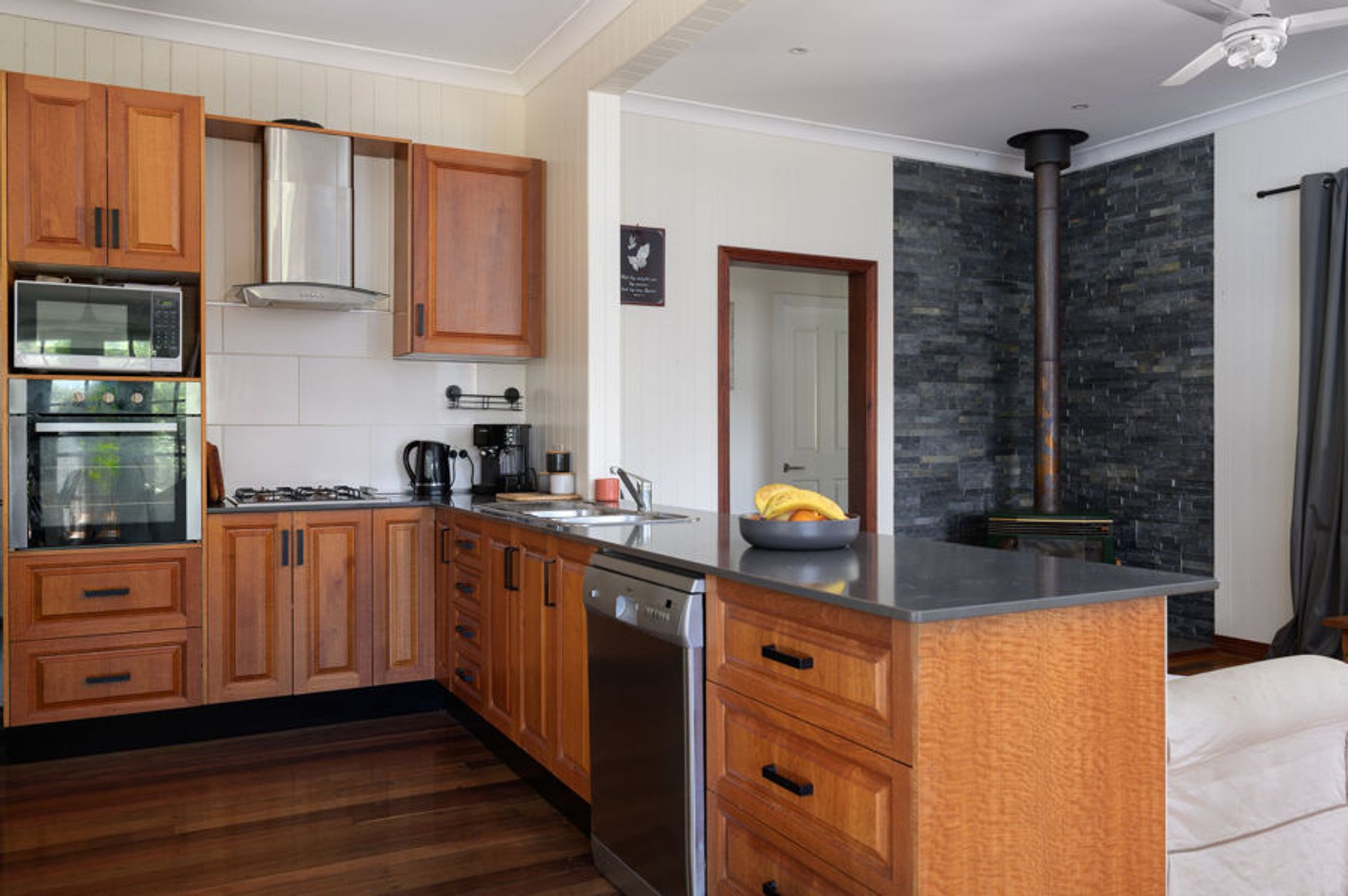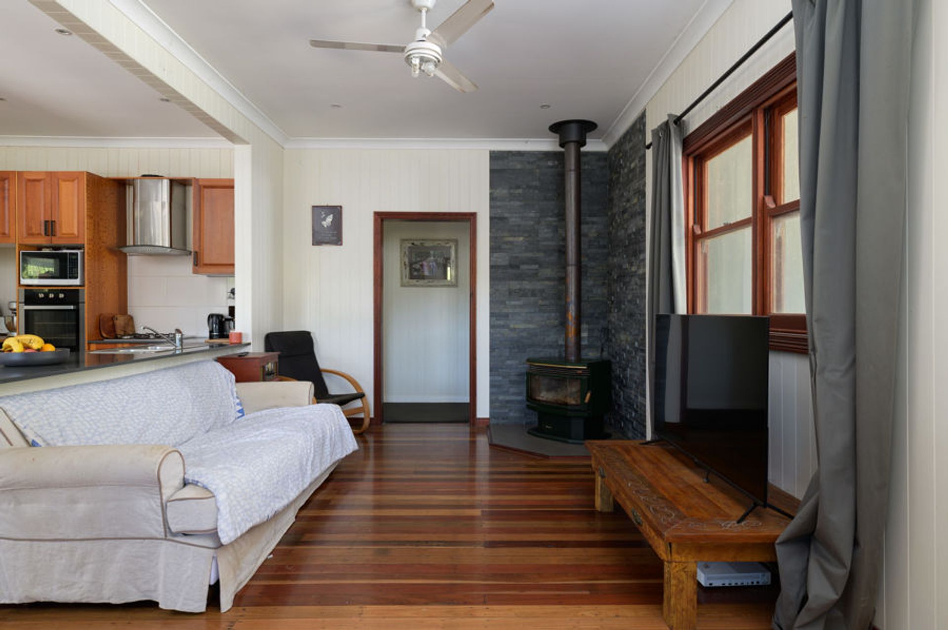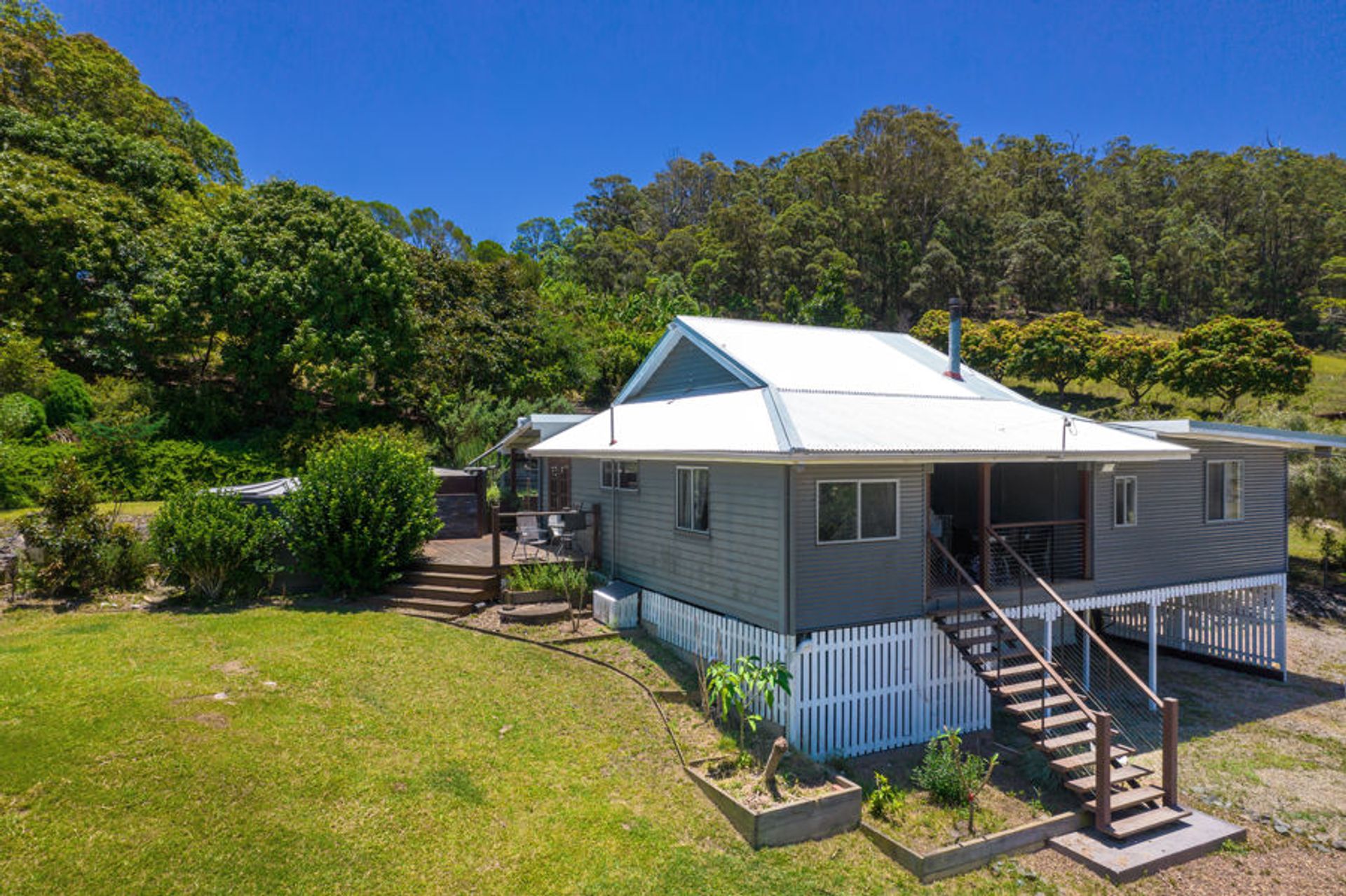 The main home is a modest, modern Queenslander consisting of 4 bedrooms and 2 bathrooms. The front is high to accommodate the car, whilst the rear is at ground level with large covered patio, and open sun deck on the Southern side. The timber kitchen will cater for the hungry hoardes that will flock to the idyllic surrounds. Just up the slope is a large, covered entertaining area for those balmy Summer evenings.