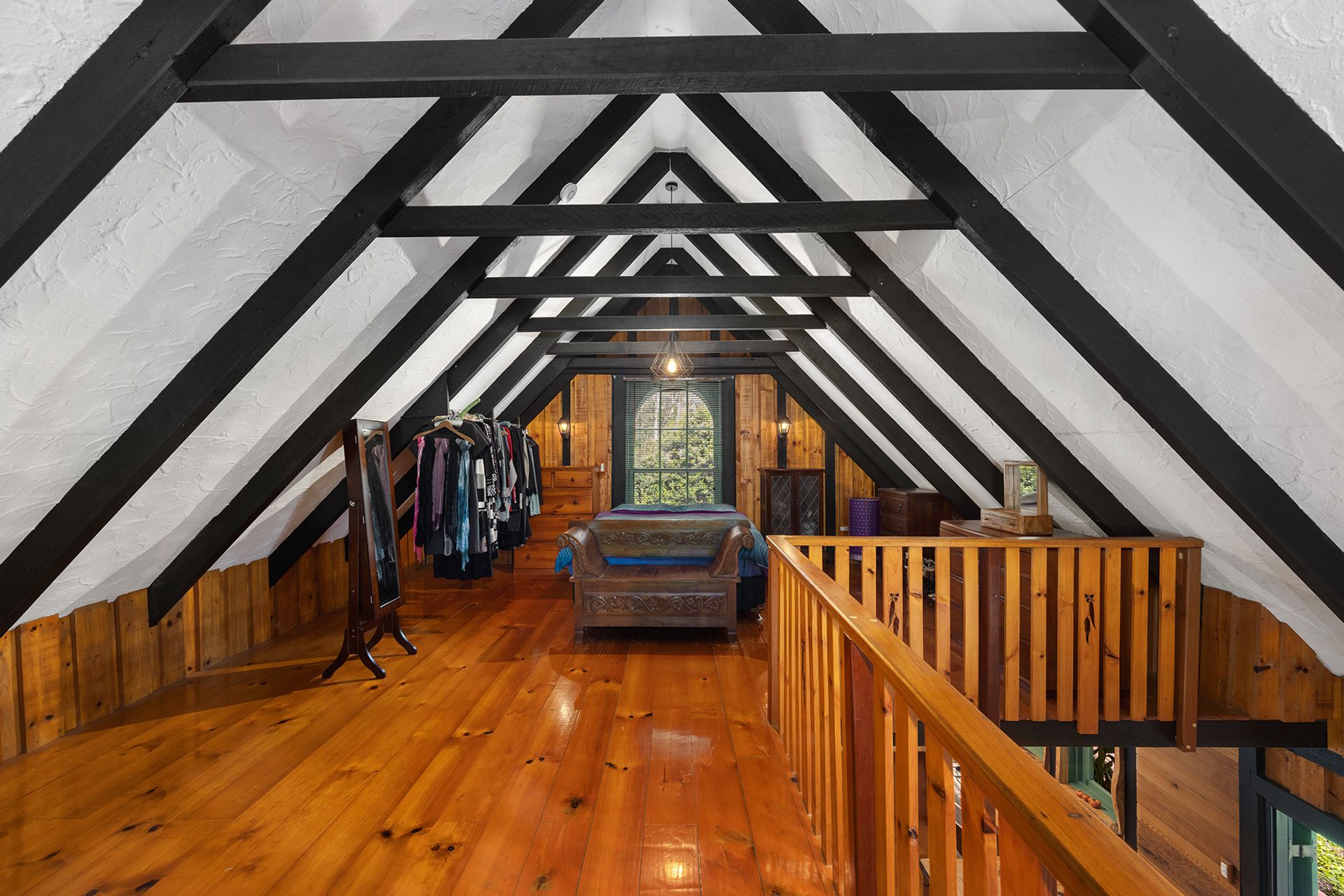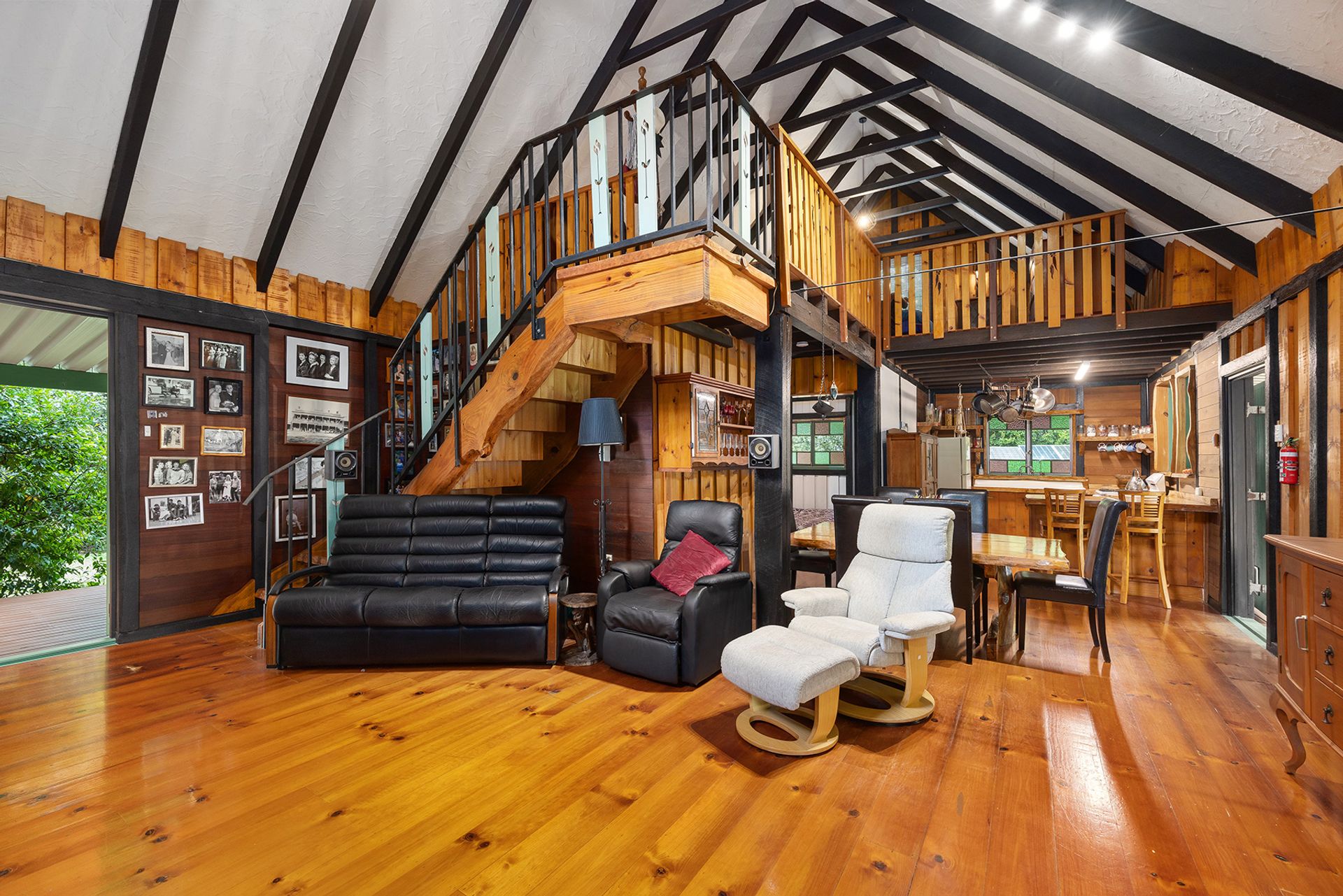 The main level centres around an open plan living space, including a combustion fireplace perfect for cosy winter evenings and a country-style kitchen with hoop pine benches and gas cooking. It also includes the guest bedroom and a bathroom with clawfoot tub. A mezzanine level is home to the loft-style main bedroom, where you'll also have ample space for a sitting area or study nook.