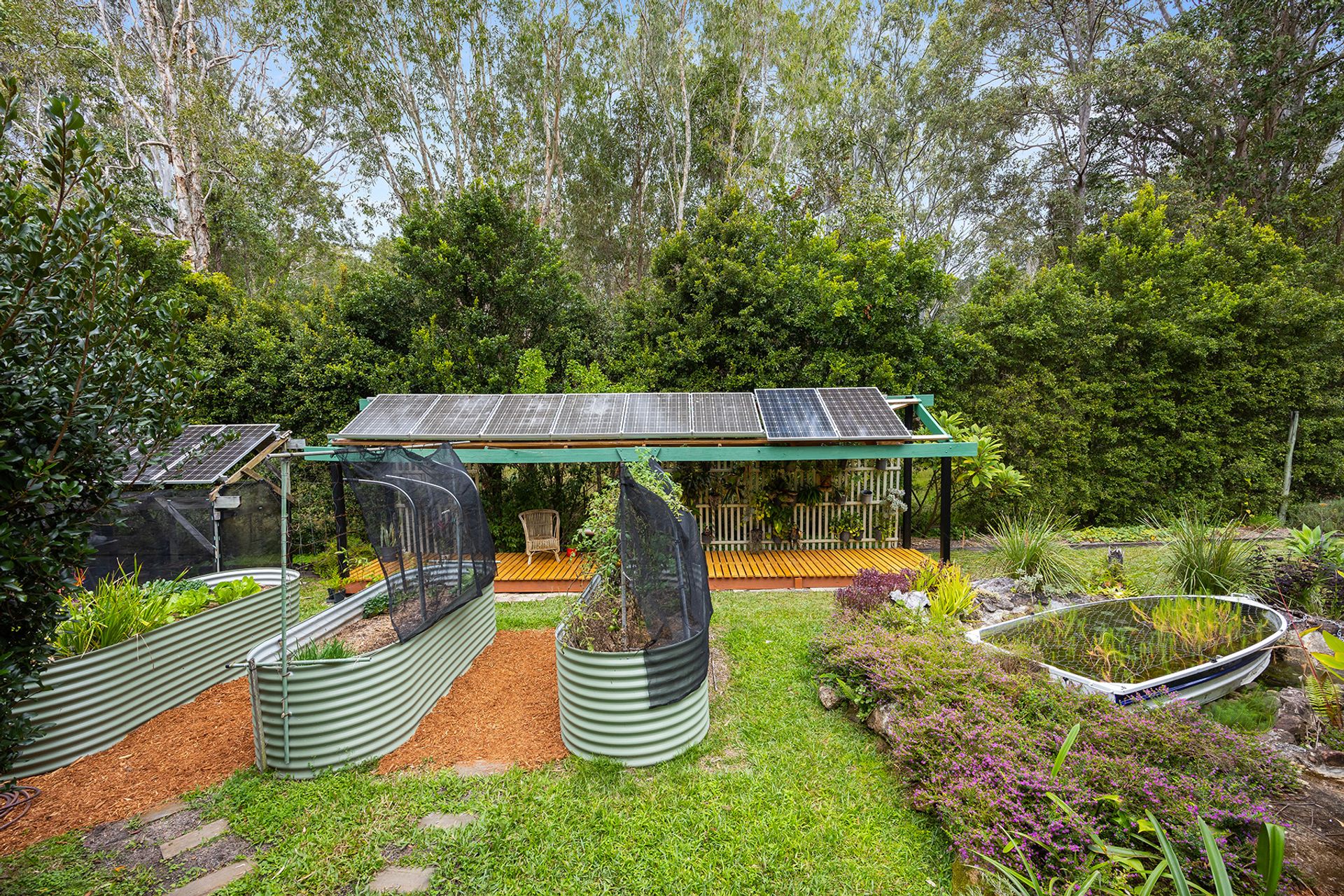 • Veggie gardens, fruit trees, fish pond, 3 x carports