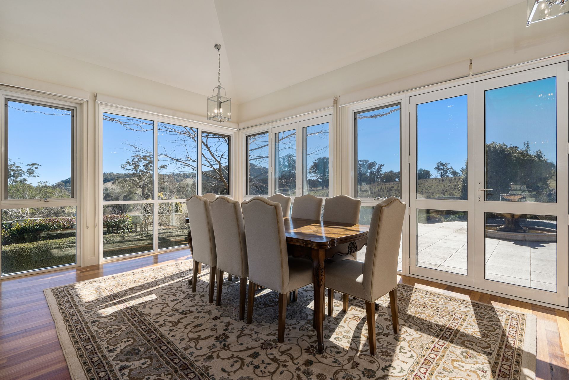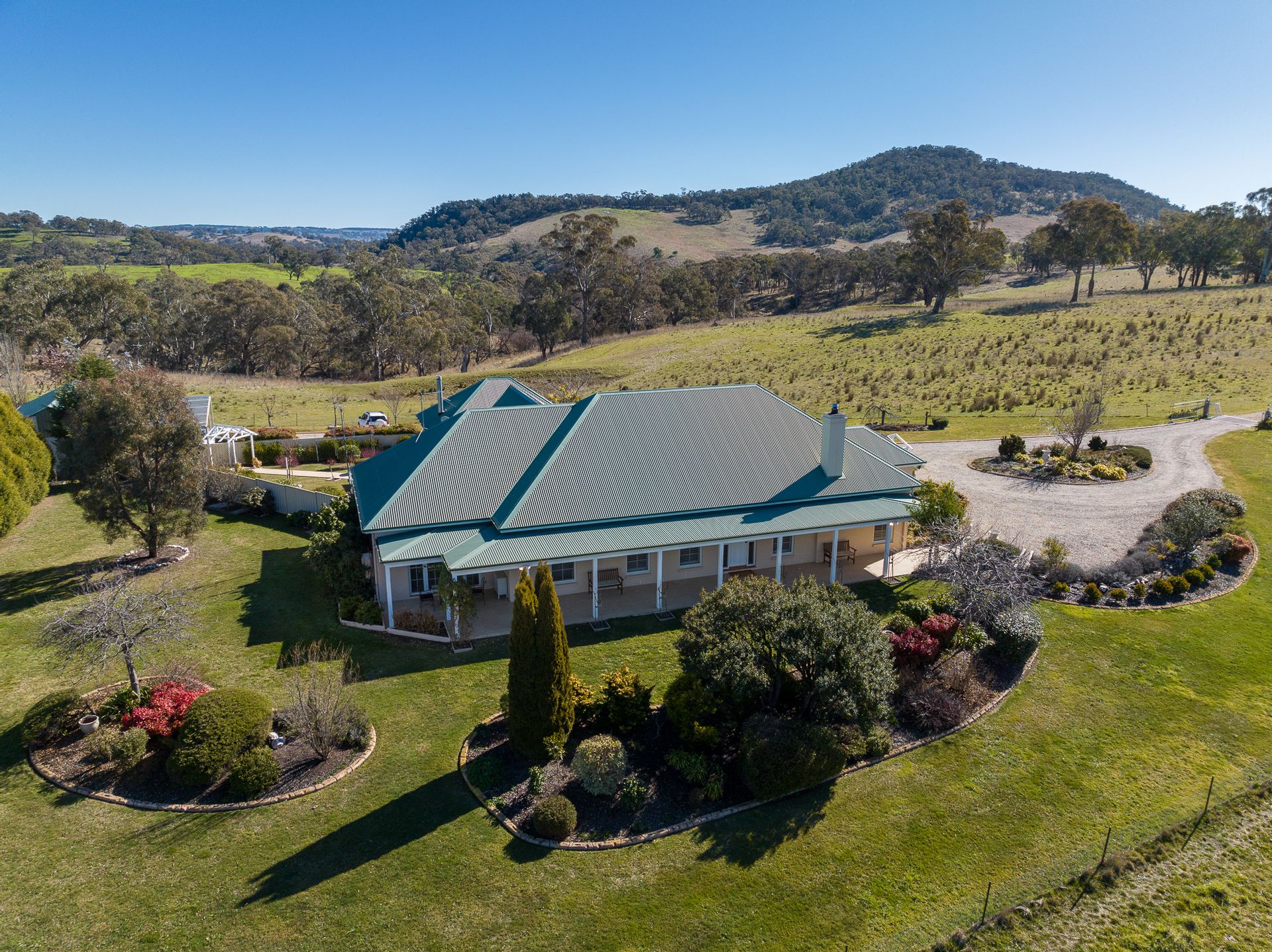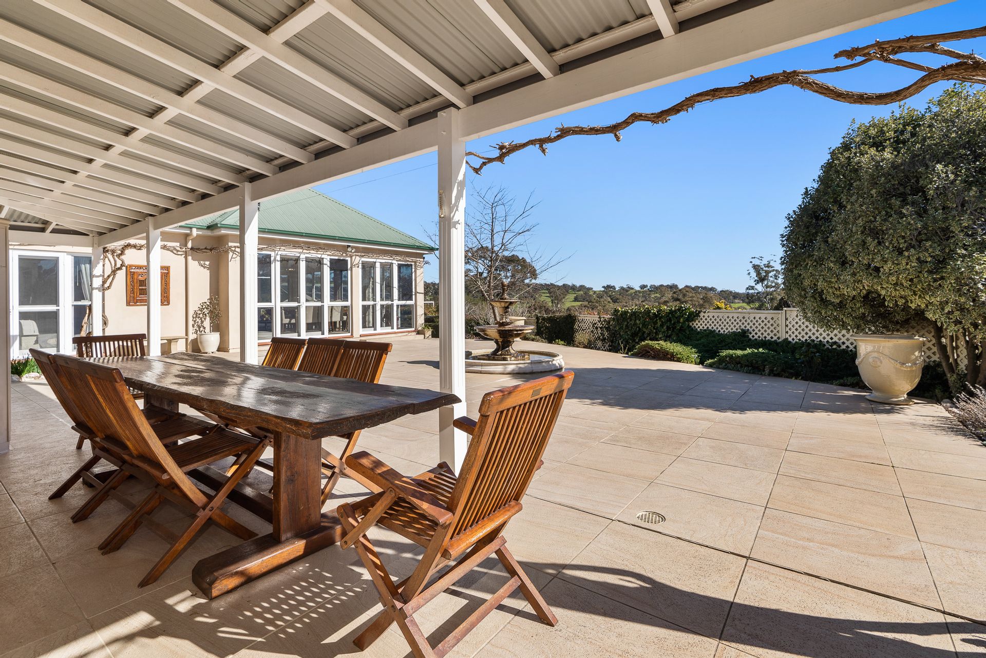 • A large, paved courtyard features a fountain, captures the winter sun, and offers expansive views of Mount Stromlo and the surrounding countryside.