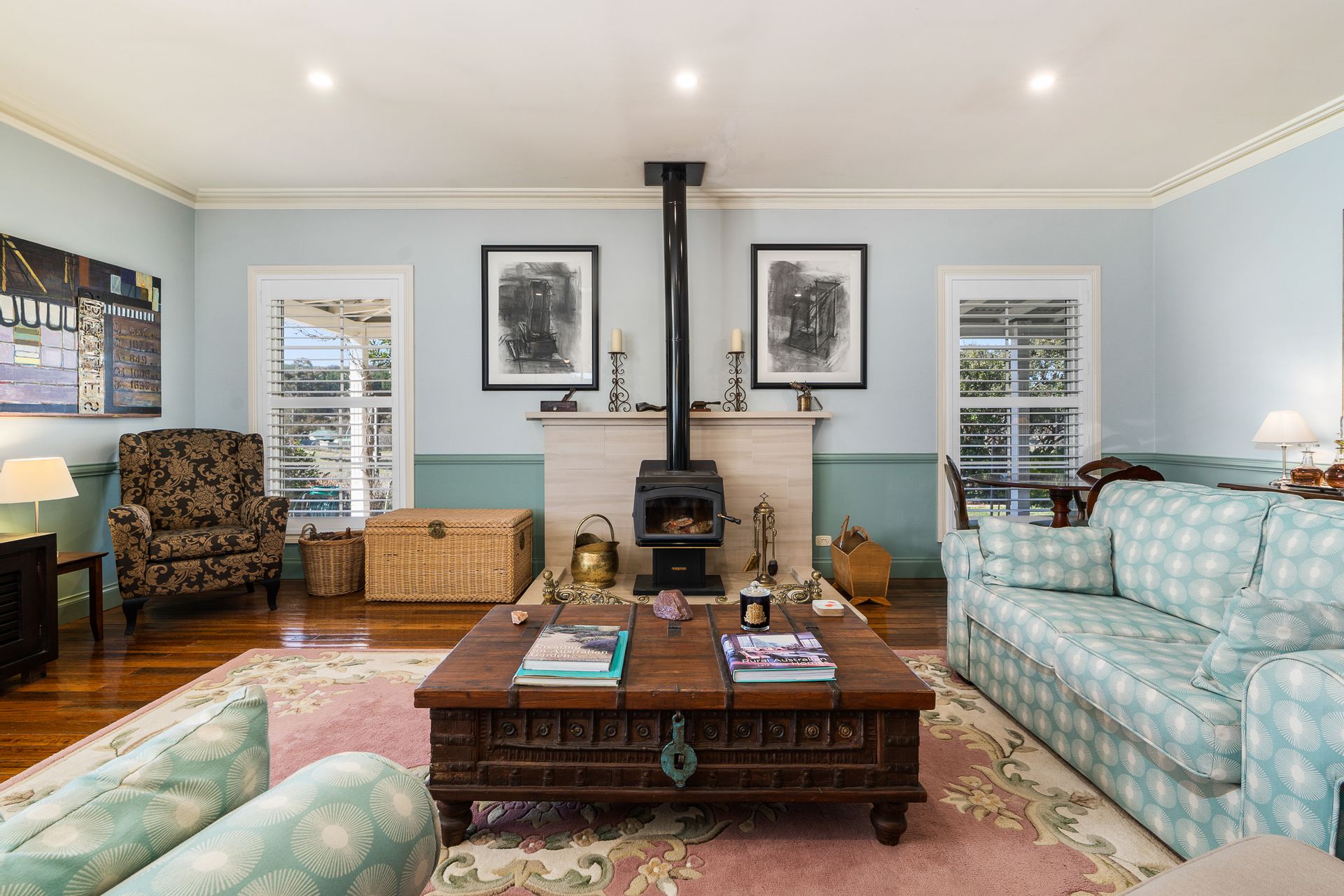 • Temperature control is a breeze as the home features 2 combustion wood heaters, insulation batts in the ceiling as well as sarking, reverse cycle aircon in the kitchen/living area and much of the house benefits from under floor heating.