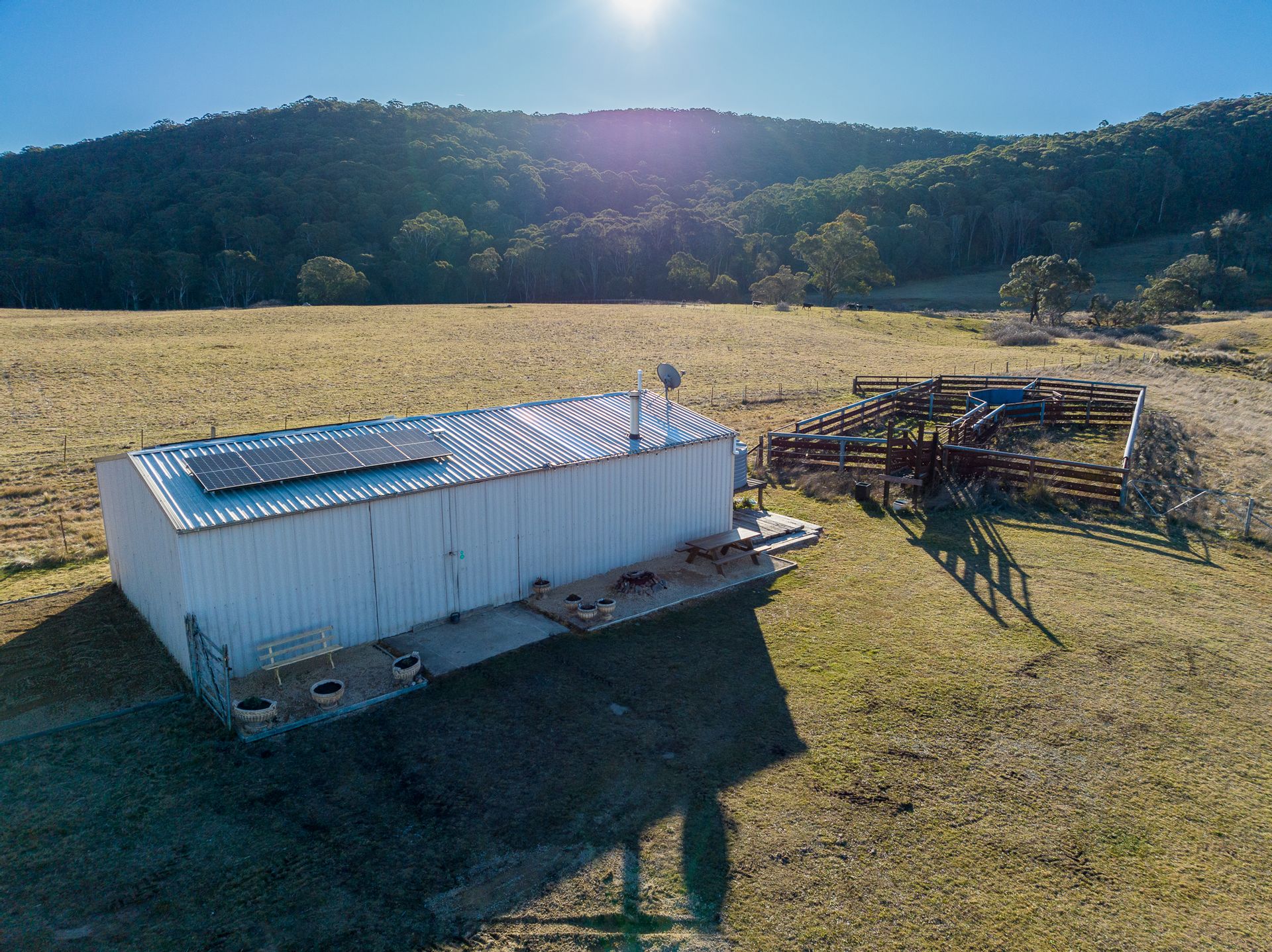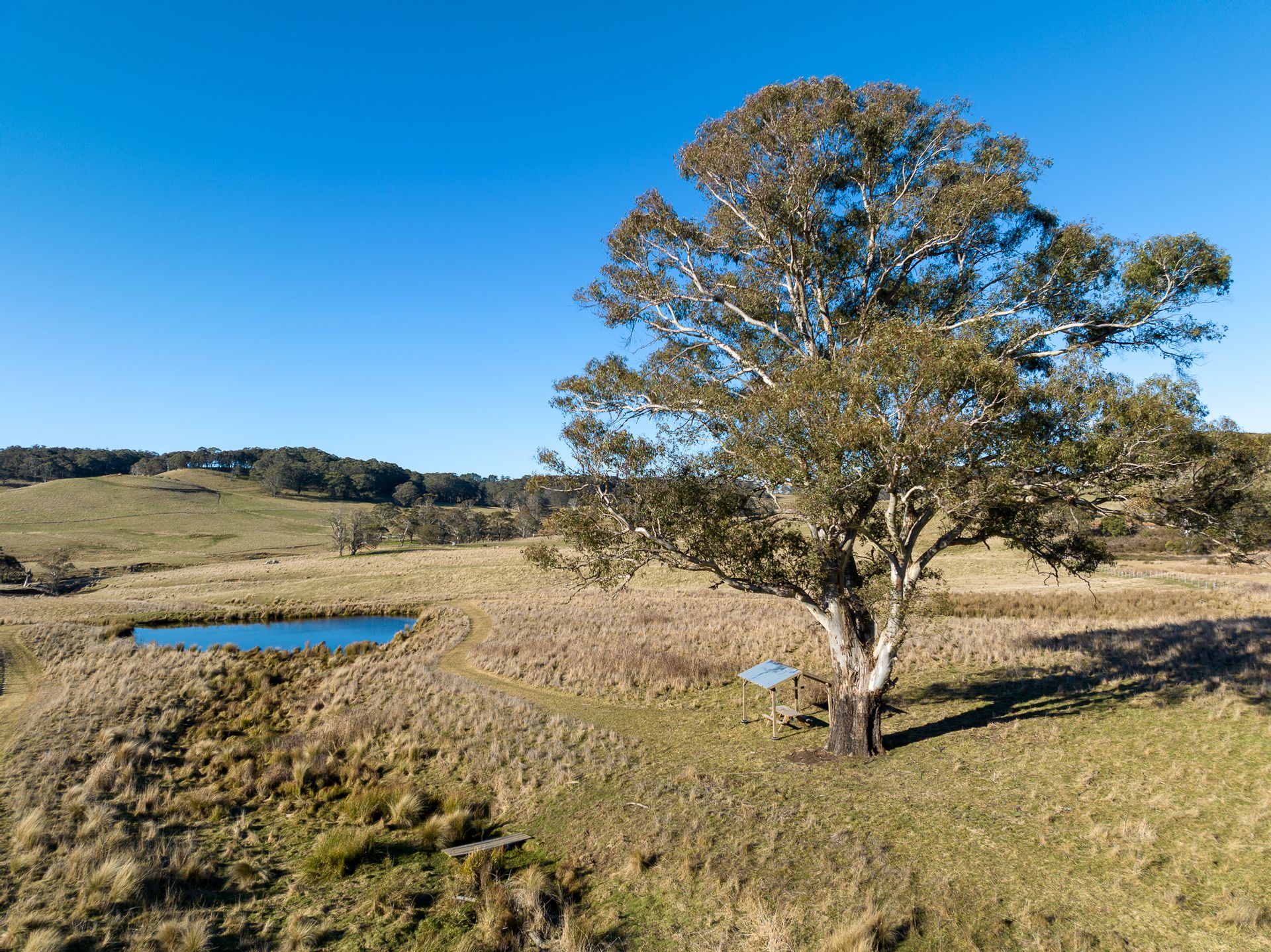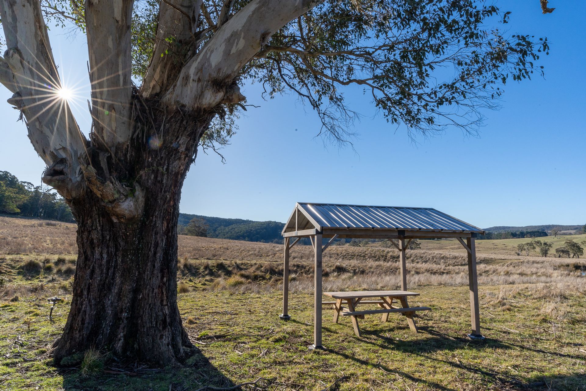 • A picnic shelter and table has been located in a position to take advantage of views of a nearby dam and stunning rural scenery.