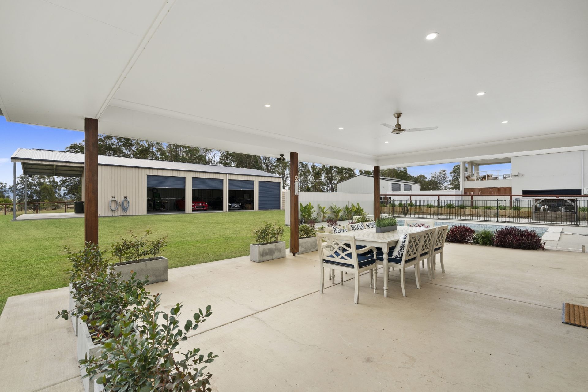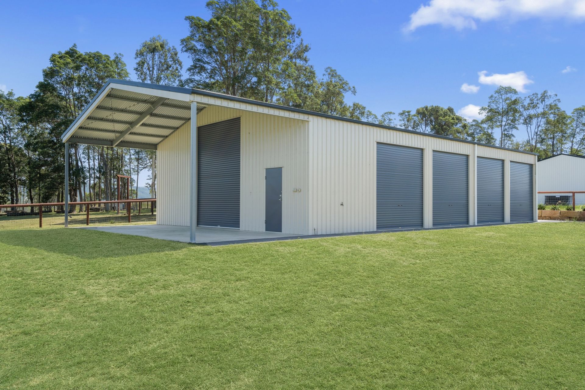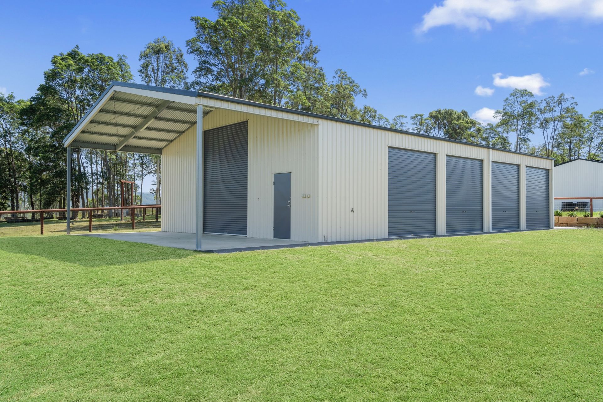- 21m x 10m x 4m high shed with 4 roller doors across the front and an extra high roller at the van/ boat port