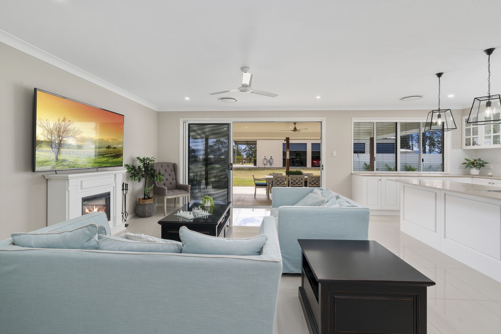 - family room, dining and kitchen are all in the one connected area with views to the front and rear of the property creating
