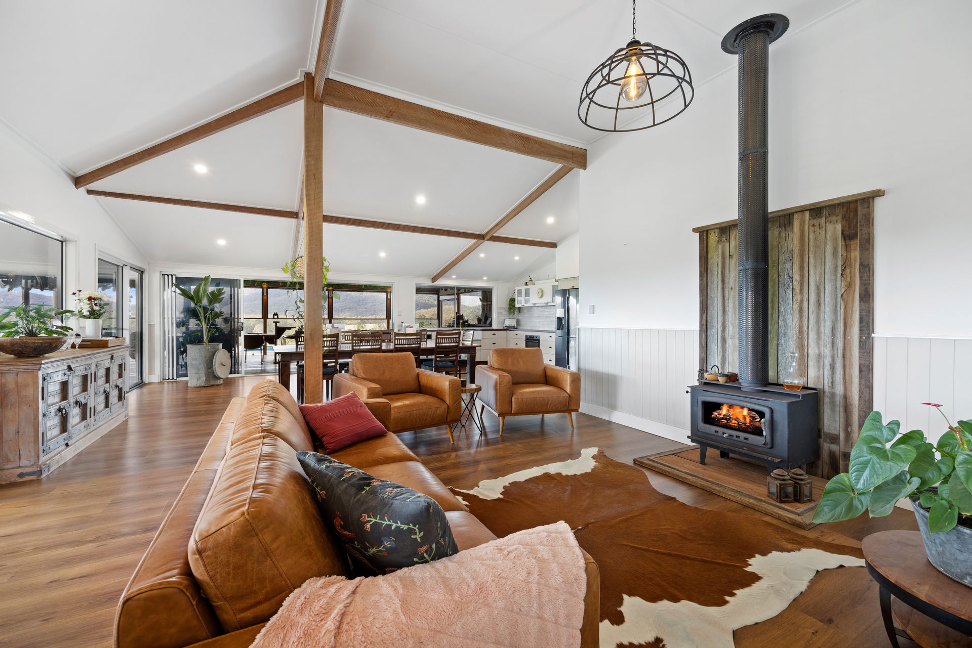 Inside the main home, discover high ceilings adorned with exposed beams, a chef's dream kitchen, and a wood fire in the open plan living and dining area. The property offers a total of 4 bedrooms and 2 bathrooms, including a well-separated cottage with 2 bedrooms and 1 bathroom-a private haven for extended family, visitors, or potential rental income.
