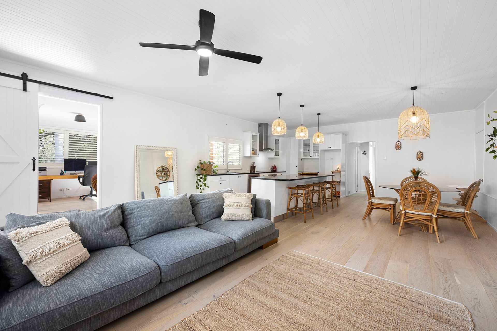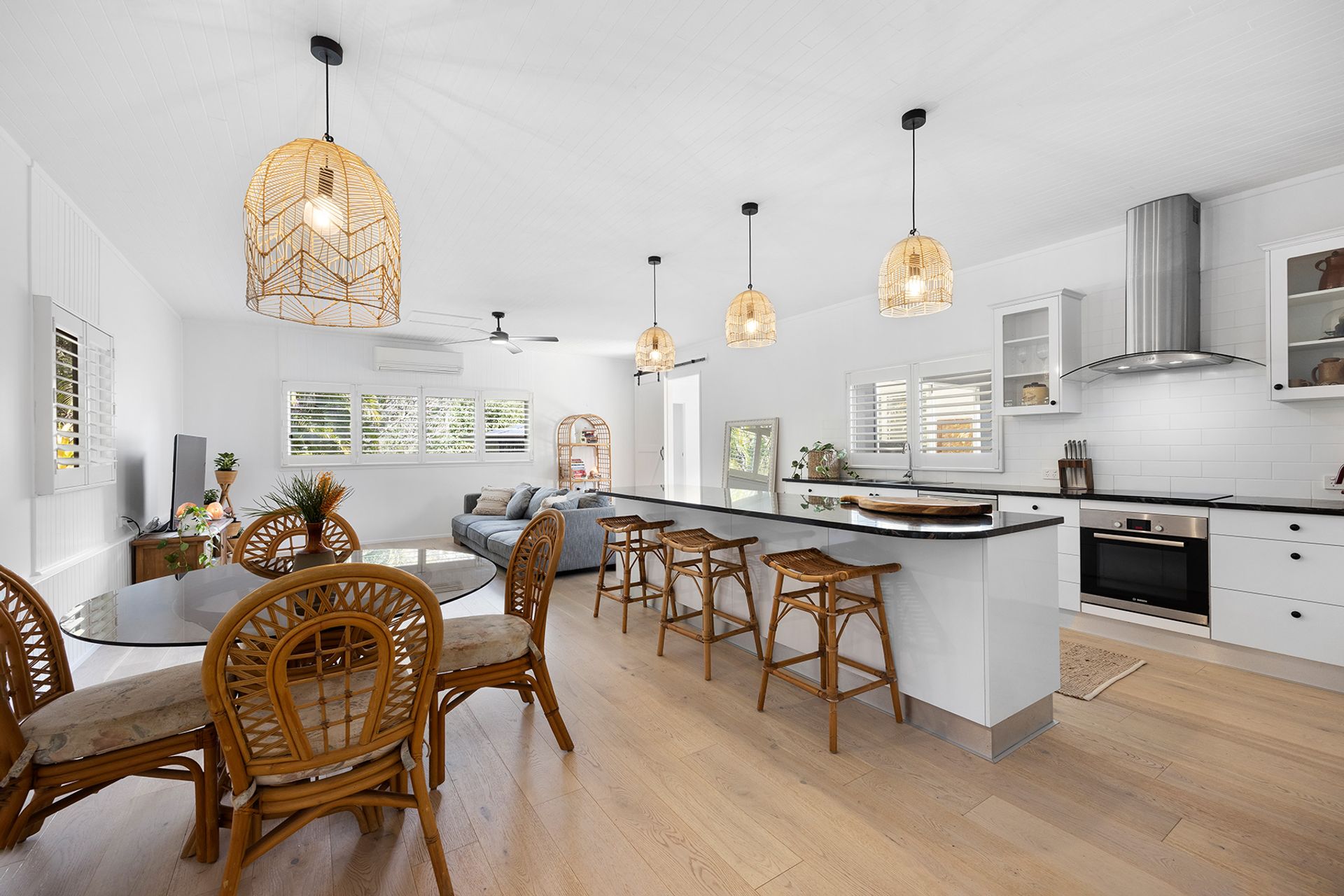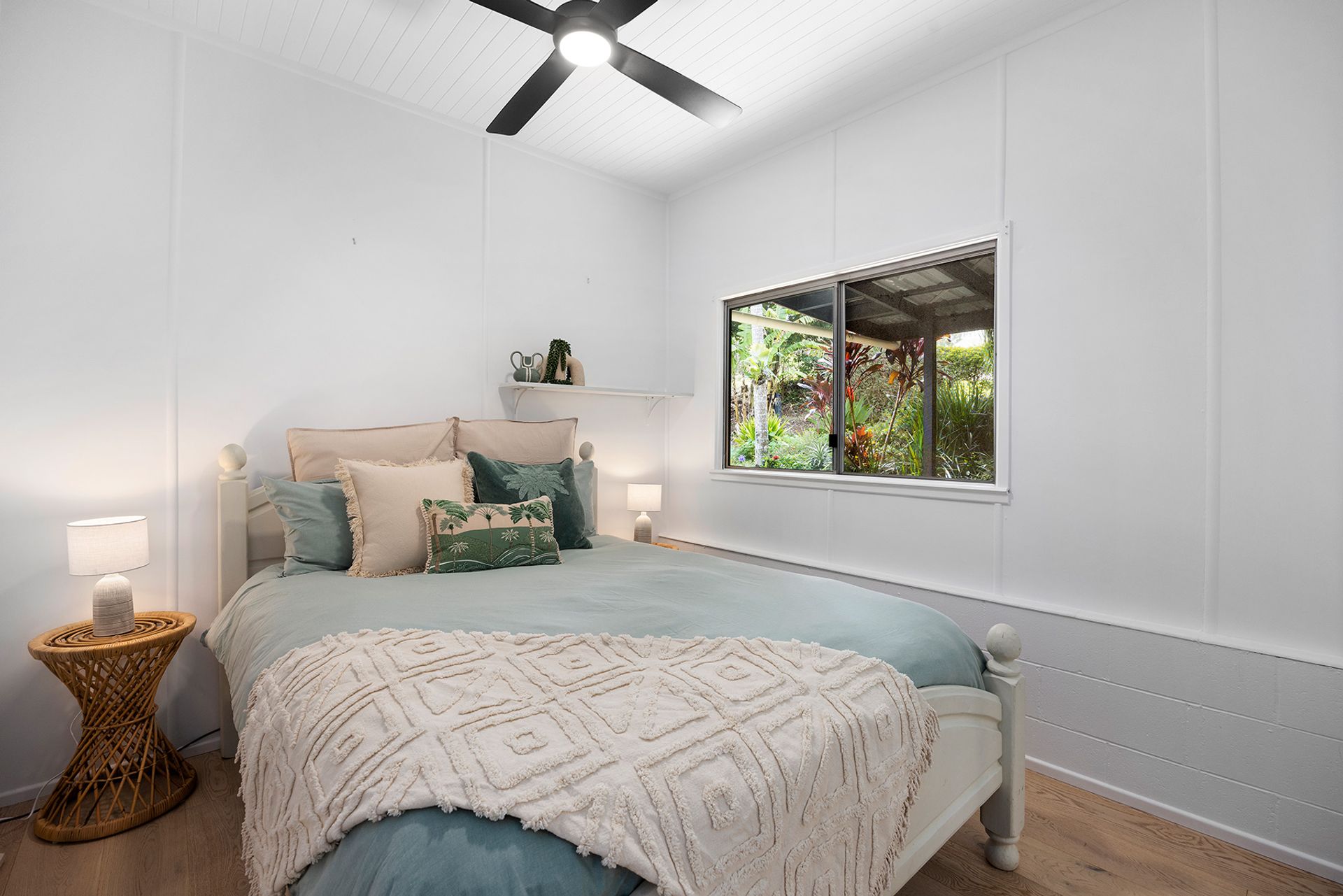 • Plantation shutters, ceiling fans, crisp white paint