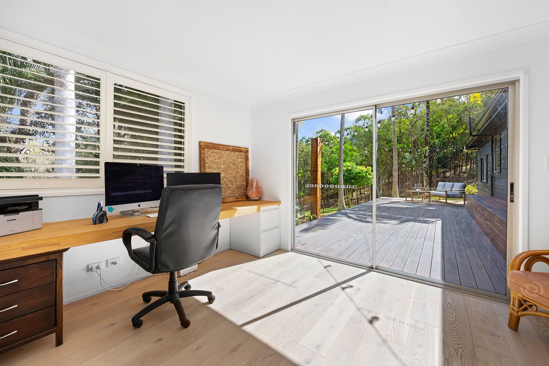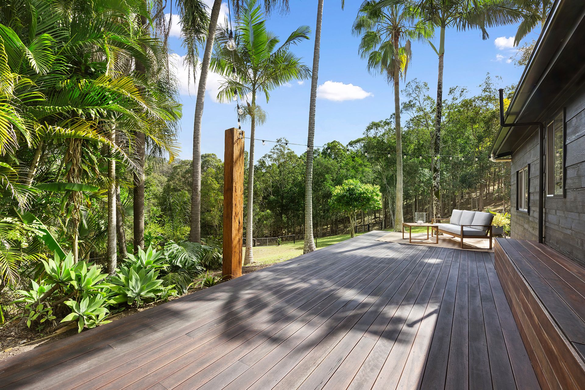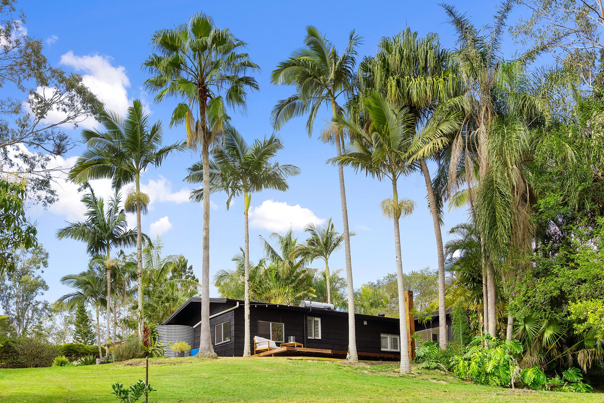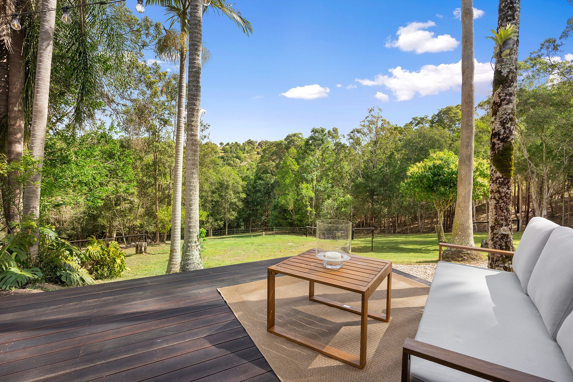 A tree-lined drive leads to the main residence, where crisp white finishes, ample light and natural textures create a bright, welcoming ambience. Enjoy entertaining? The centrepiece of the air-conditioned open plan living space is a stunning contemporary kitchen, complete with stone benchtops , stainless steel appliances, and an extra-long island bench/breakfast bar. Or choose from three outdoor living spaces: a private north-easterly facing covered patio set amongst lush tropical landscaping, an elevated deck with an outlook over the paddocks to the trees, or a separate rotunda positioned to capitalise on tranquil views across the grounds.