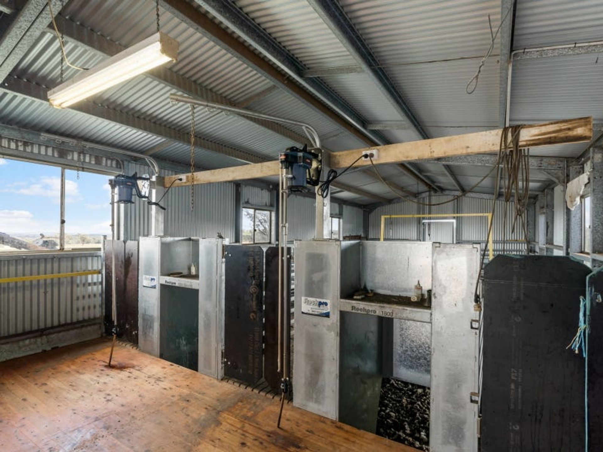 - The powered 28 x 6* metre lockable workshop and shearing shed has a concrete floor in one end and 2 shearing modules installed in the other end along with good sheep storage and herringbone plastic flooring, plus a skillion to one side for extra storage.