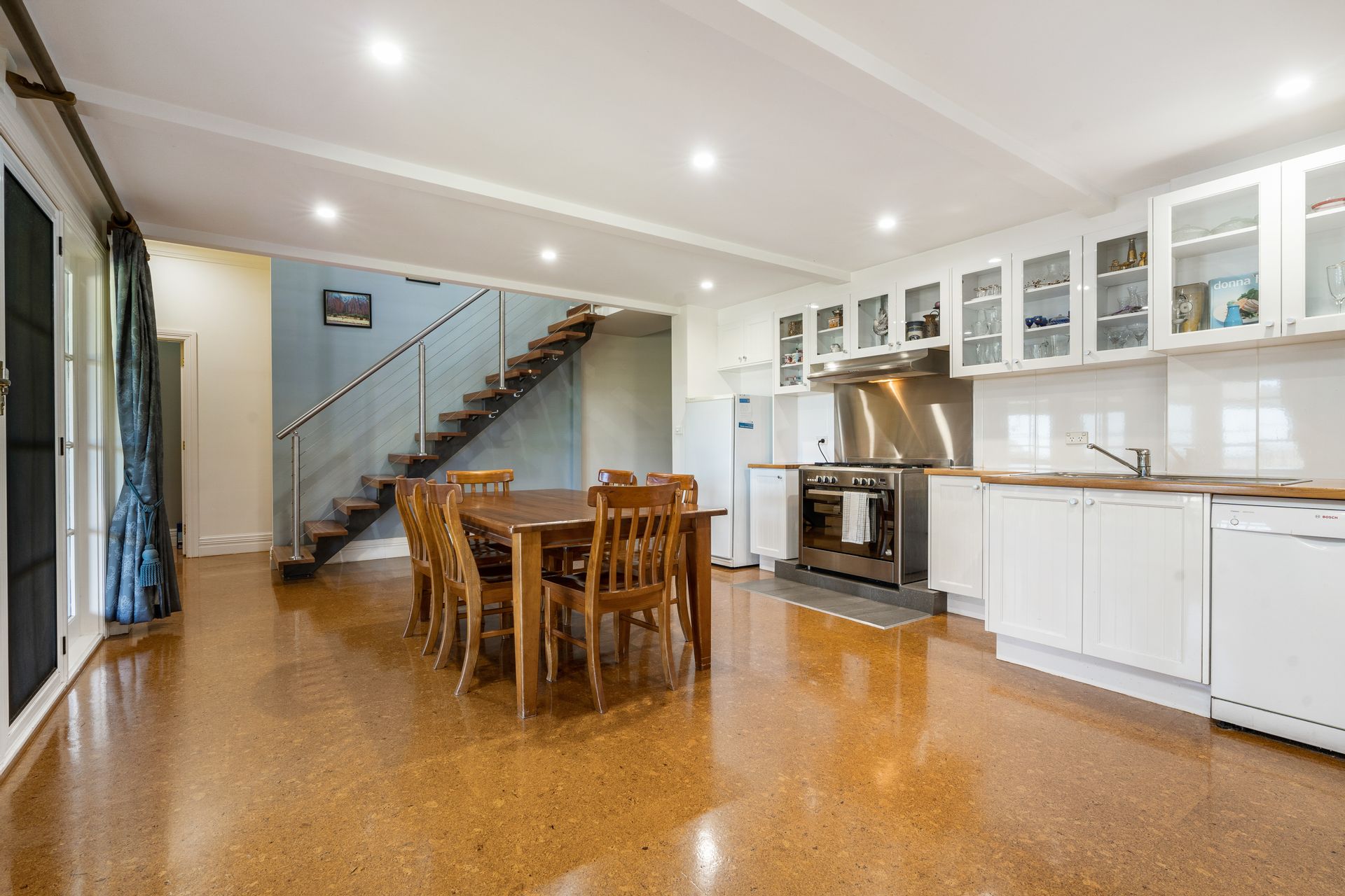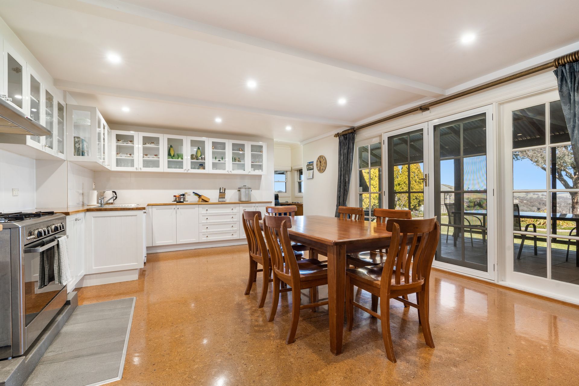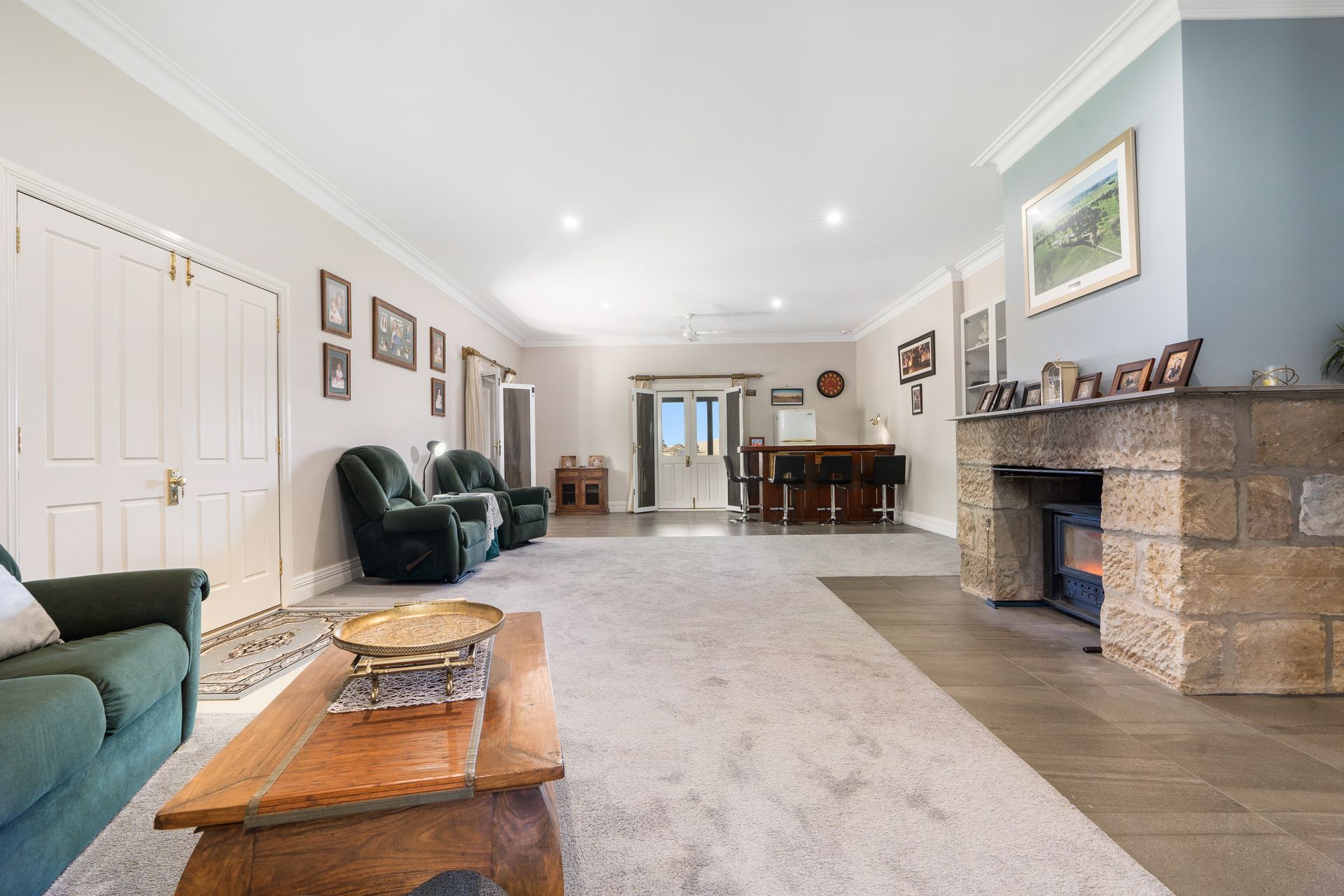• High ceilings, large country kitchen with walk-in pantry connects to a cozy family room with a wood heater.