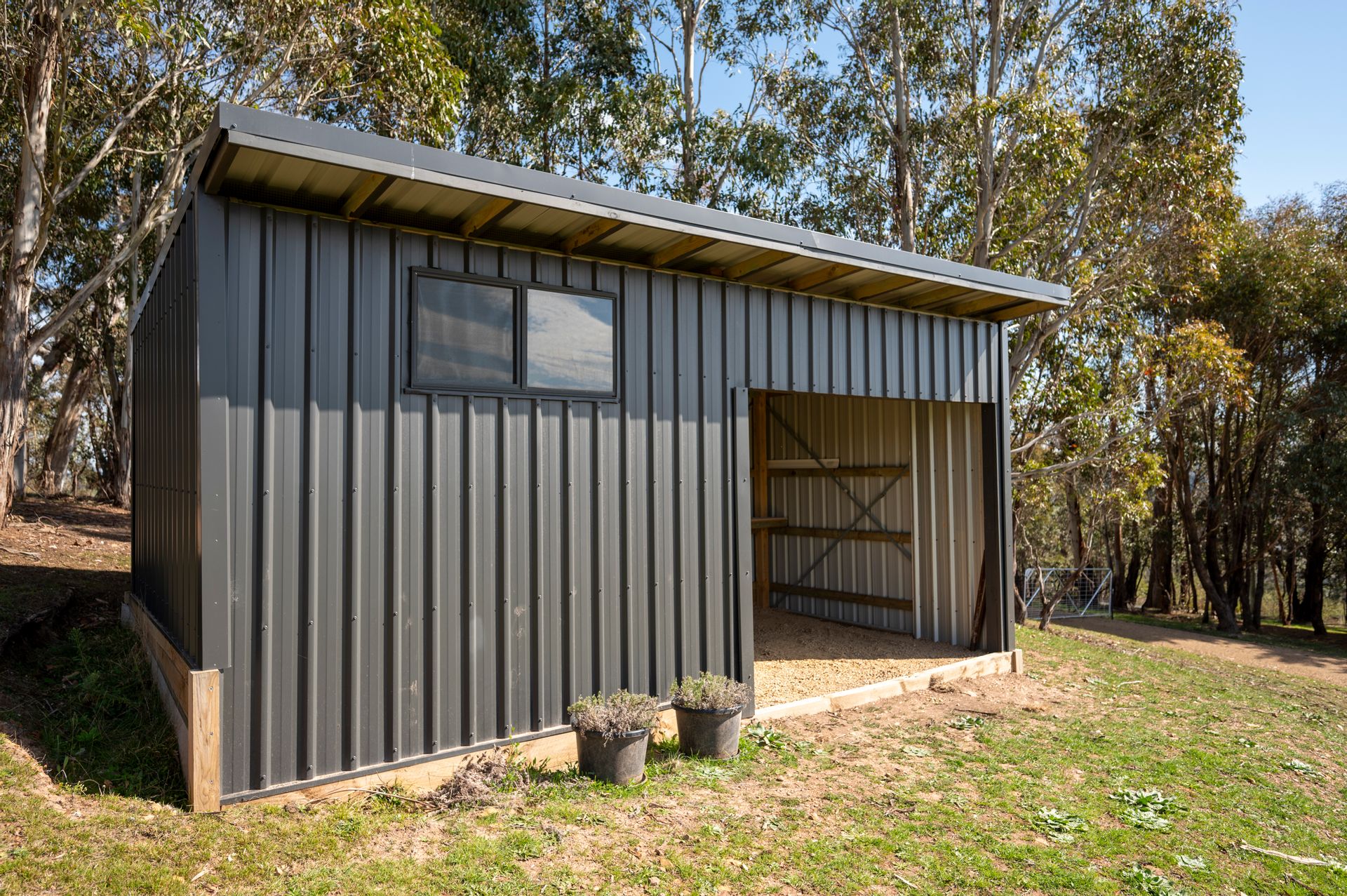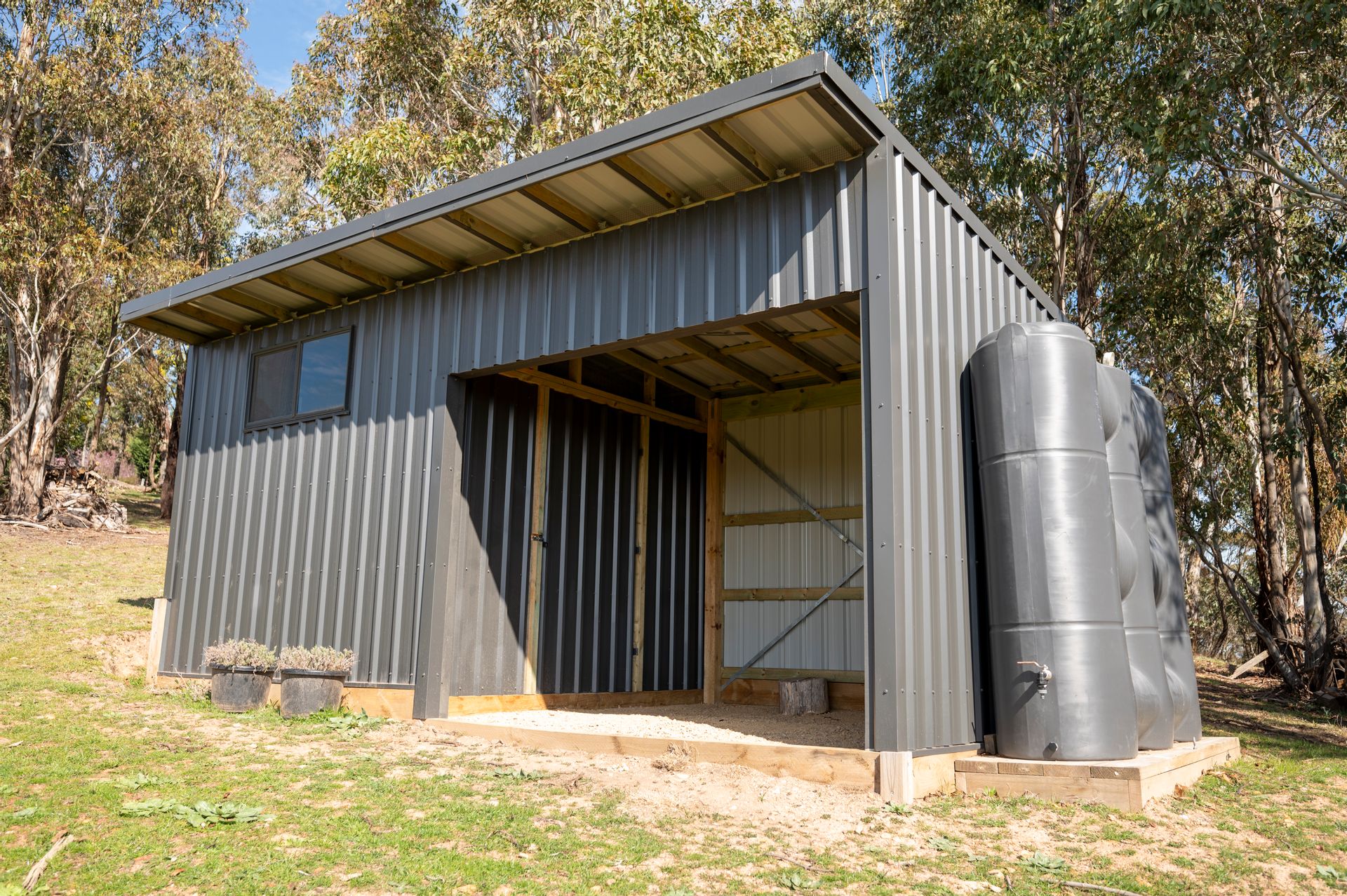 - Colourbond lock-up shed, six metres x 3 metres ready for woodshed or animal shelter with 2,000* litre water storage, one part lockable
