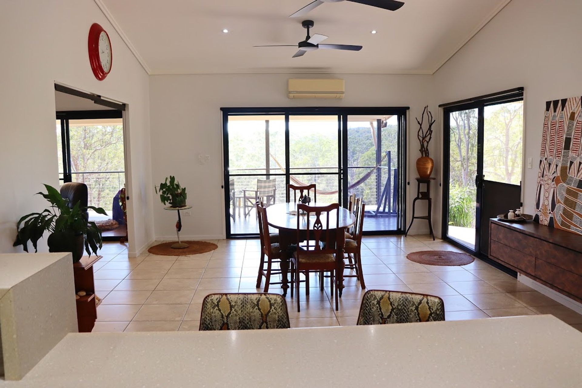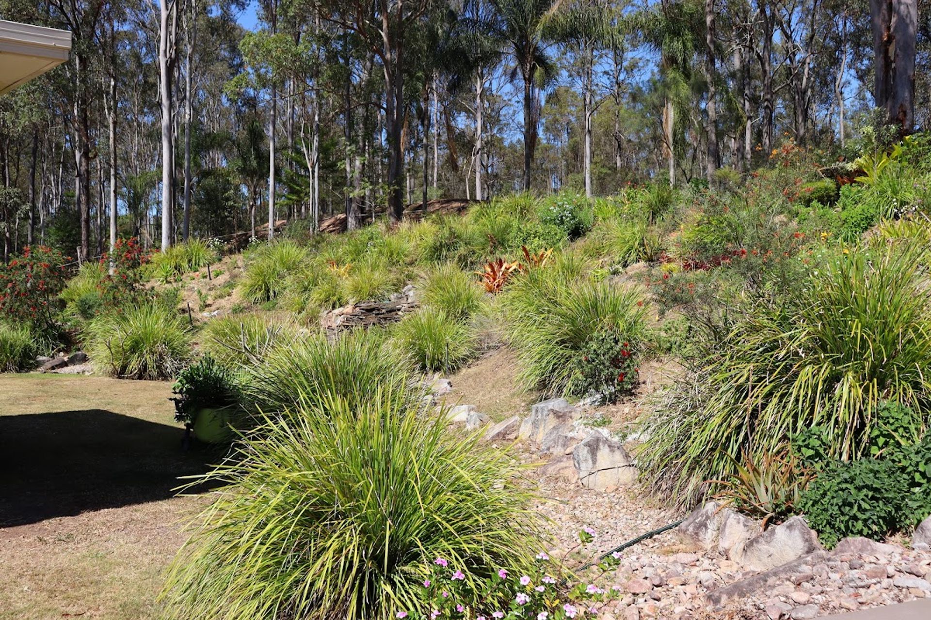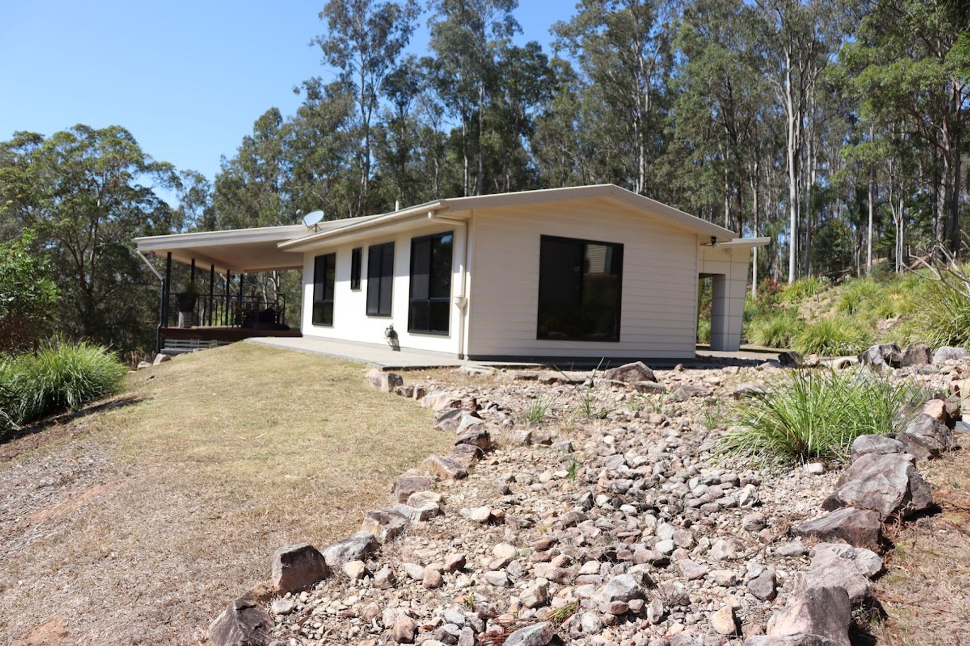 11m x 4m covered deck to take in those views, listen to the birdlife and watch your livestock enjoying their favourite paddock. 86m2 double lock-up garage with gym and storage room plus you have 5kw of grid connect solar power. The circular concrete driveway passes around the landscaped gardens with cascading water feature and delivers you to the front entry portico with covered parking. You also have a secluded fire pit to enjoy your own bush tv.