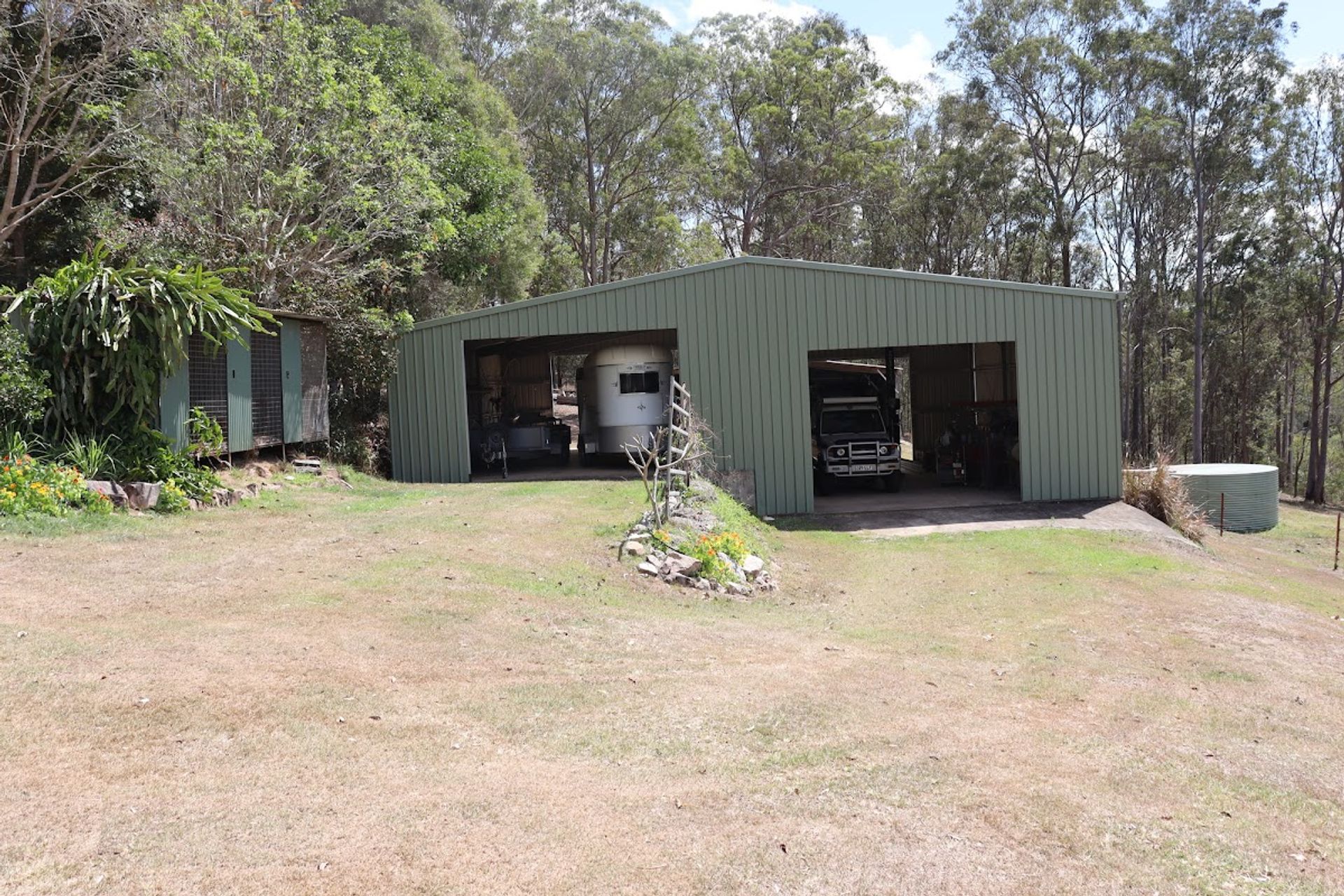 Numerous outbuildings including the 7m x 9m workshop, 14m x 10m shed with mechanics 4 tonne vehicle hoist and 15amp electricity, 8m x 9m farm shed, 3 dog kennels or chicken sheds and 2 horse shelters.